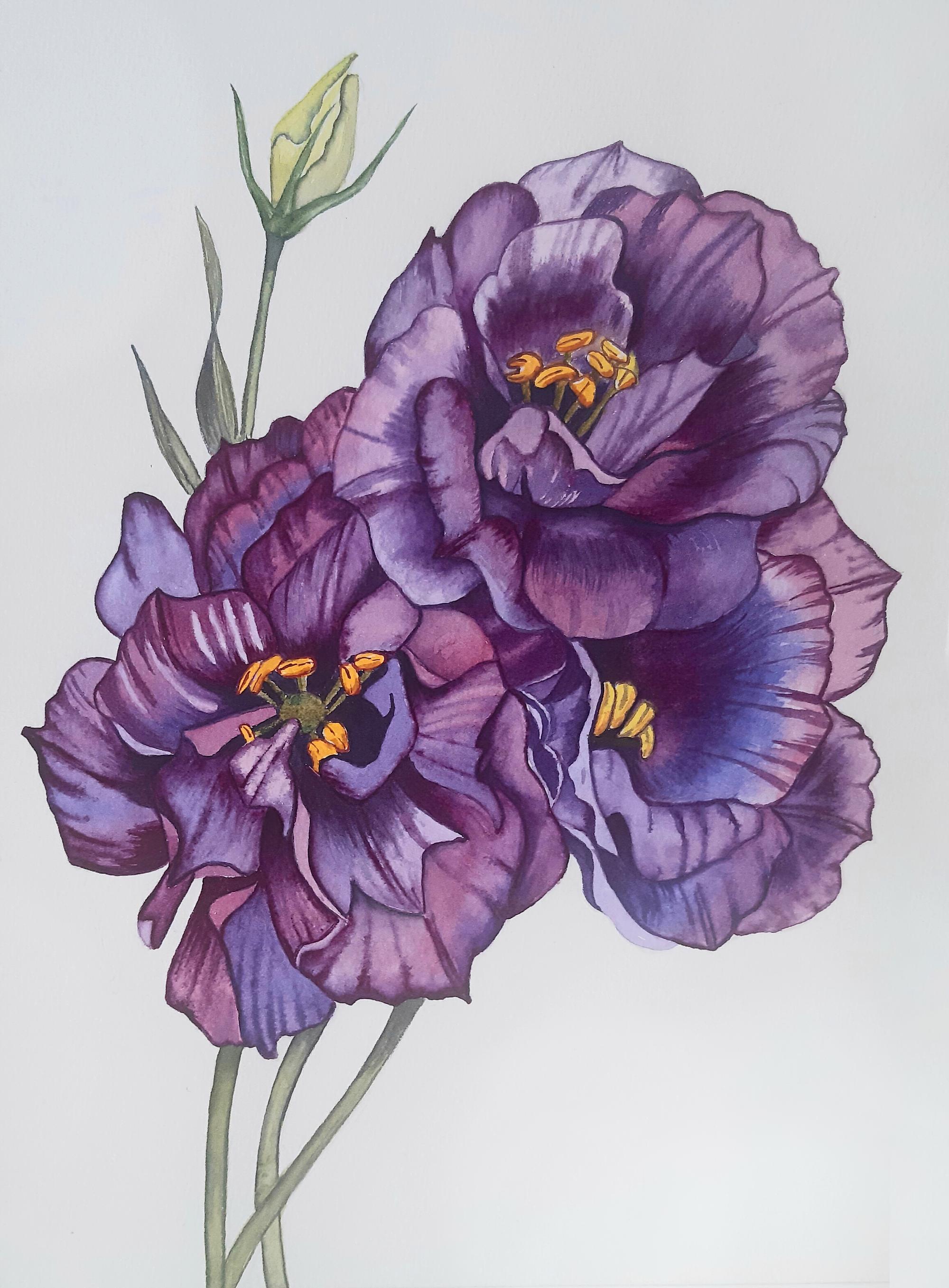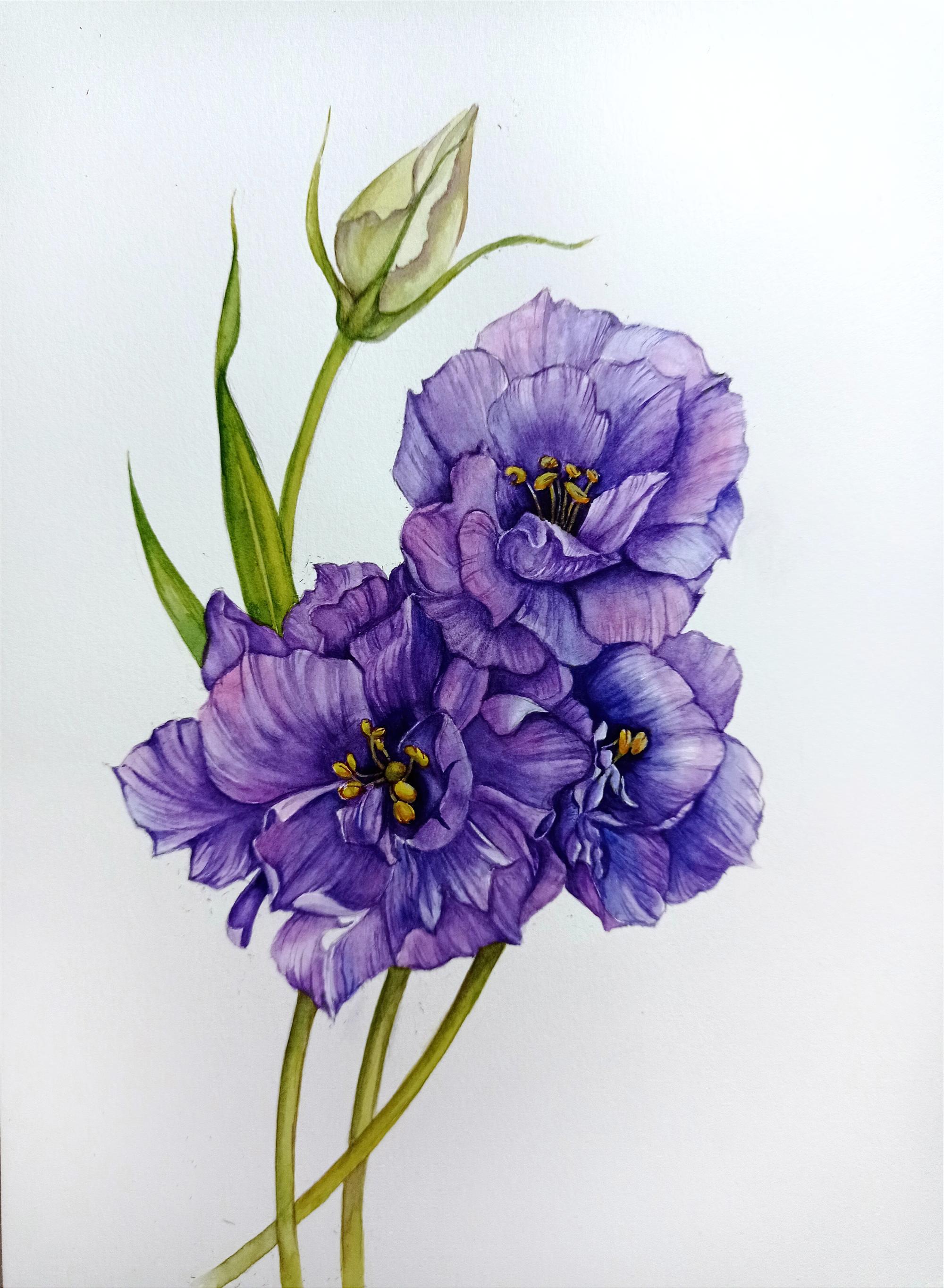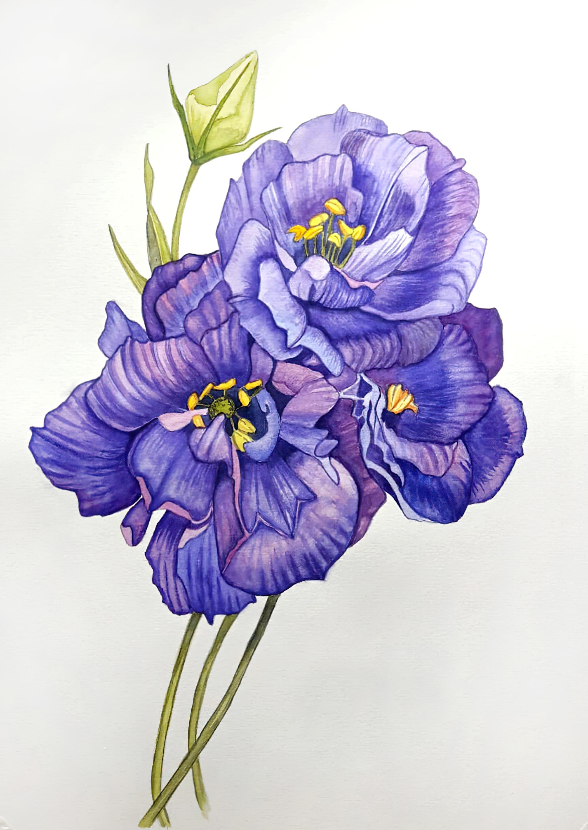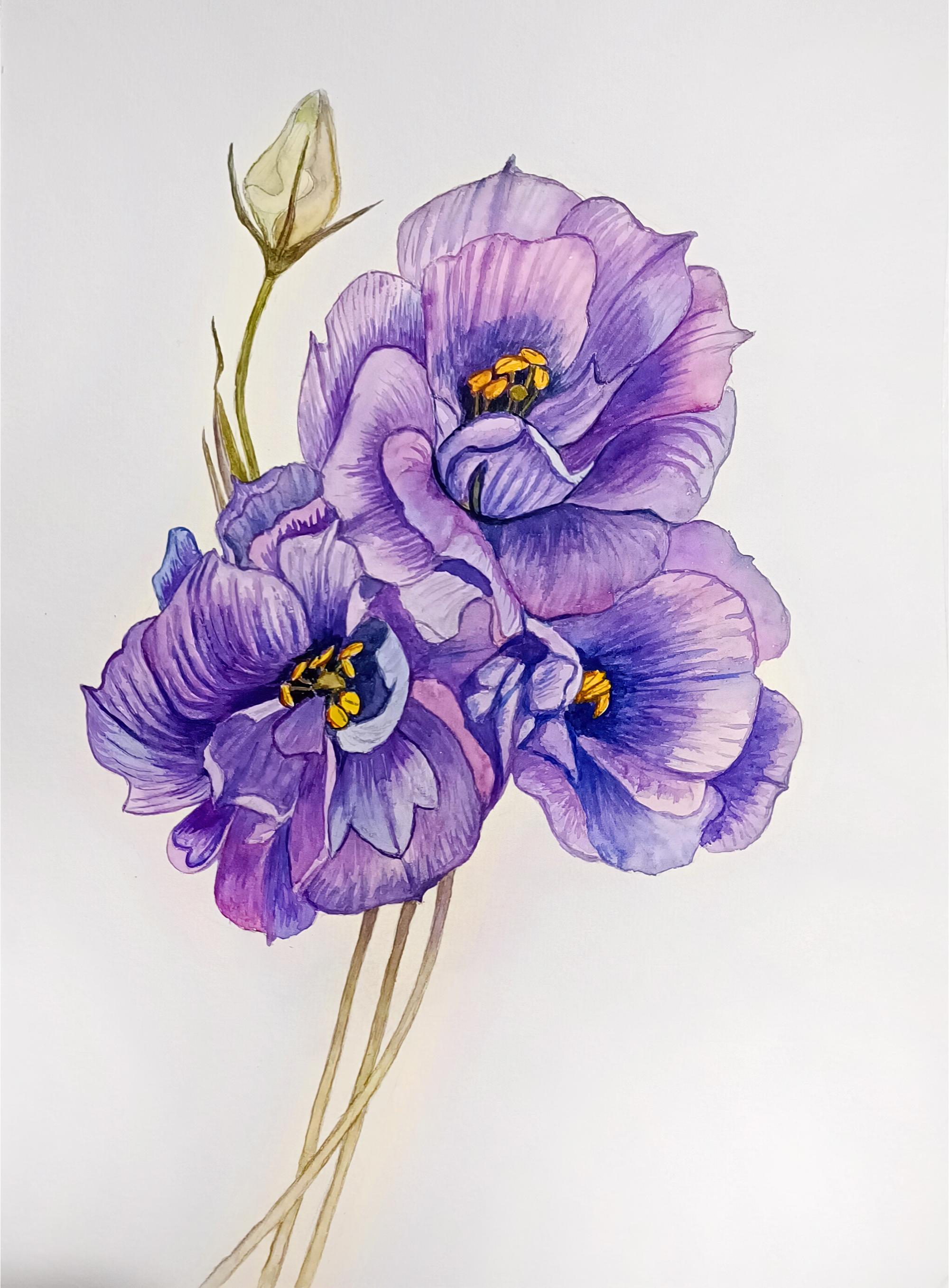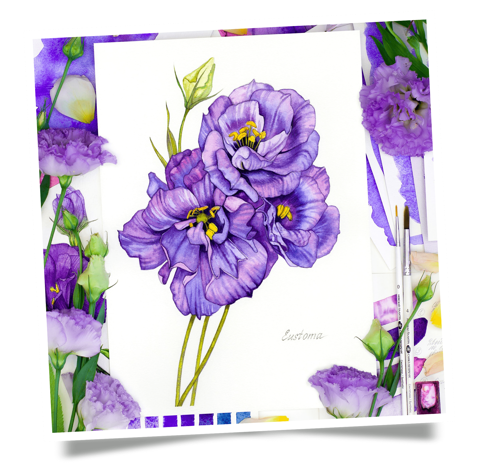 This session will complete the series of lessons dedicated to the botanical illustration of eustoma. We will enhance contrasts, clarify details on the flowers, and also paint the bud, green leaves, and stems.