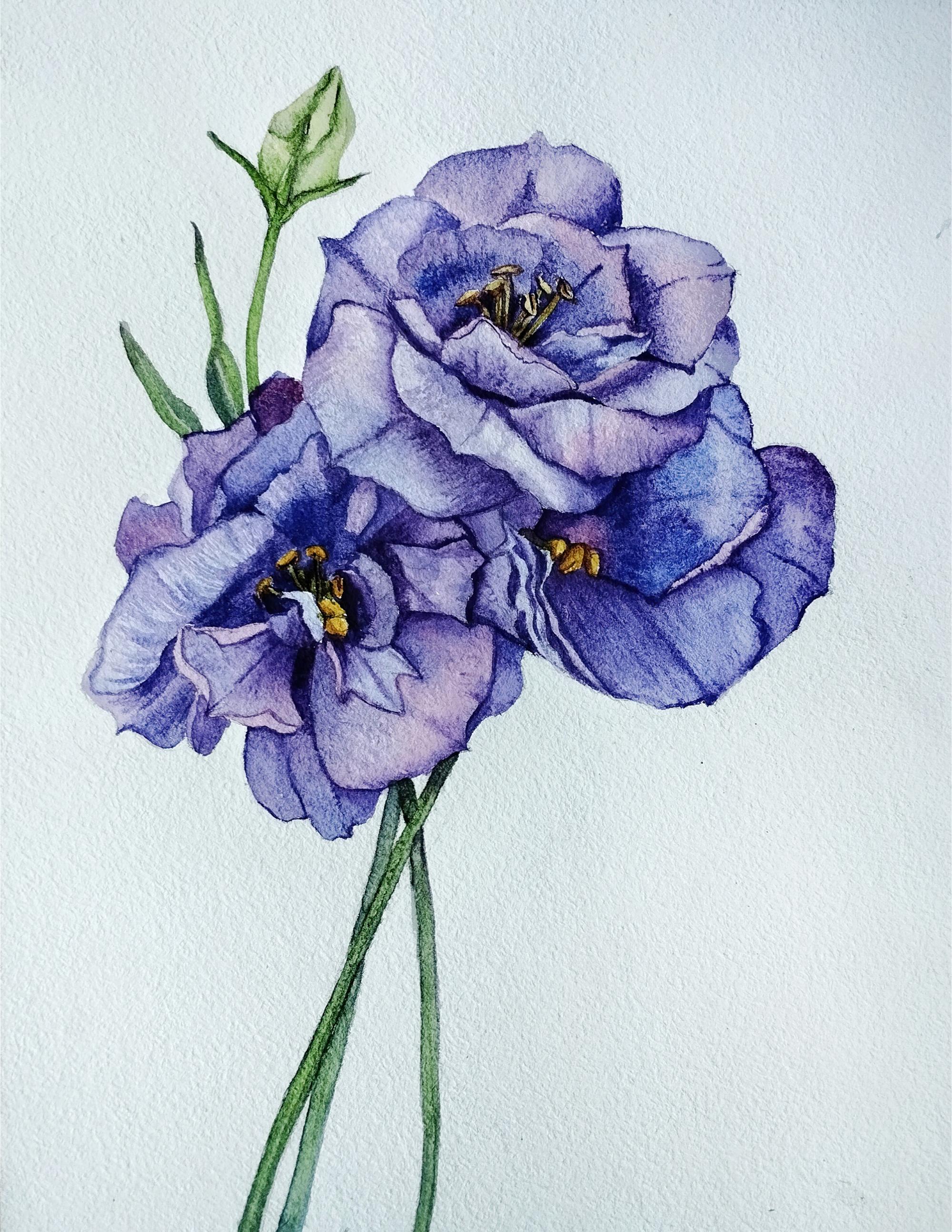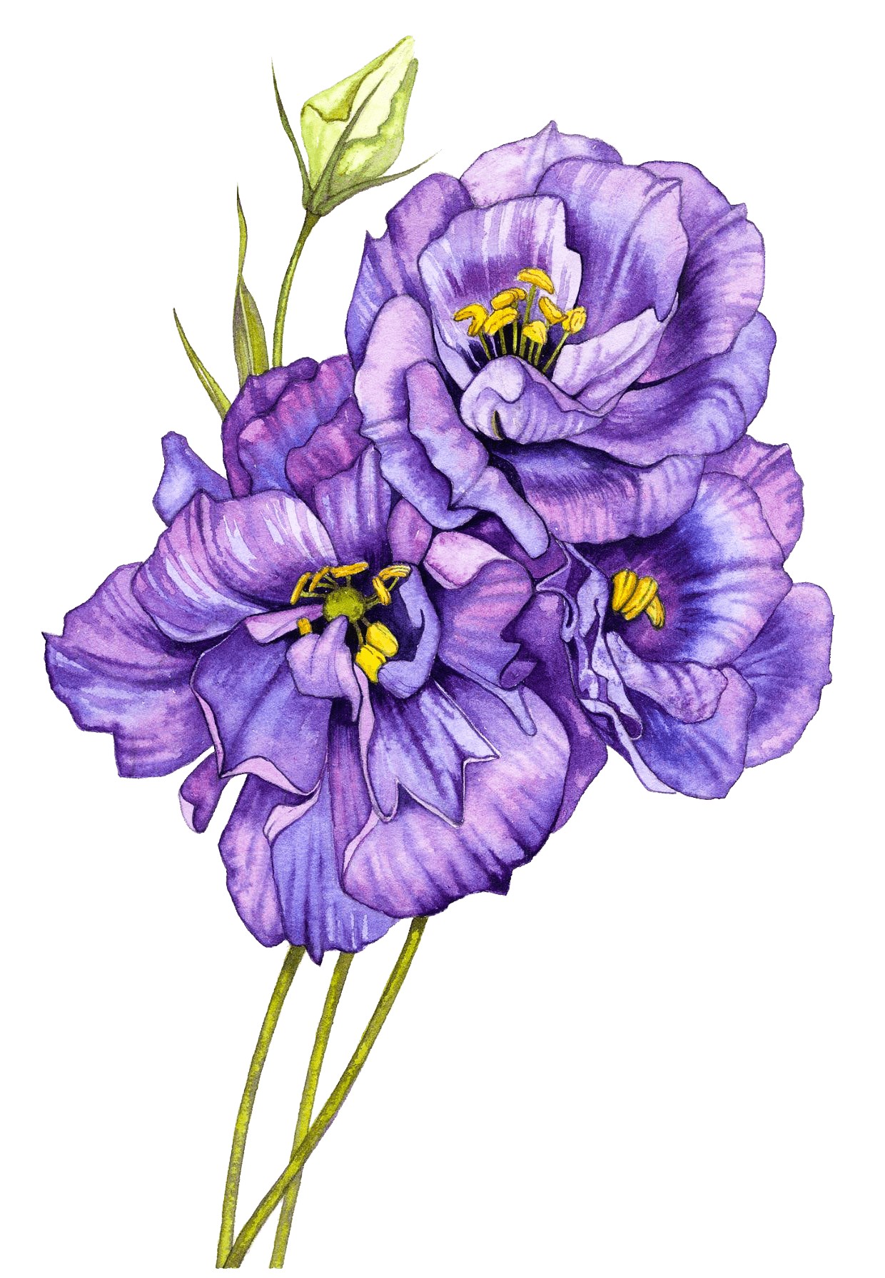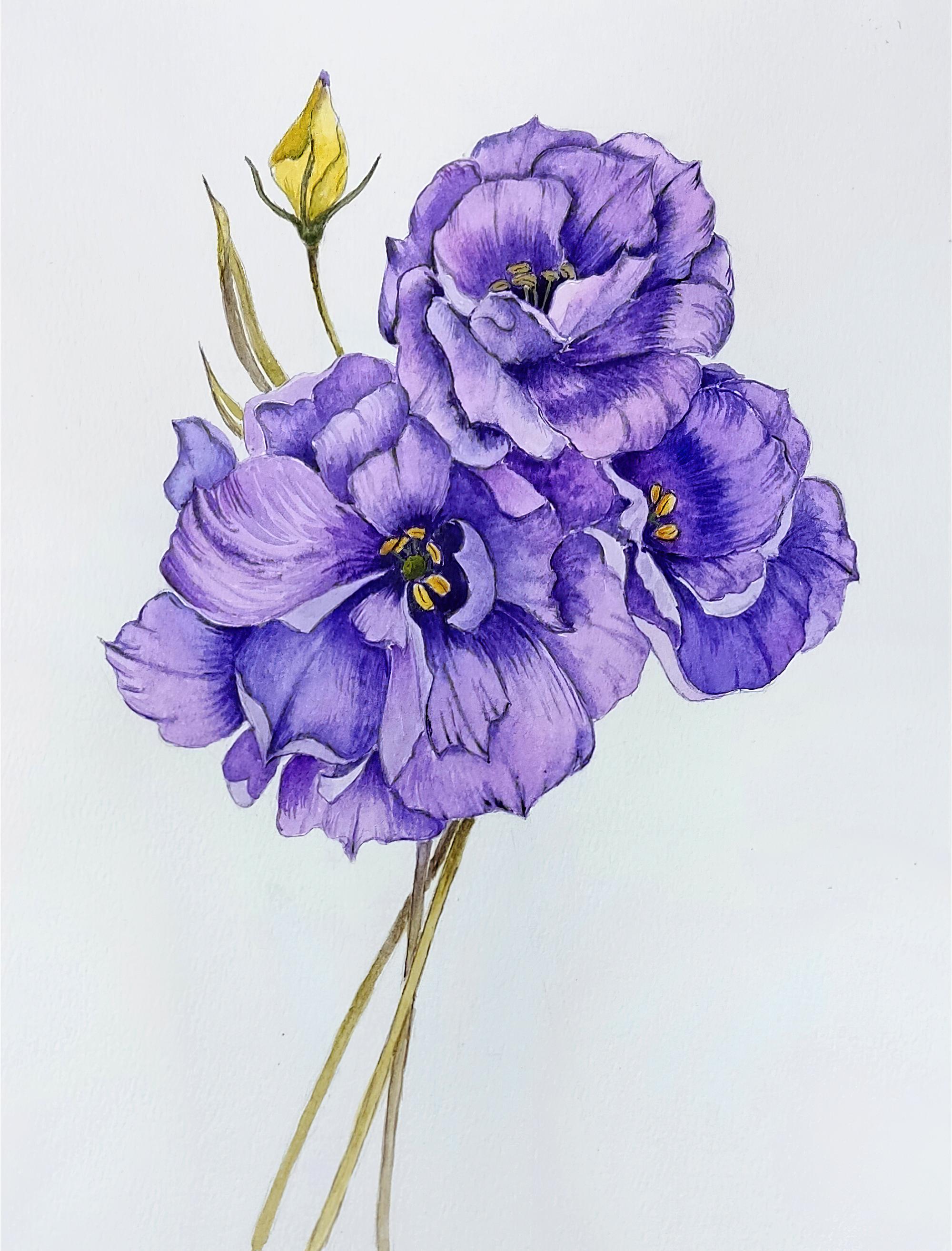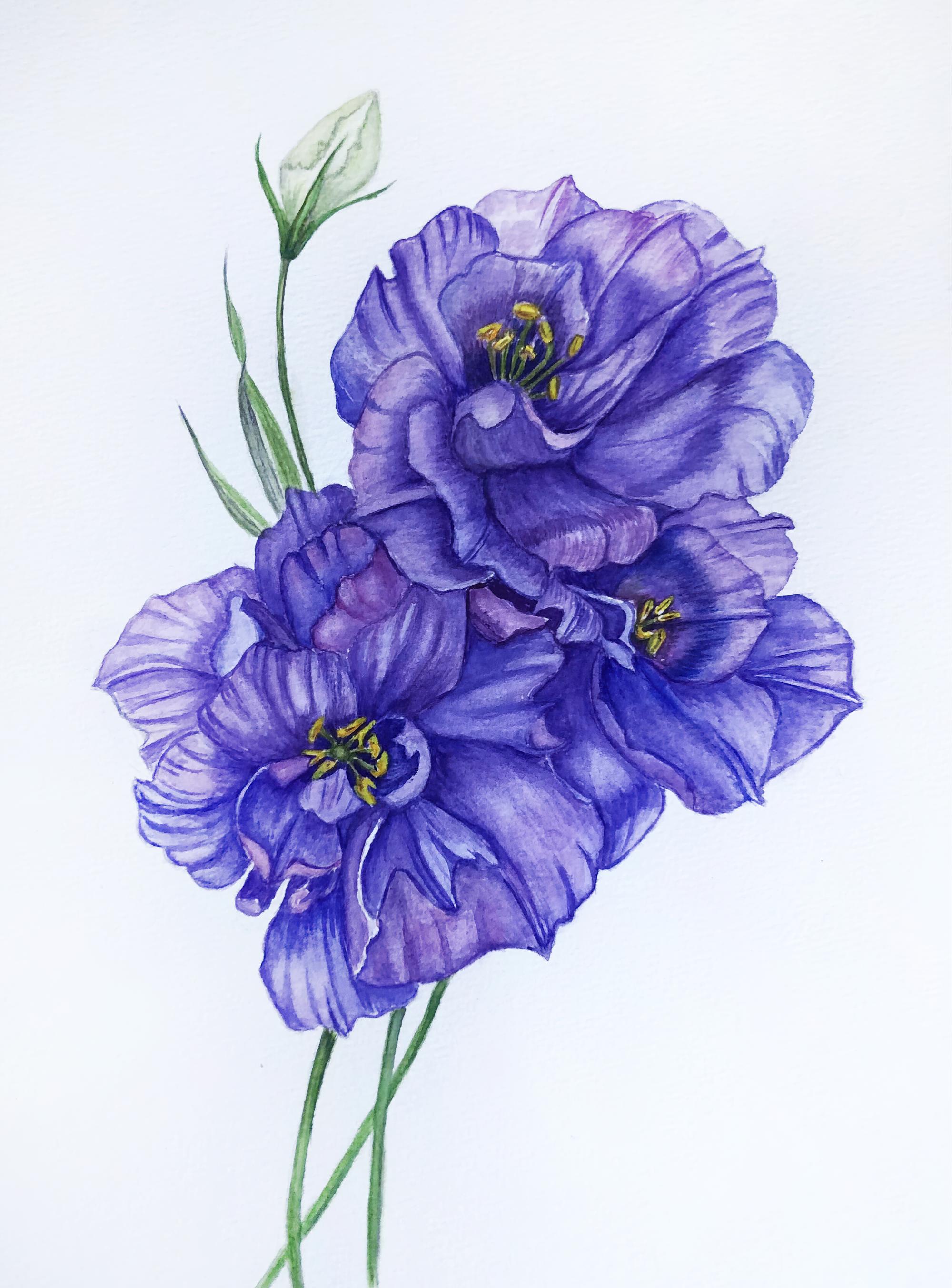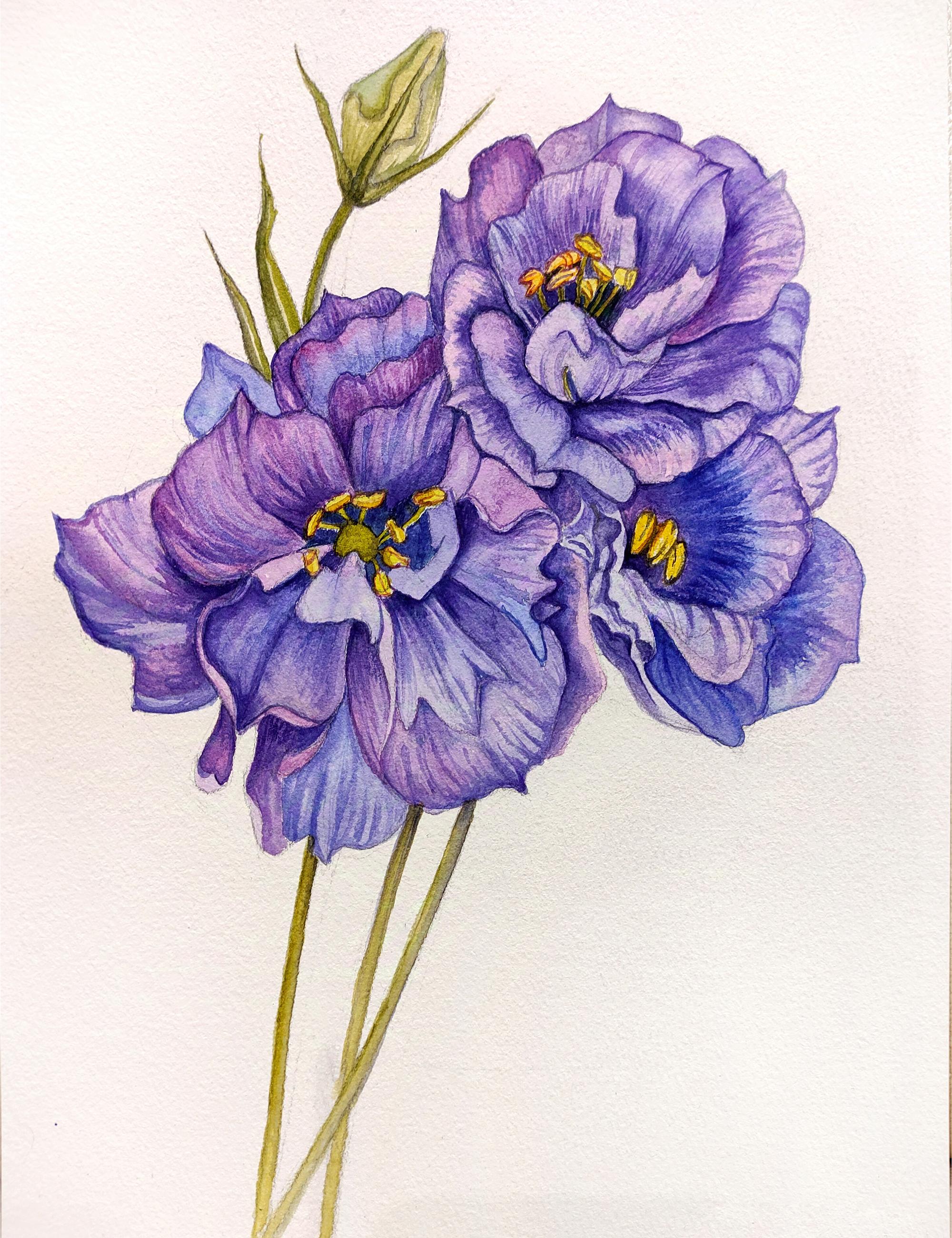 This session will complete the series of lessons dedicated to the botanical illustration of eustoma. We will enhance contrasts, clarify details on the flowers, and also paint the bud, green leaves, and stems.