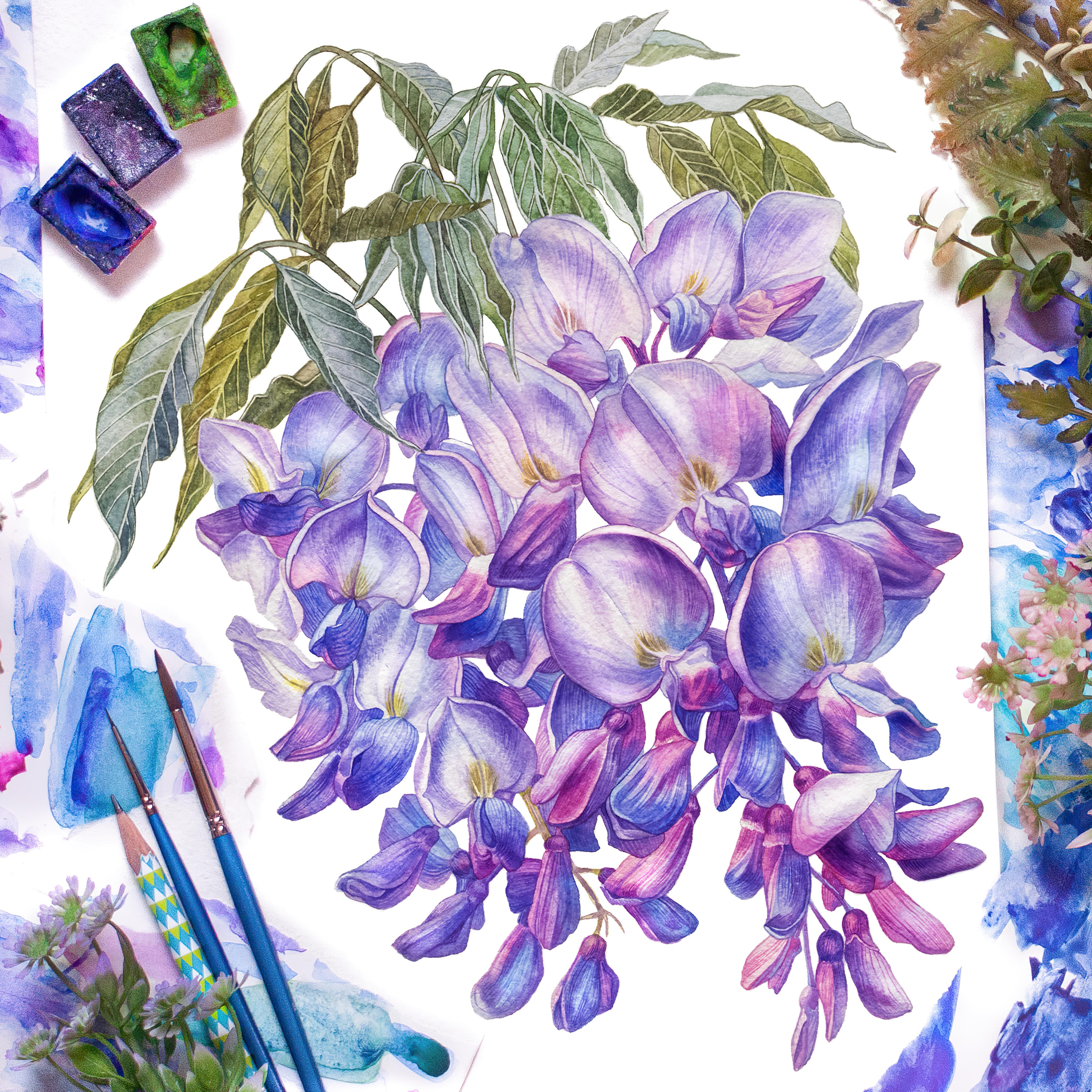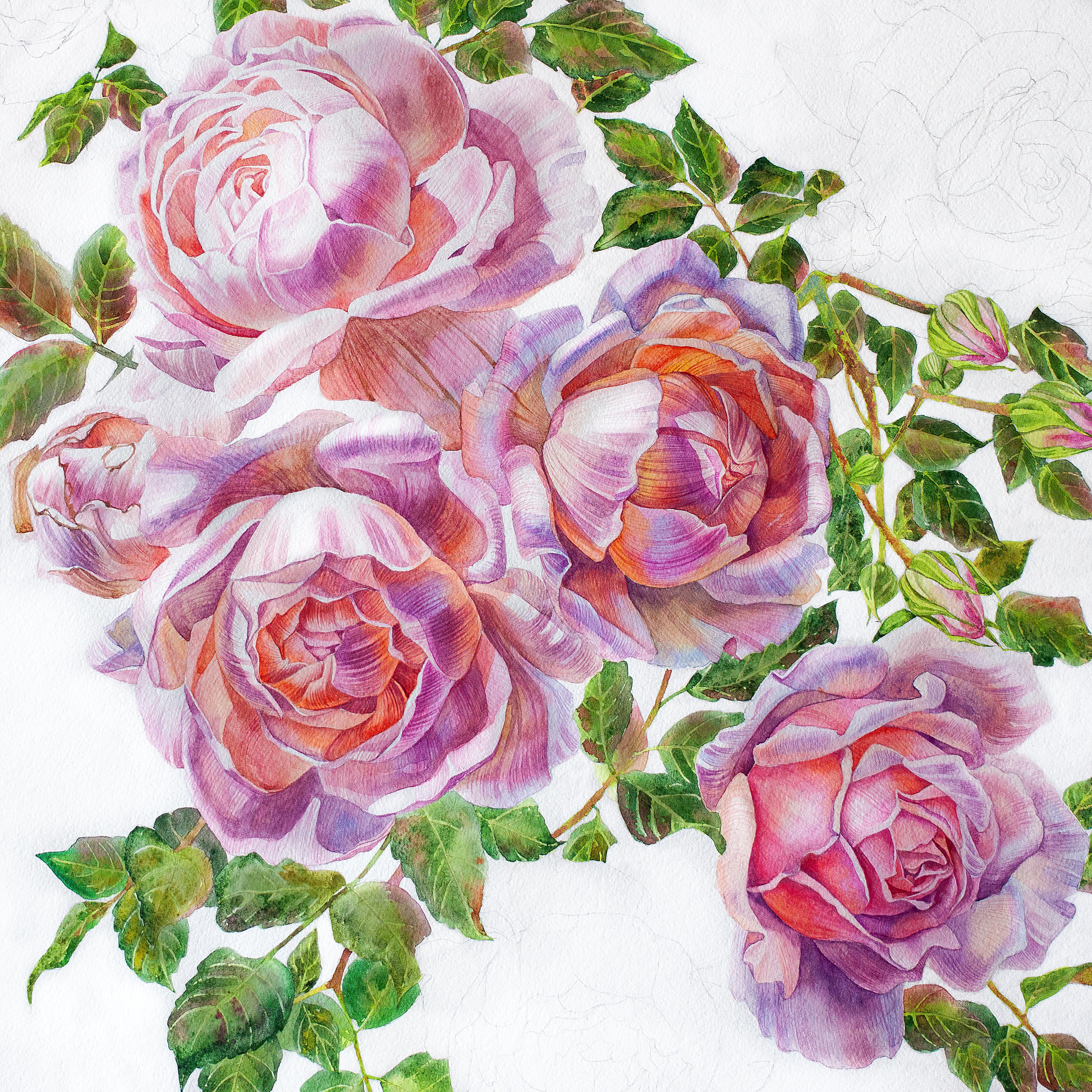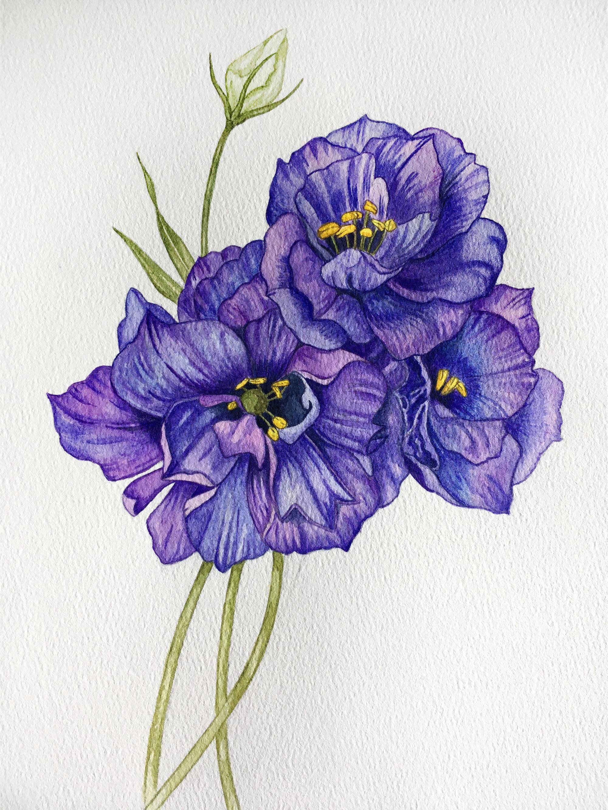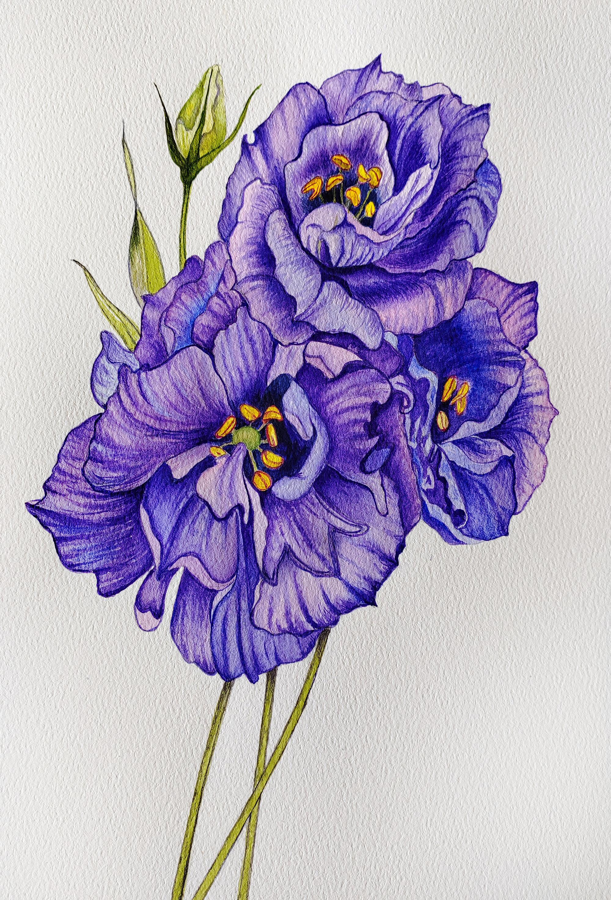 This session will complete the series of lessons dedicated to the botanical illustration of eustoma. We will enhance contrasts, clarify details on the flowers, and also paint the bud, green leaves, and stems.