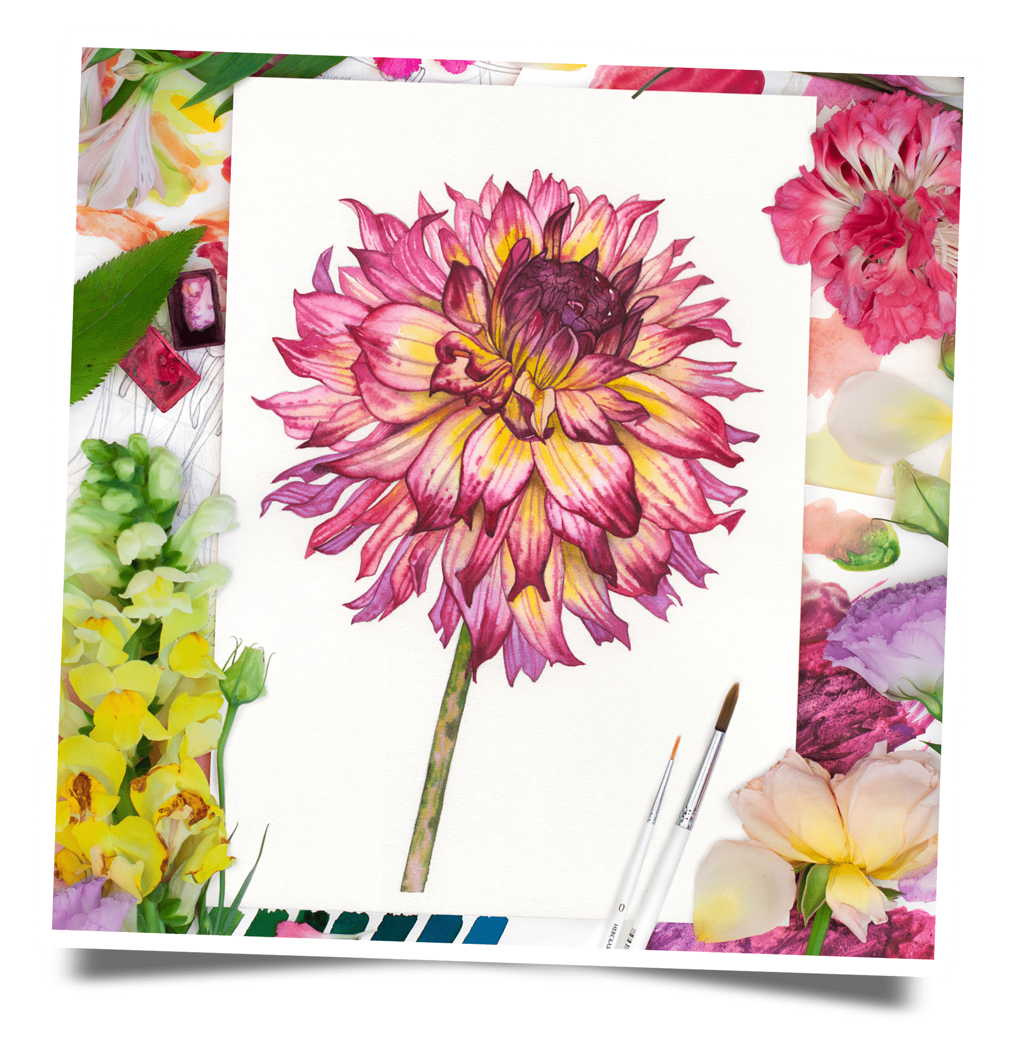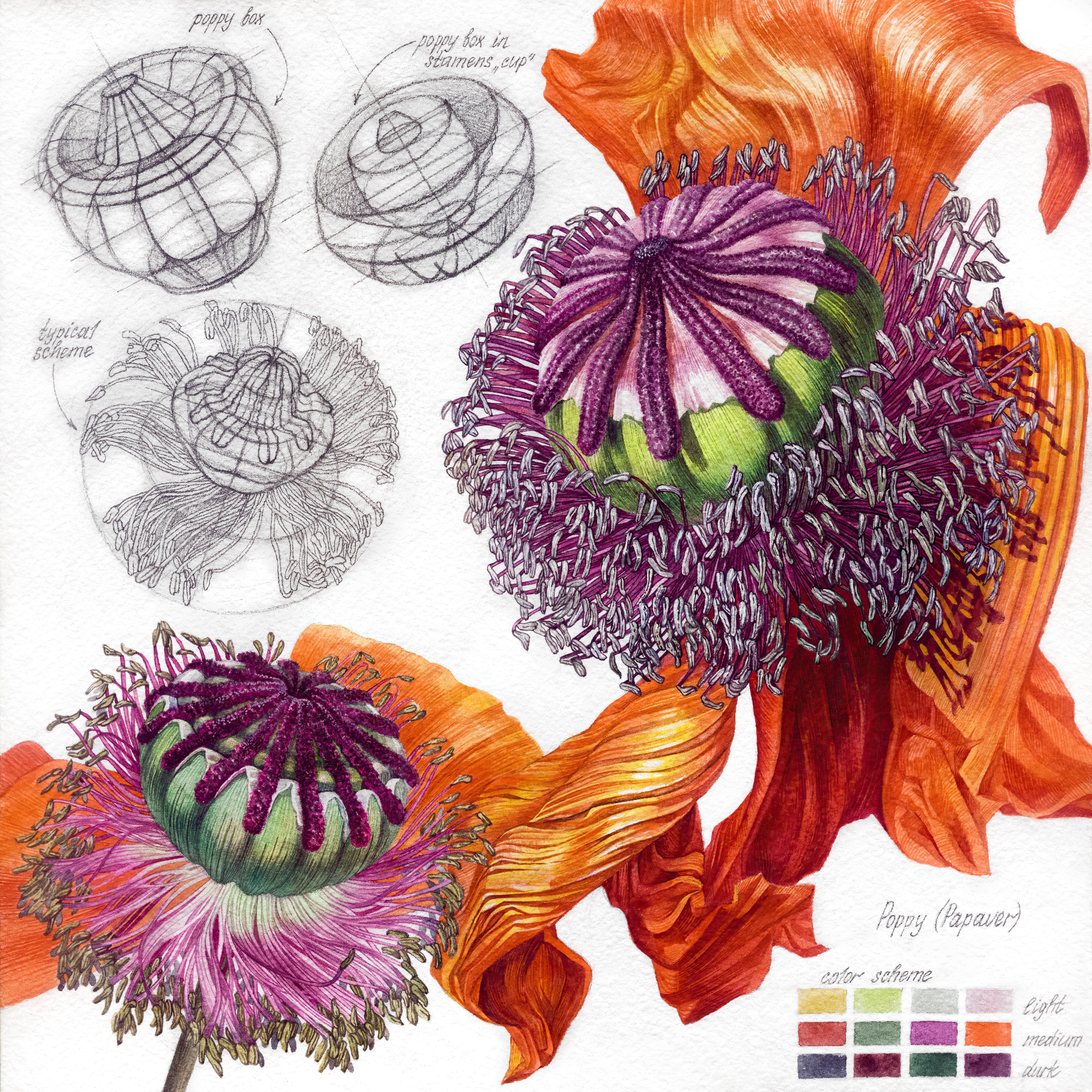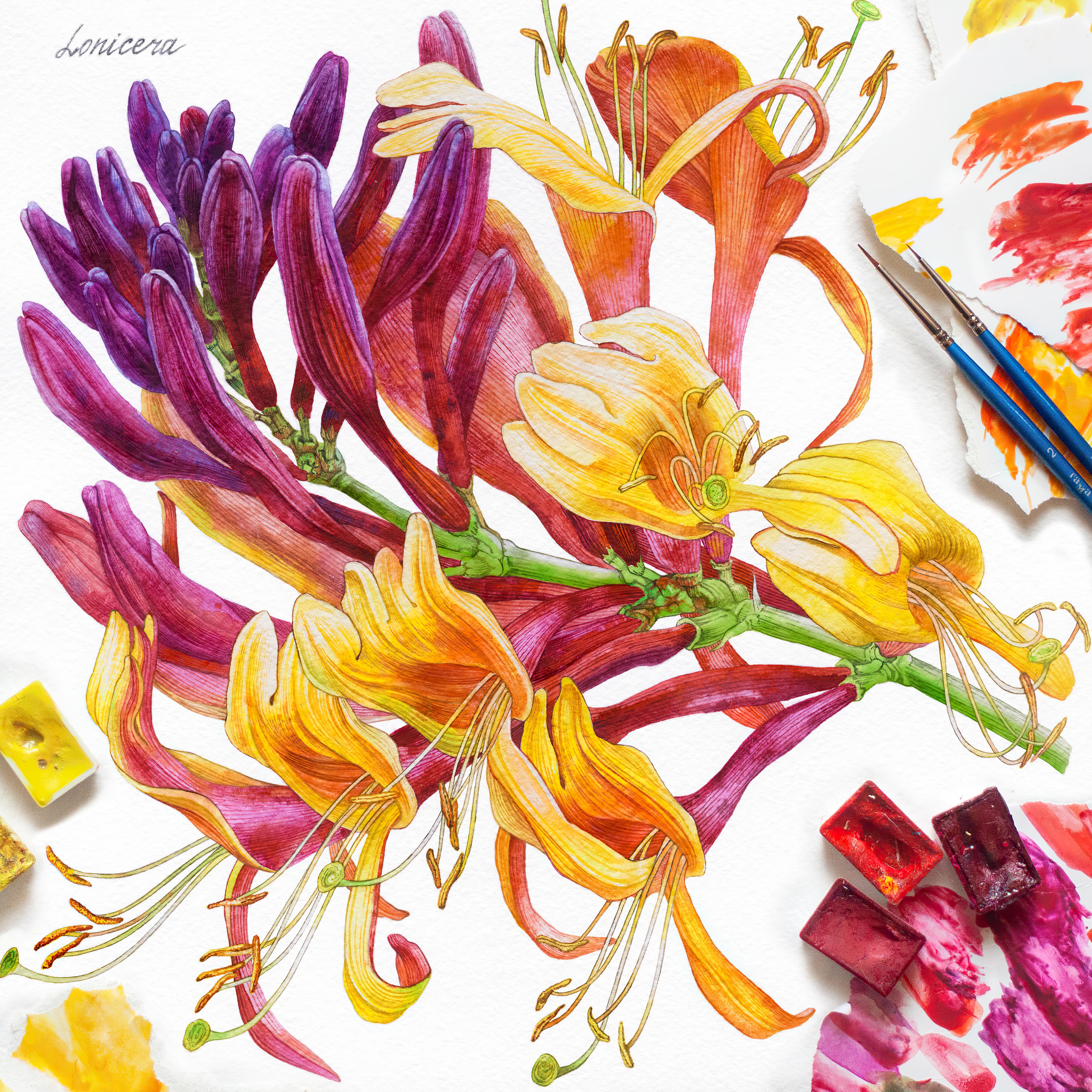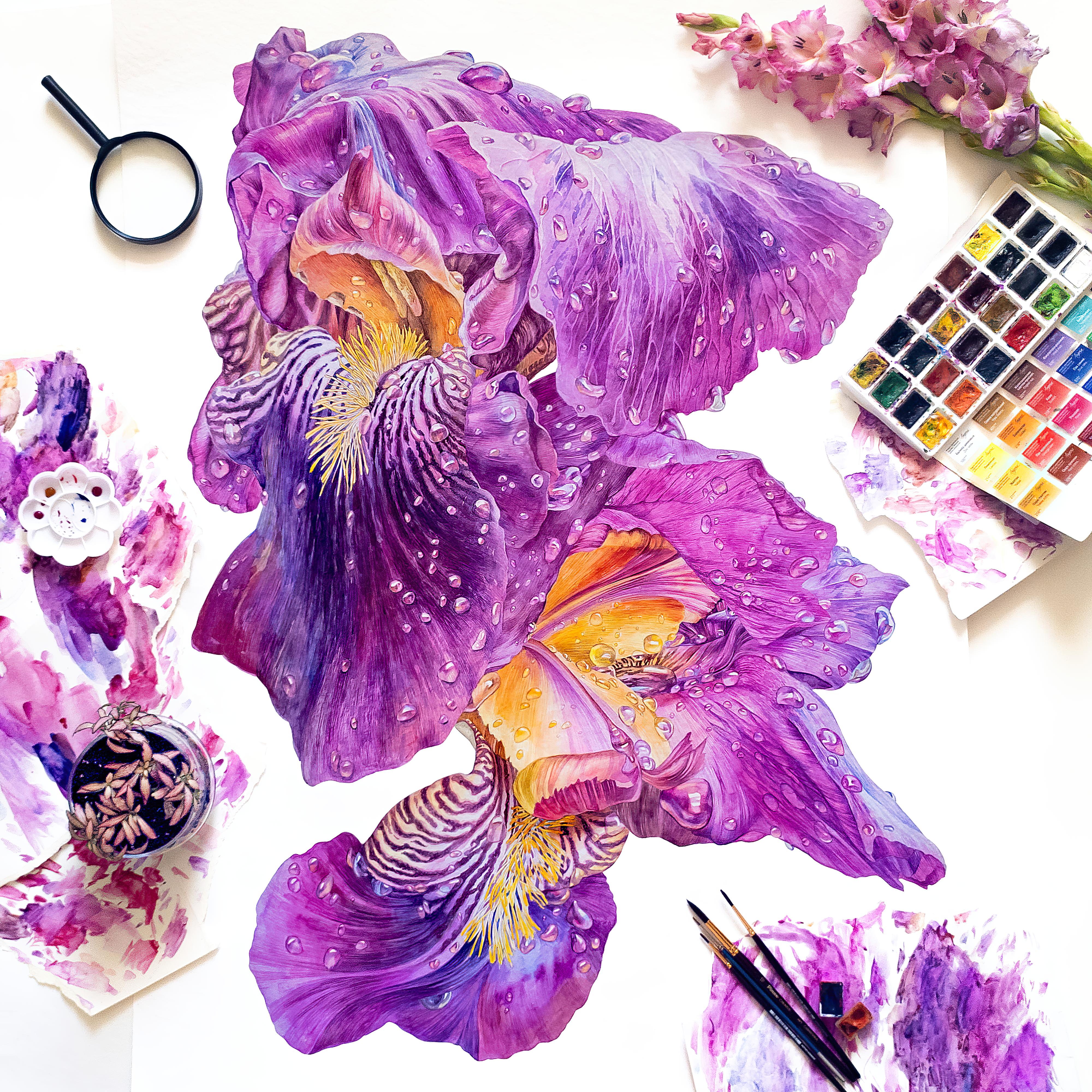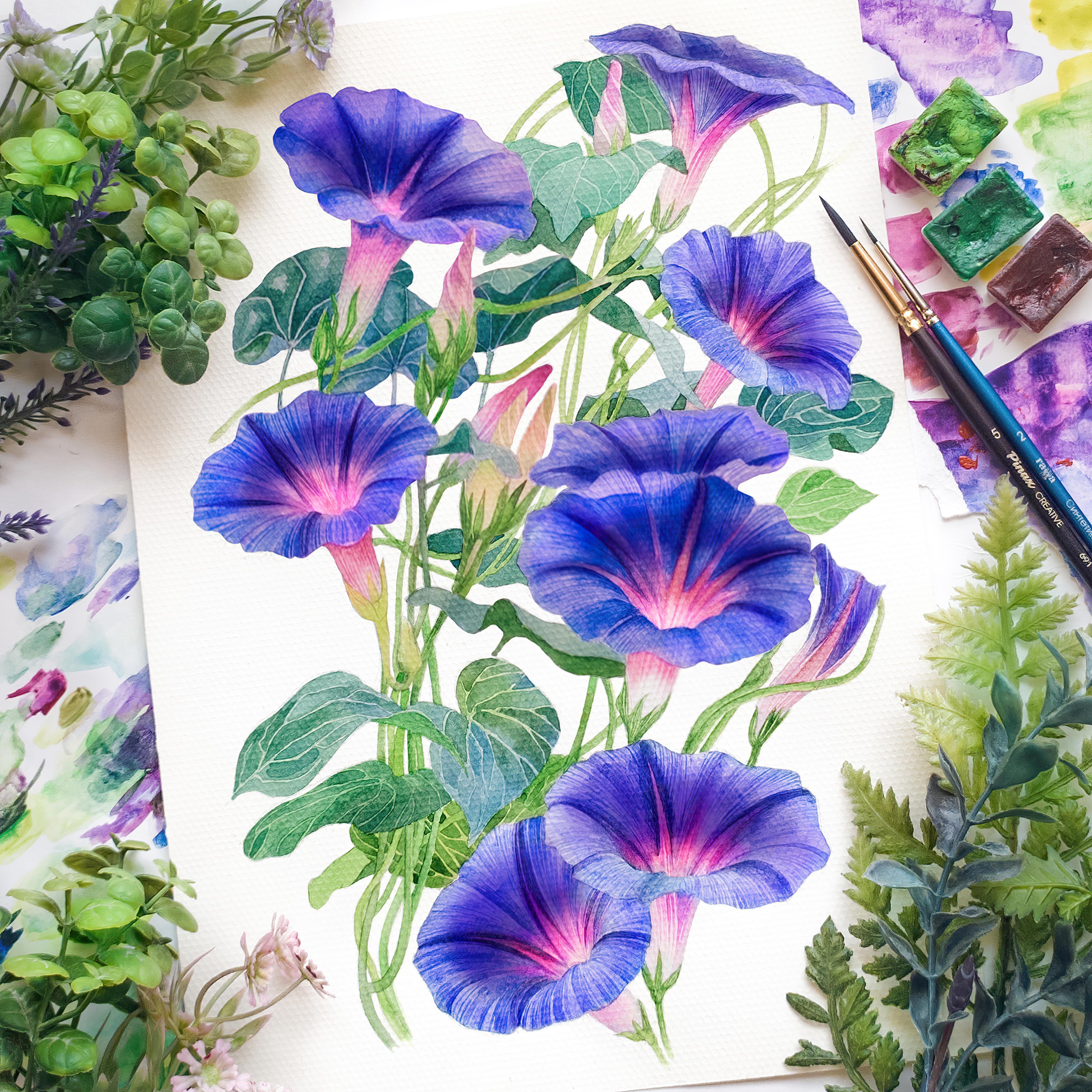 This session will complete the series of lessons dedicated to the botanical illustration of eustoma. We will enhance contrasts, clarify details on the flowers, and also paint the bud, green leaves, and stems.
