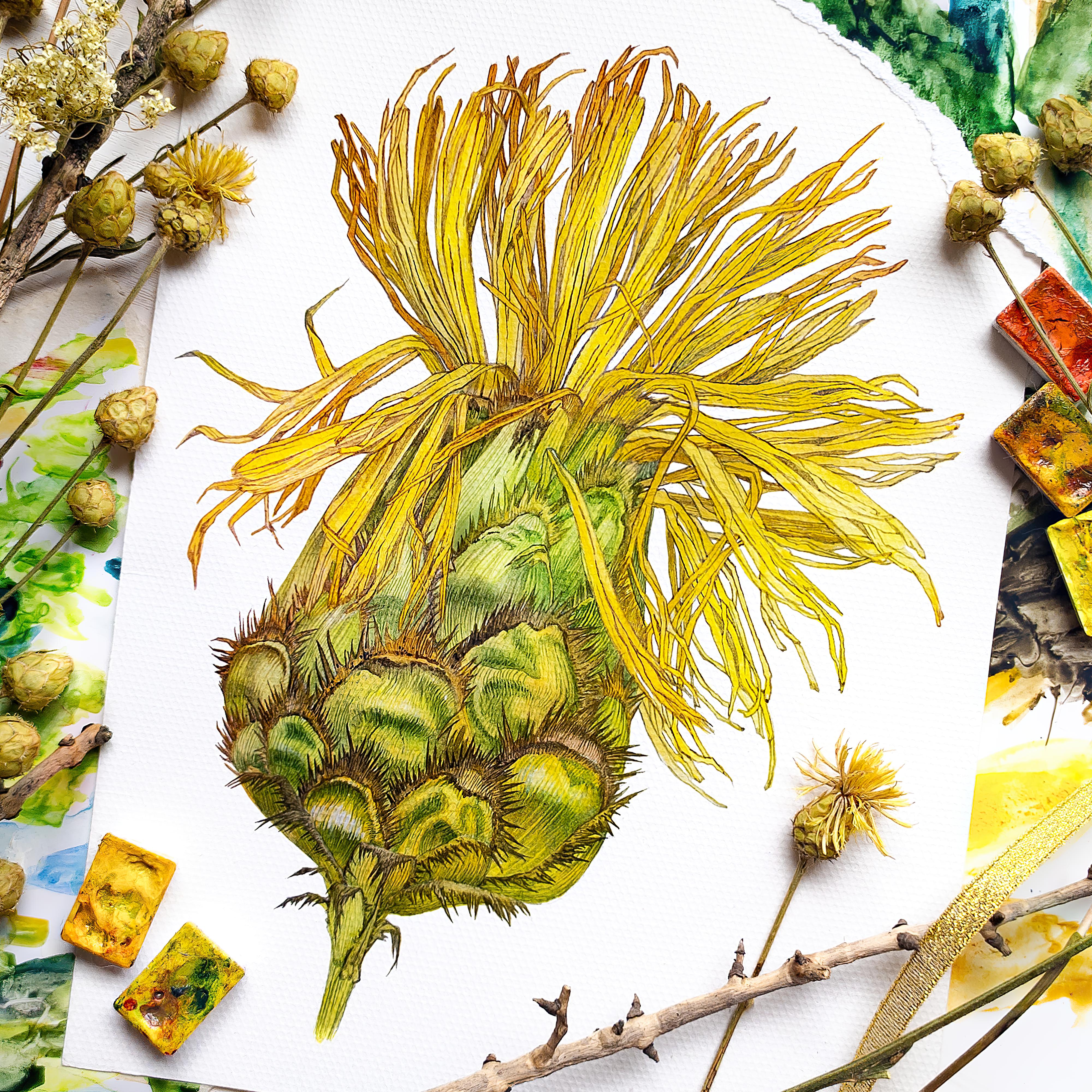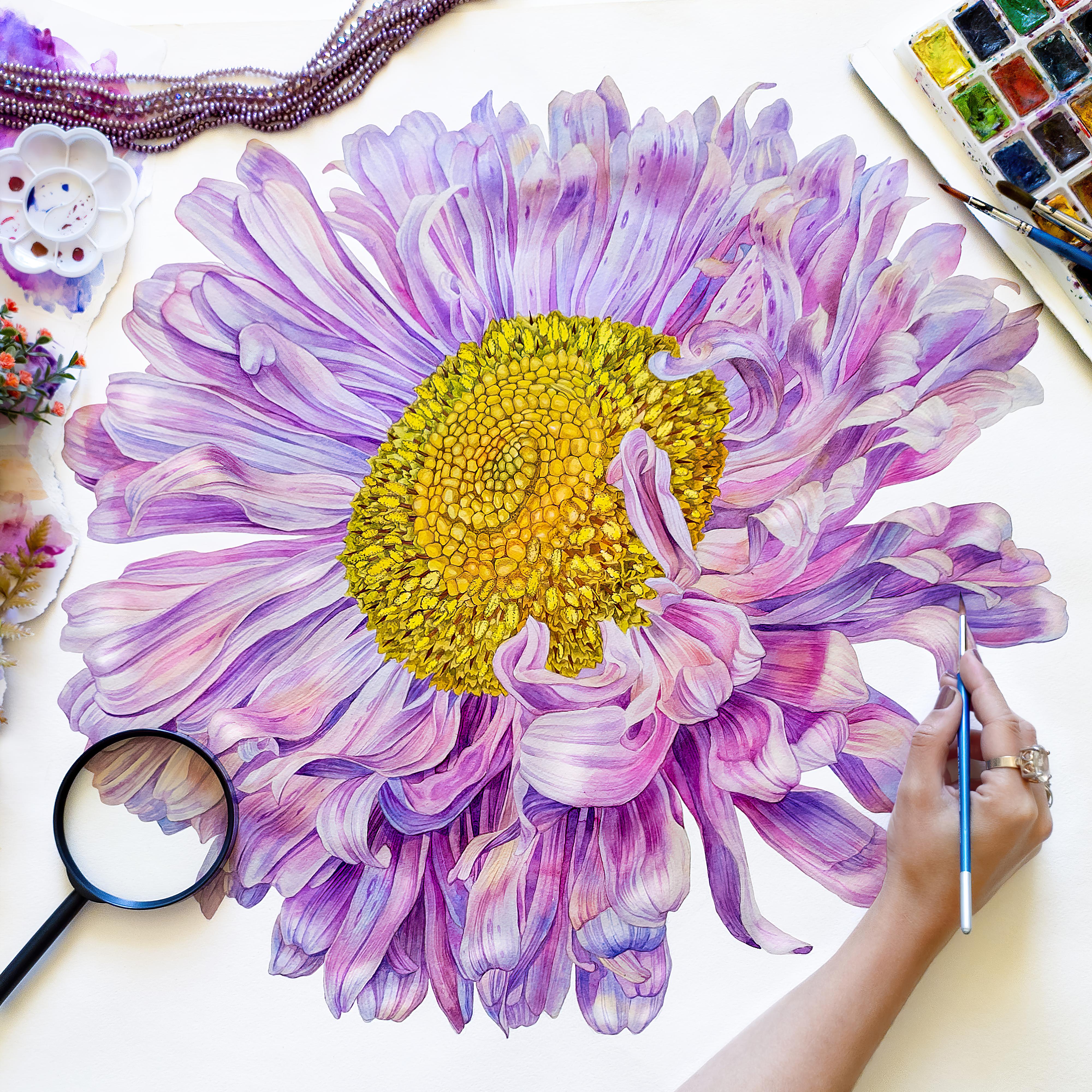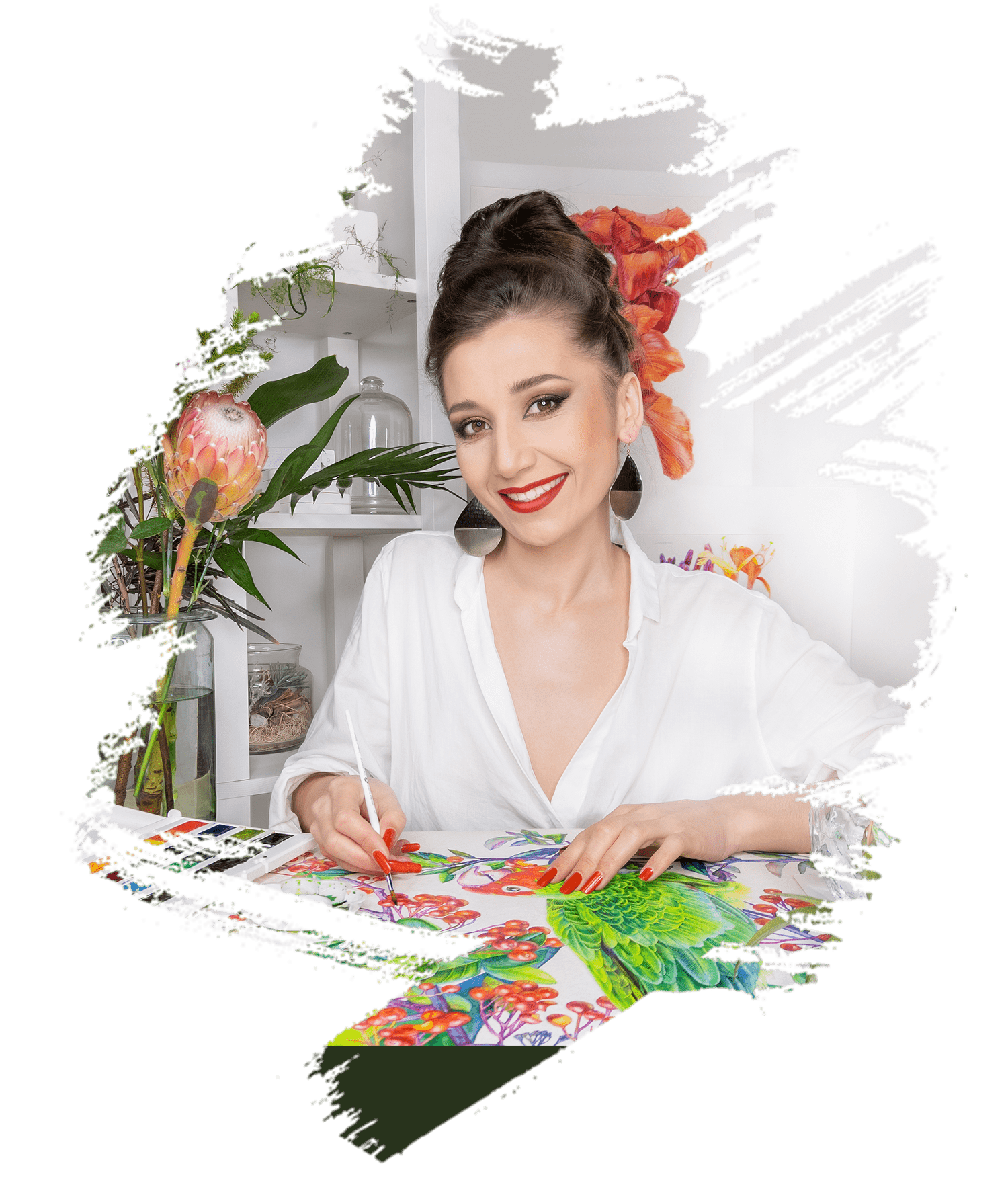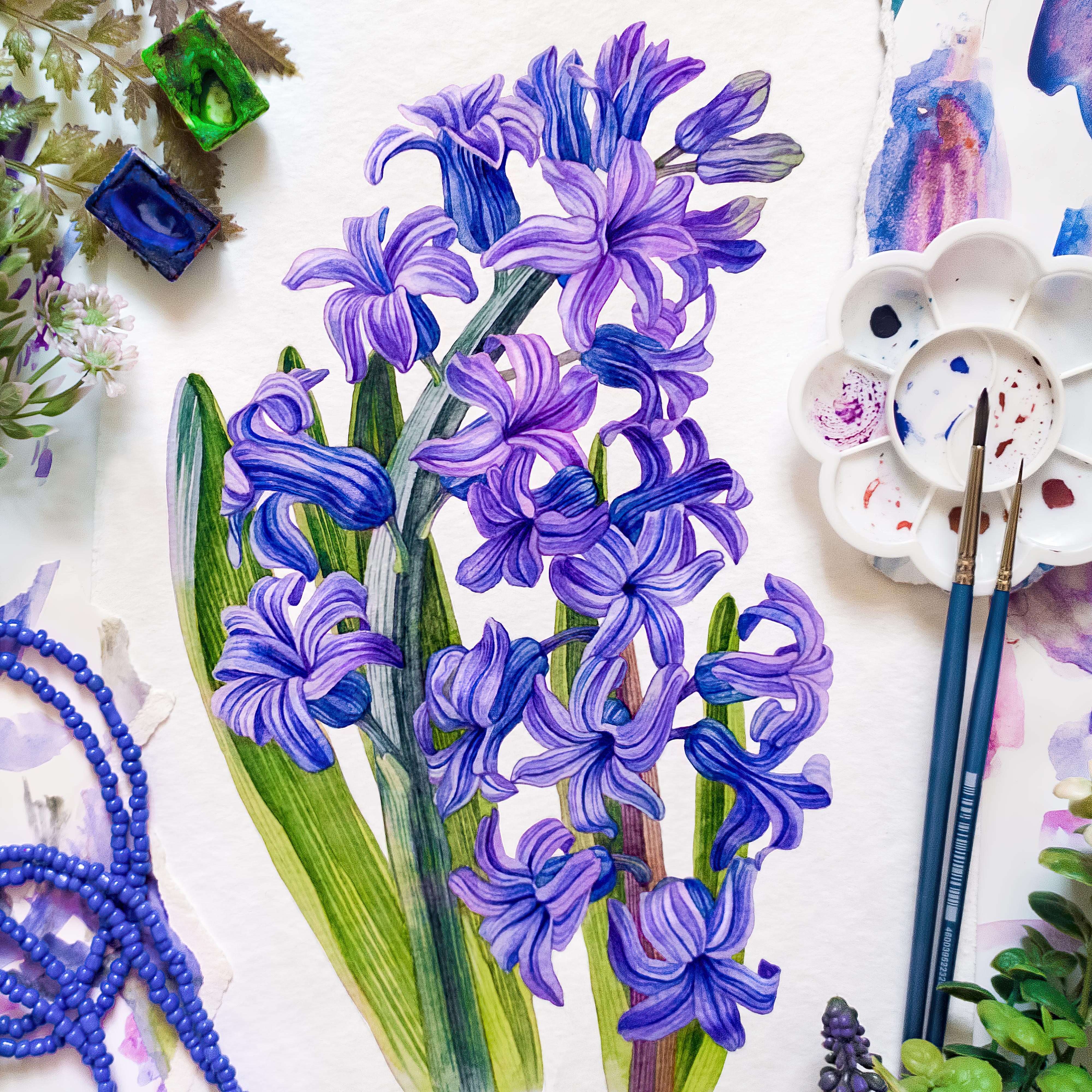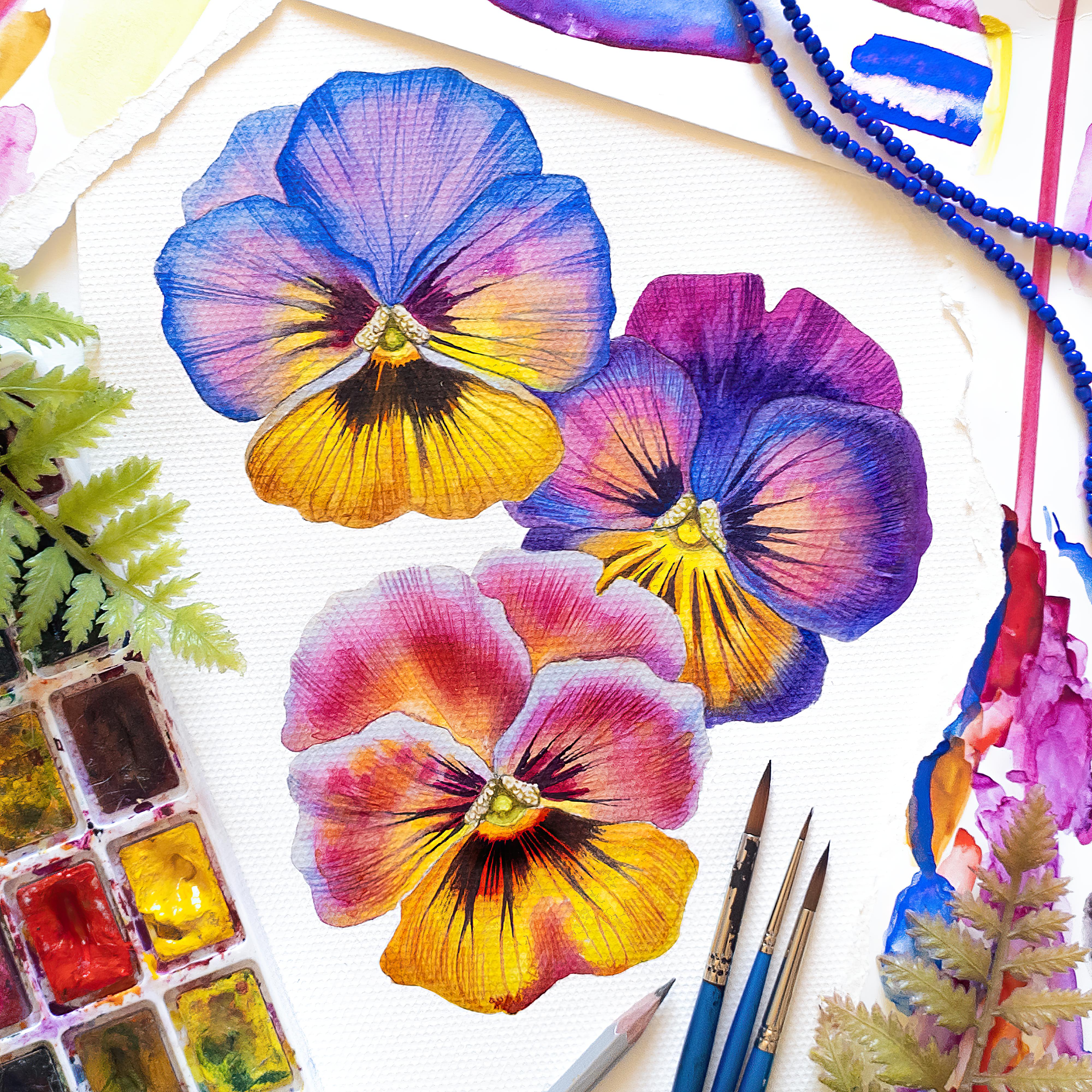 This session will complete the series of lessons dedicated to the botanical illustration of eustoma. We will enhance contrasts, clarify details on the flowers, and also paint the bud, green leaves, and stems.
