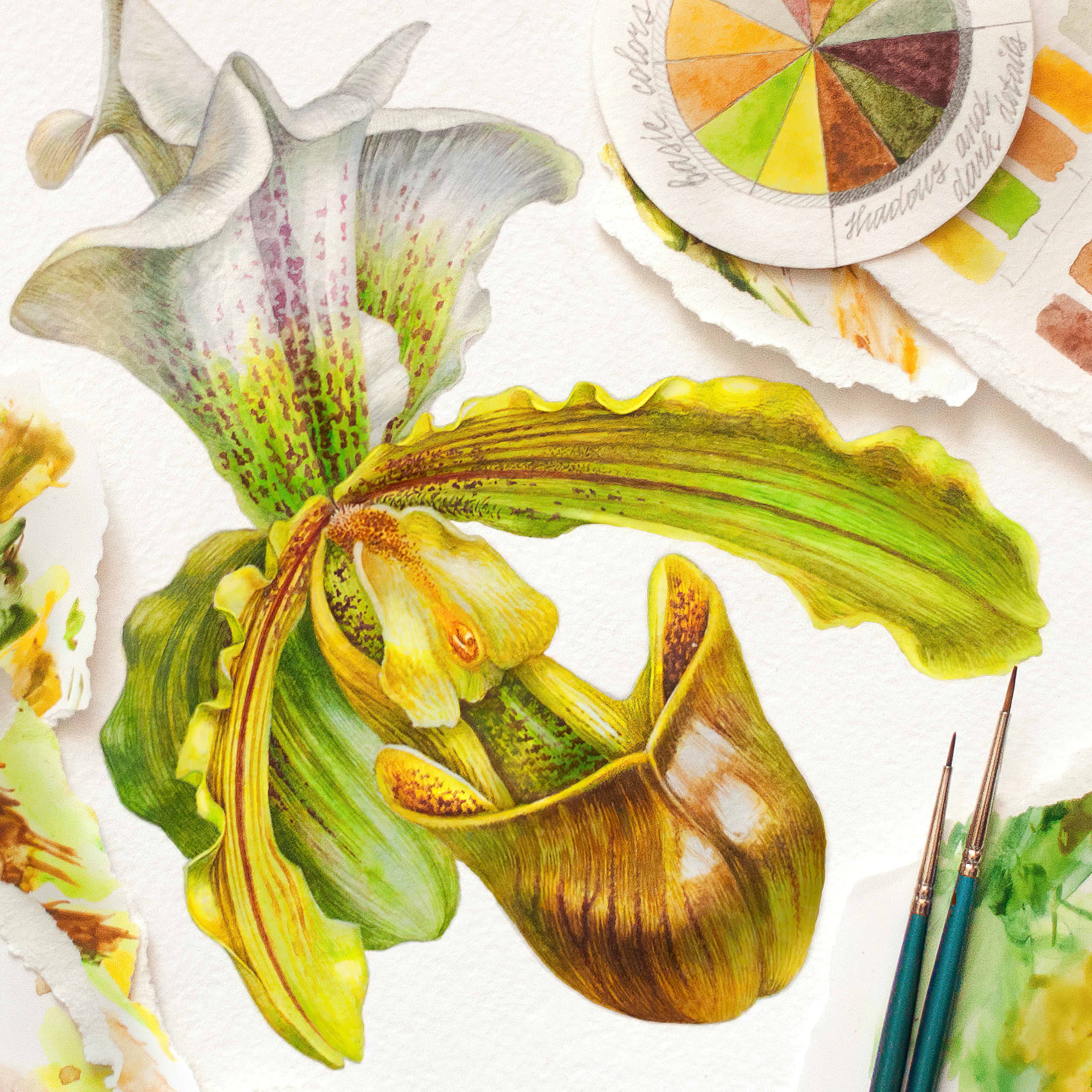 - paint fine details with a thin brush with soft and sharp edges on wet and dry paint layers to imitate shaded grooves, folds, and pigmentation on plant tissue.