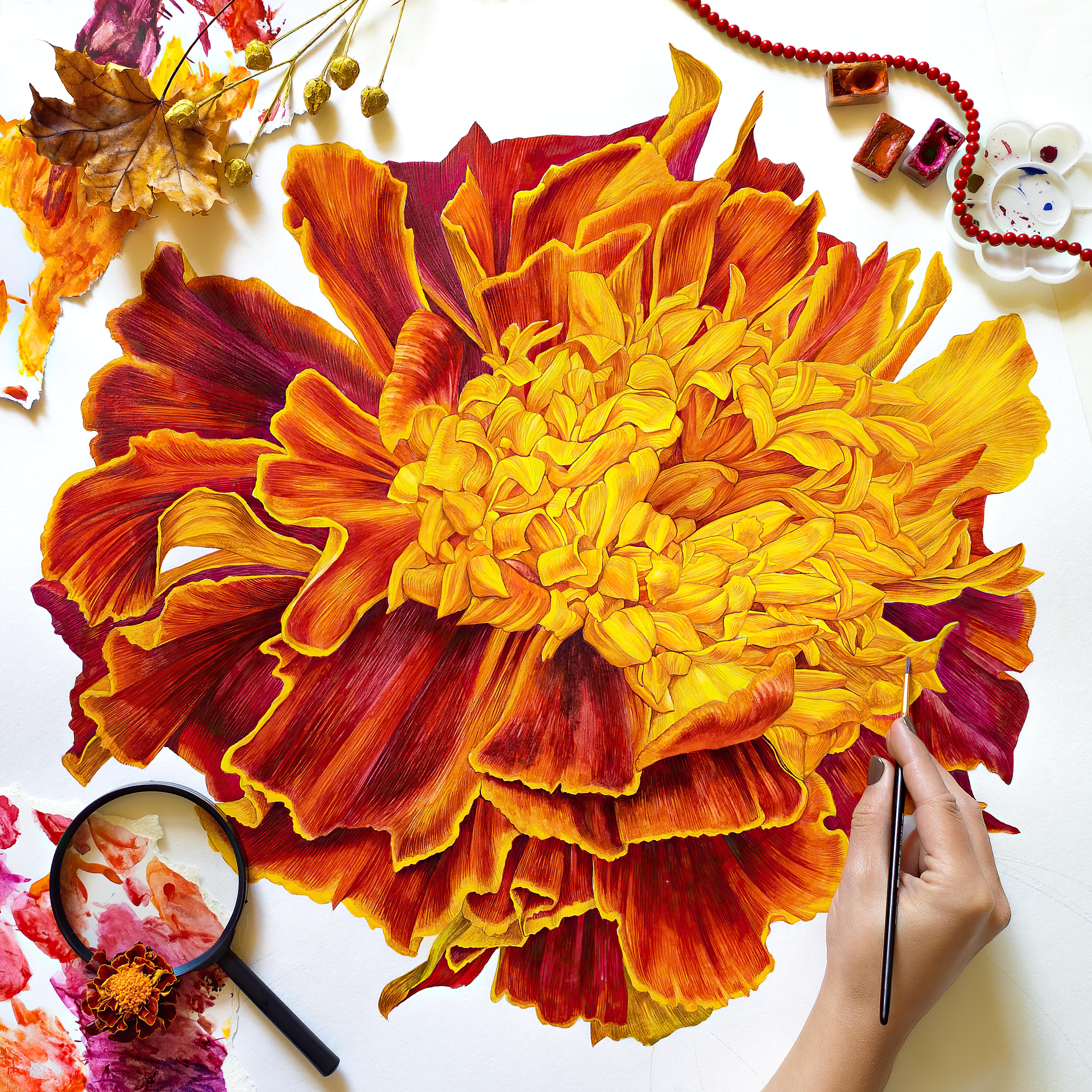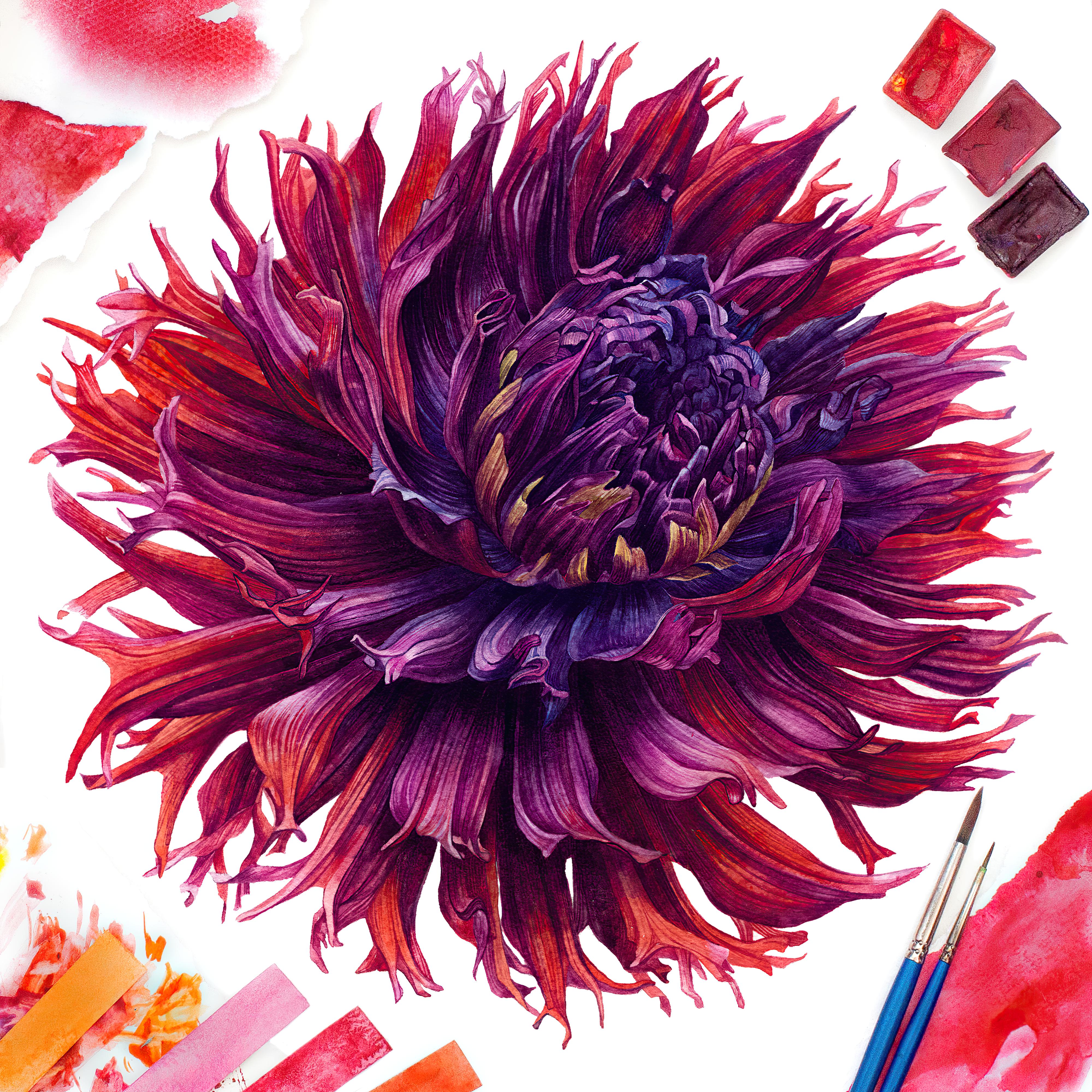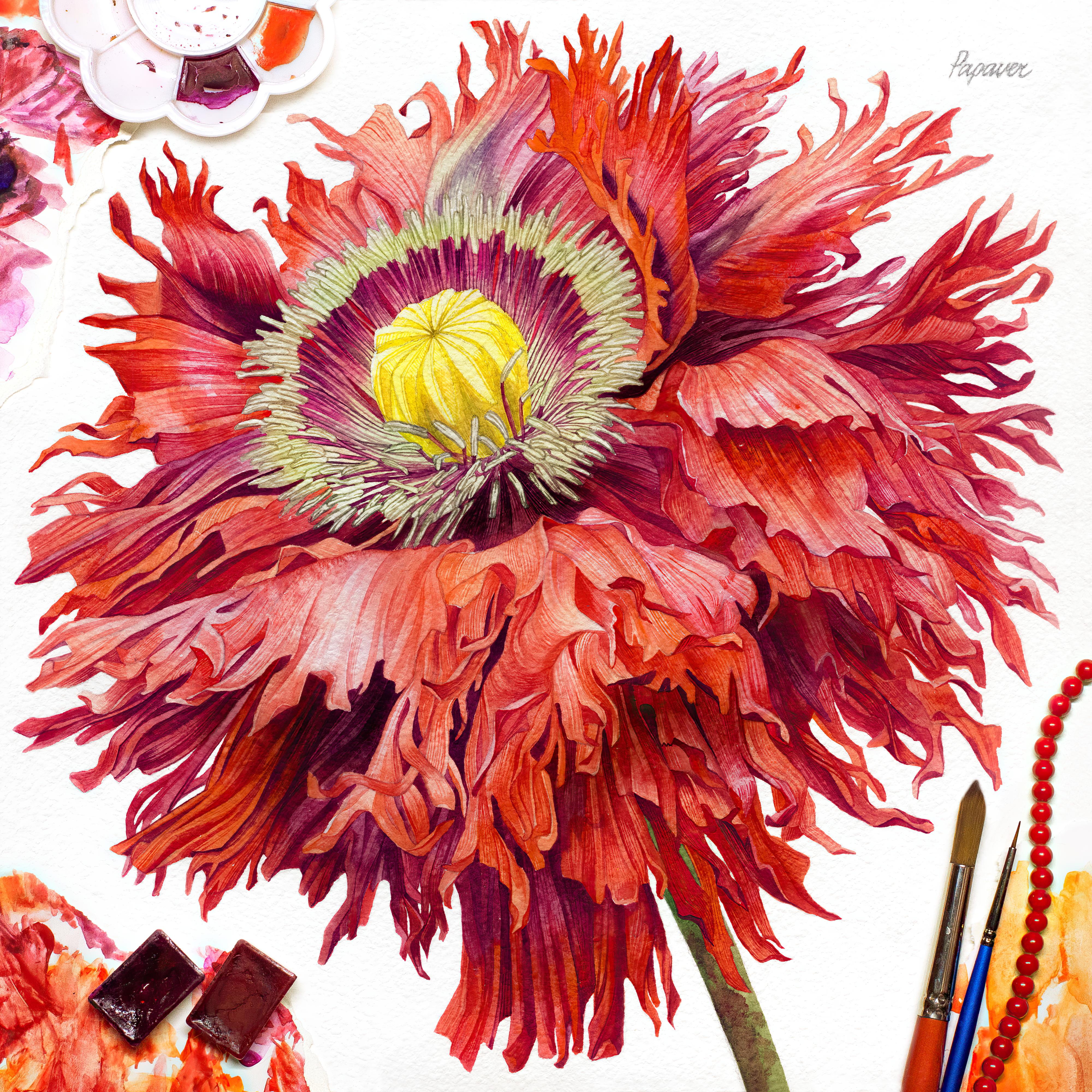 - recreate the tiered structure of the flower in multilayered painting, gradually enhancing the contrasts and saturation of the petals.