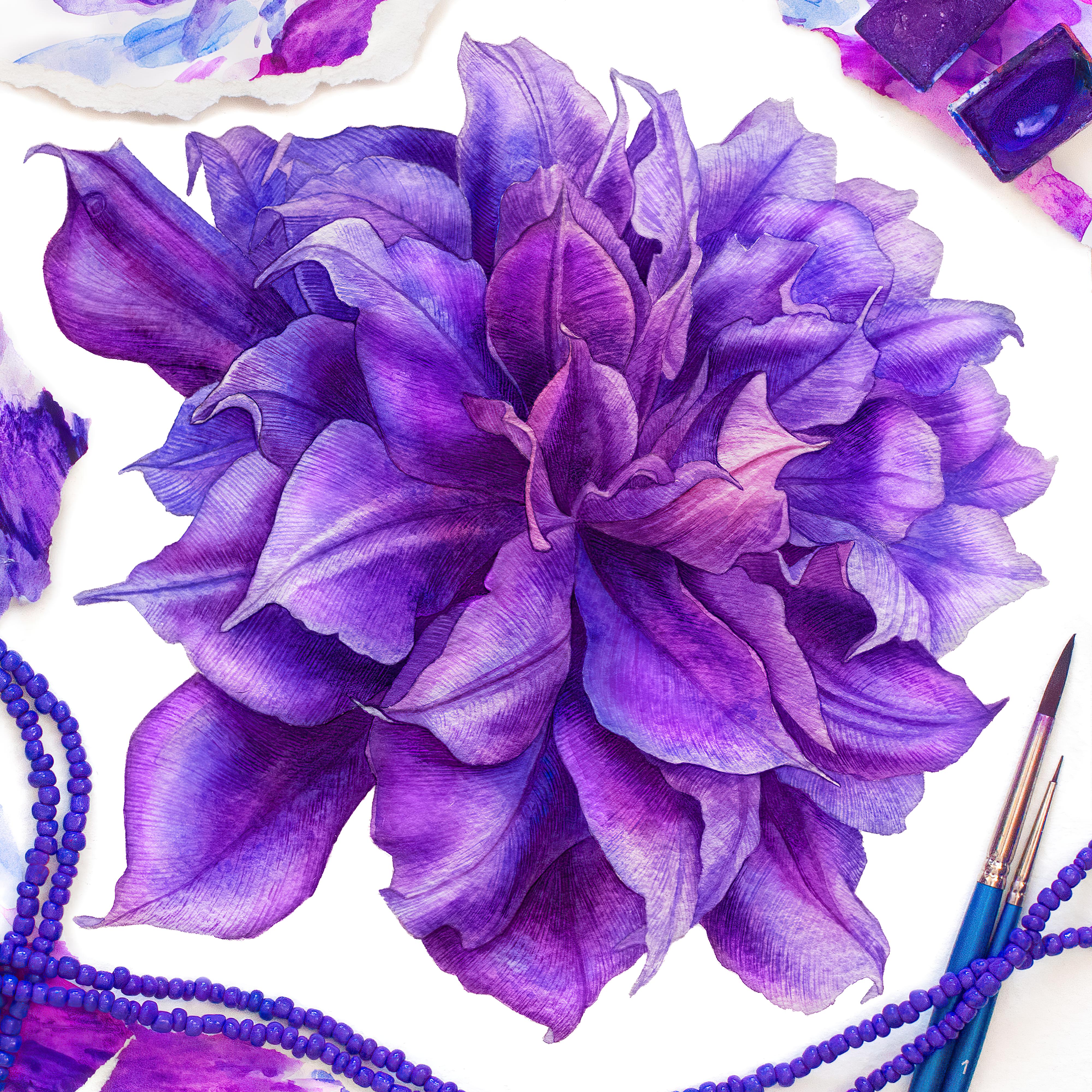 - achieve a play of shades of purple in tone and temperature in transparent basic washes with watercolor;