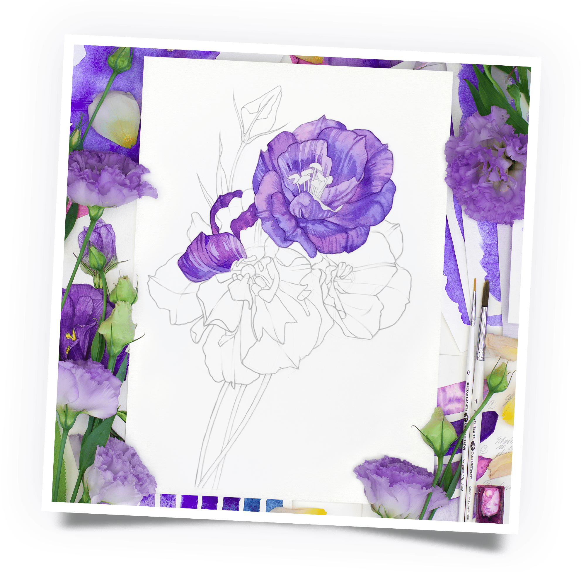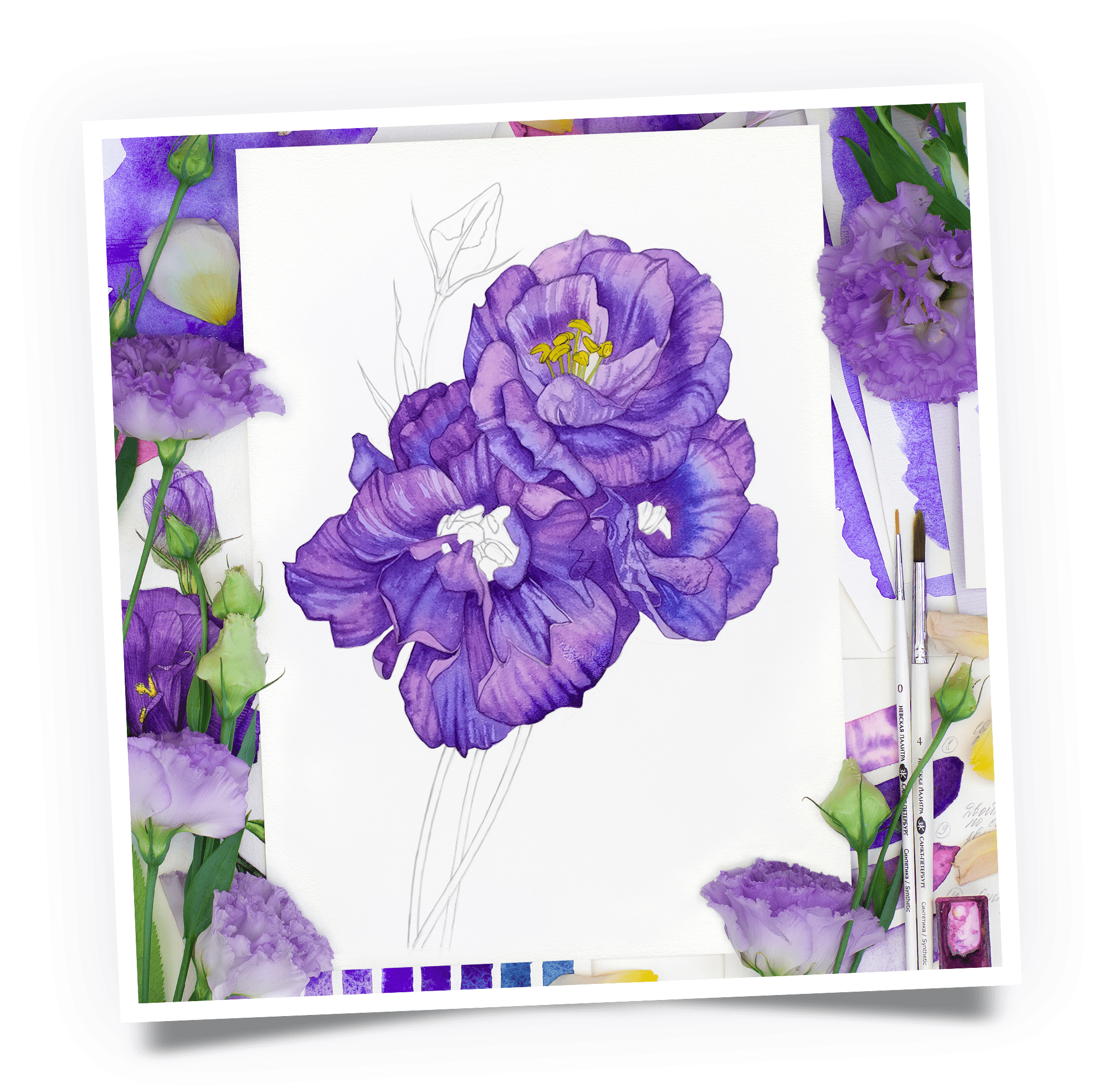 In this lesson, we will start creating a botanical illustration «Eustoma», make a preparatory painting with a simple pencil, and the first washes with watercolor along with selective detailing.