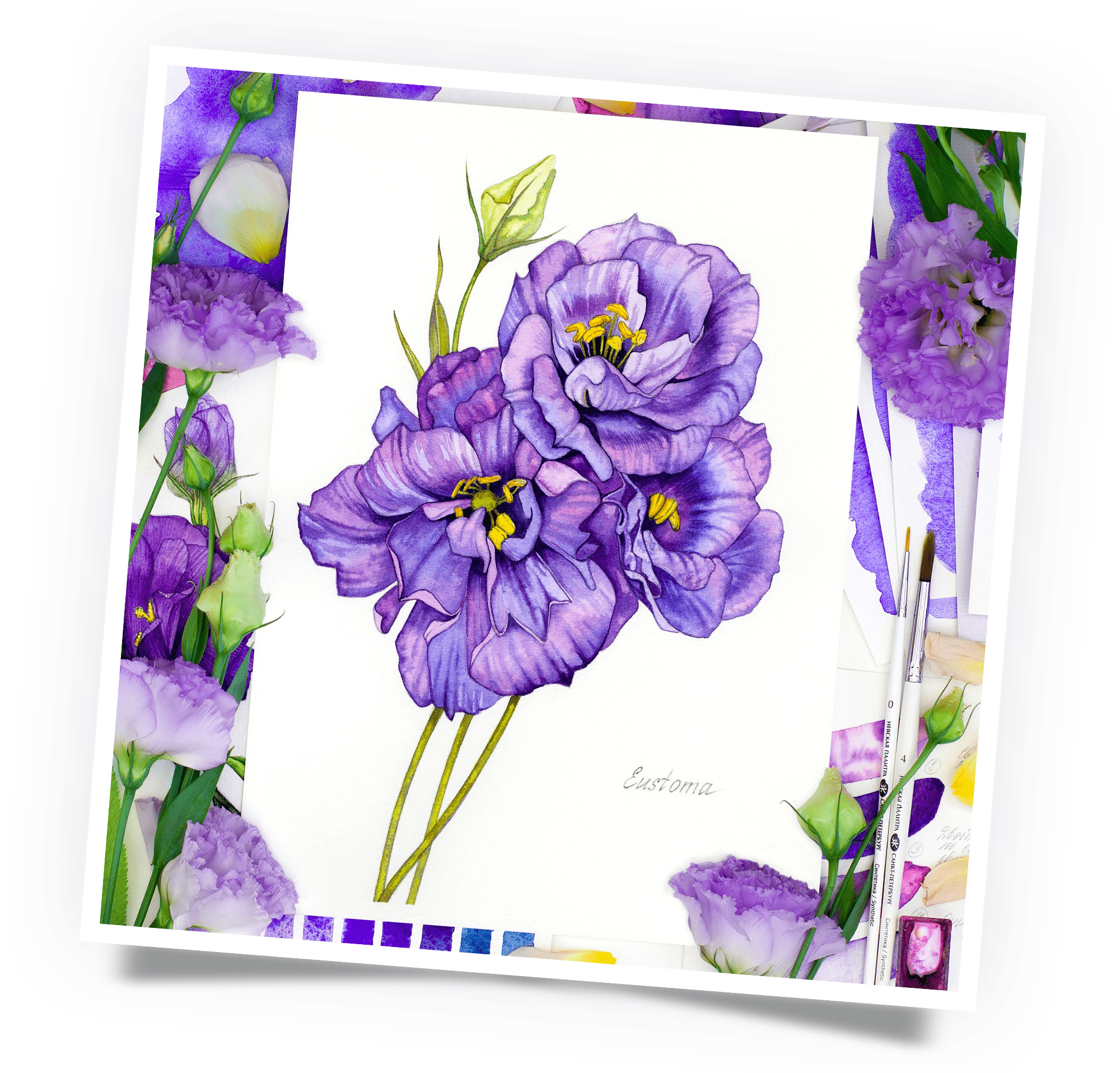 In this session, we will continue to work with watercolor on the multi-layer illustration «Eustoma», performing washes and detailing the petals.