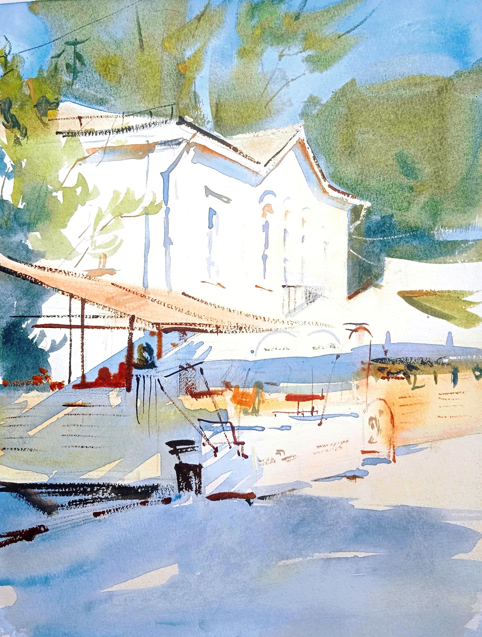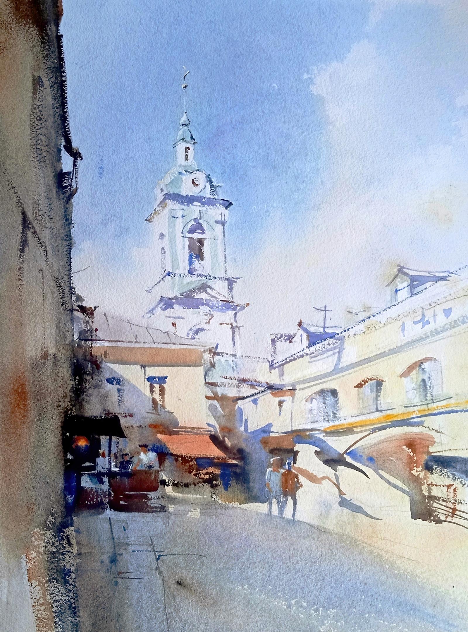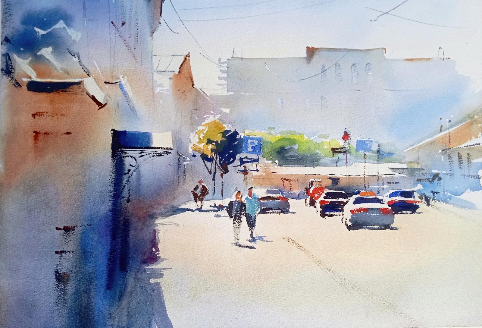 Let’s take a walk on a warm, sunny day, where light, shadows, and movement fill the city with life. In this lesson, we will practice maintaining the lightness of watercolor and avoiding overworking the painting.