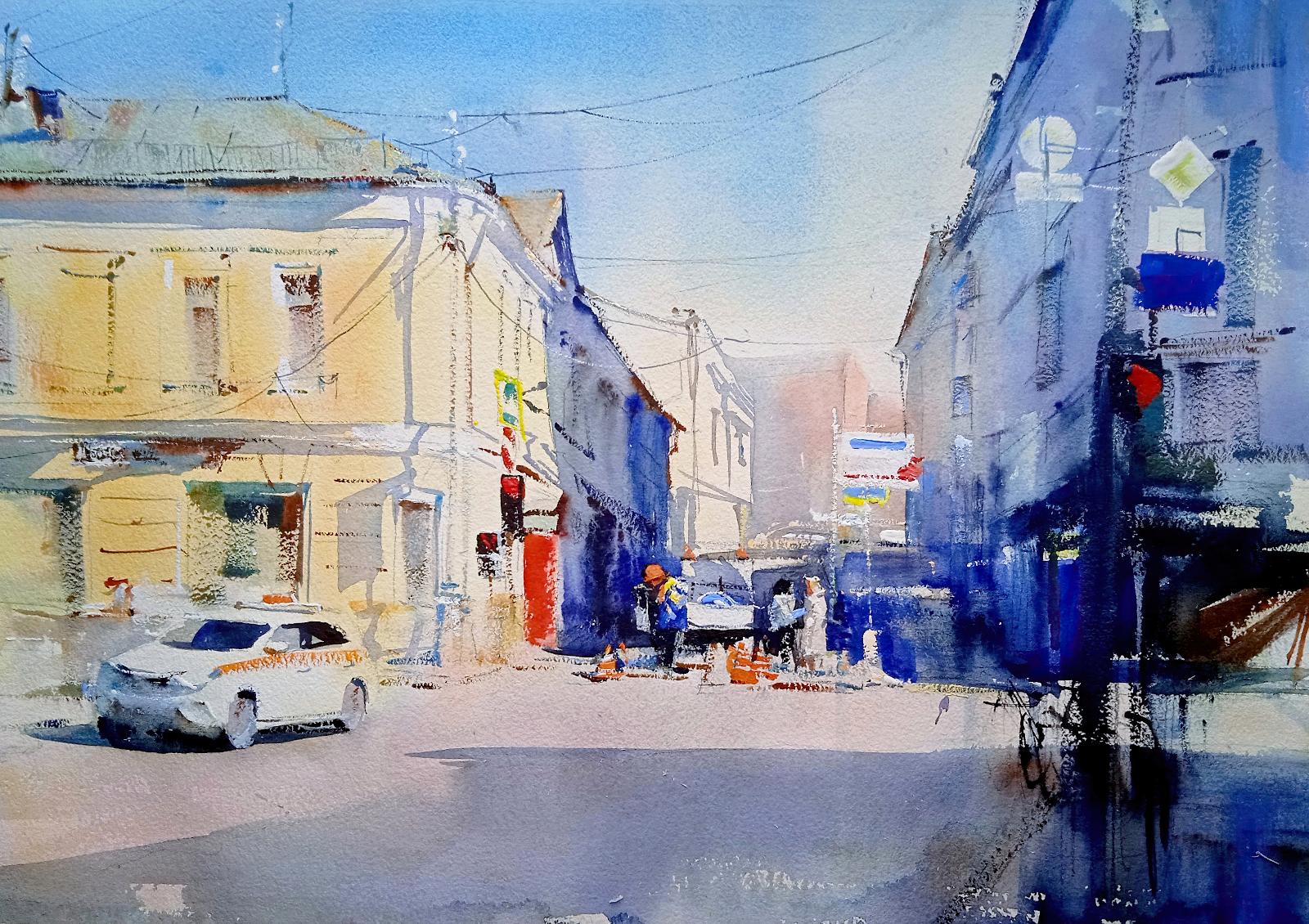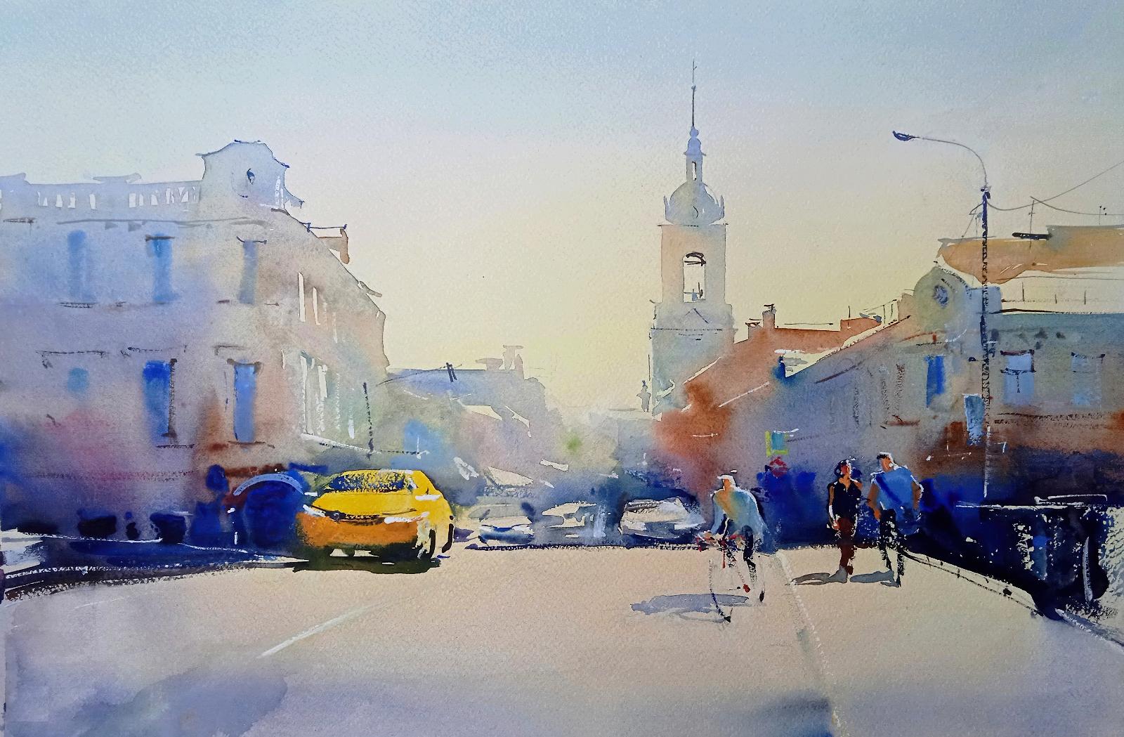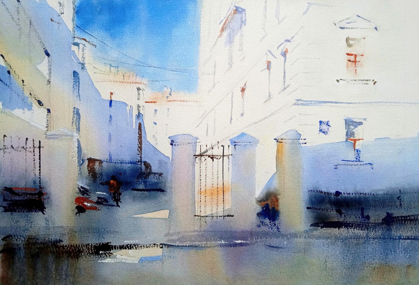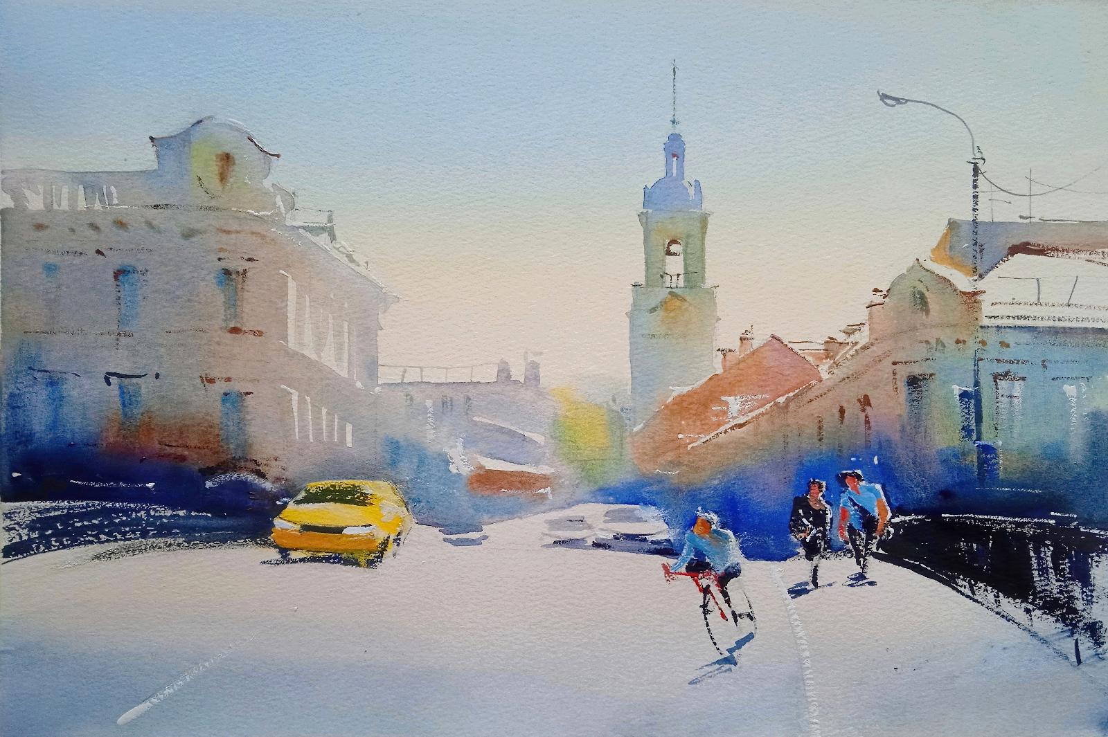 Let’s take a walk on a warm, sunny day, where light, shadows, and movement fill the city with life. In this lesson, we will practice maintaining the lightness of watercolor and avoiding overworking the painting.