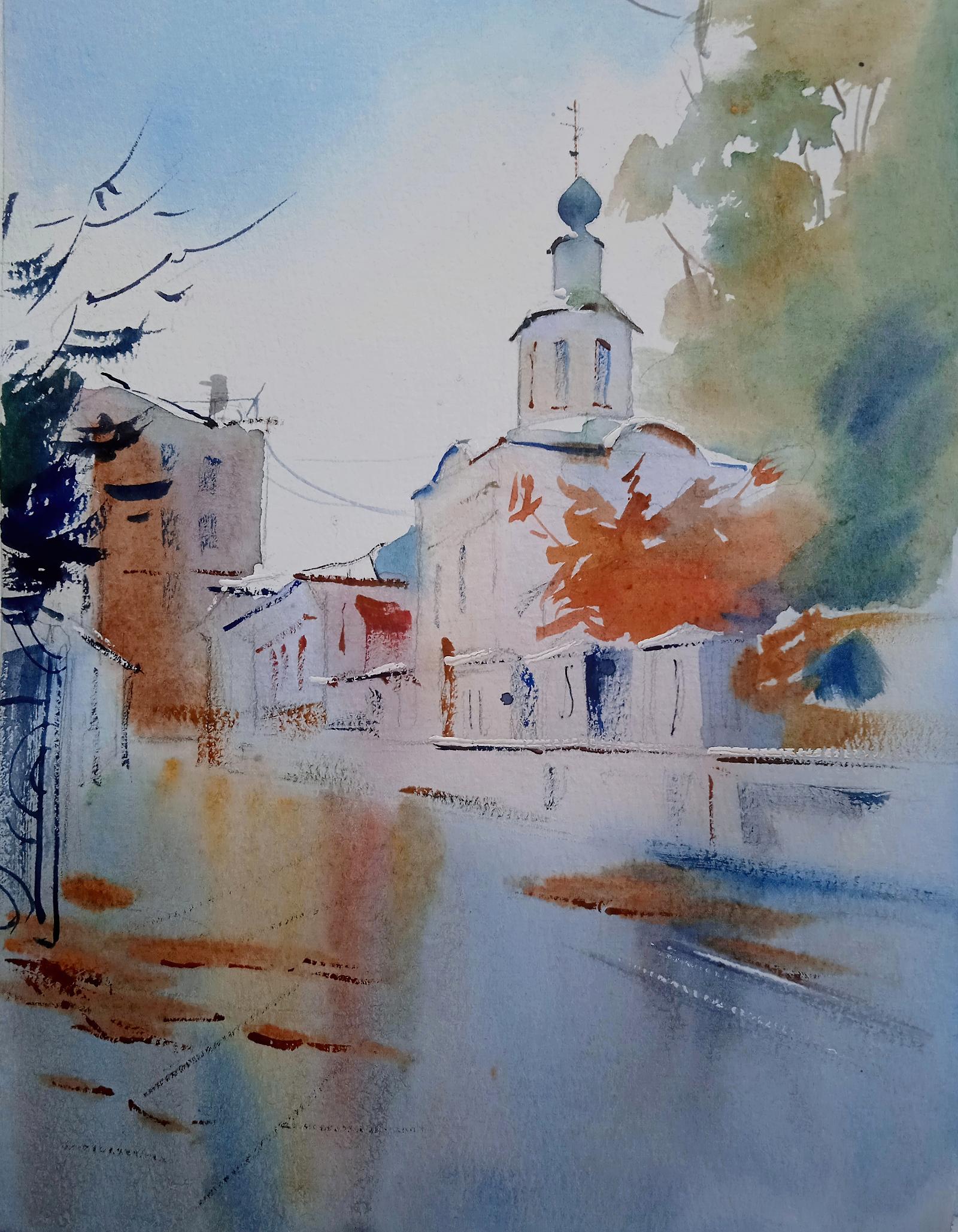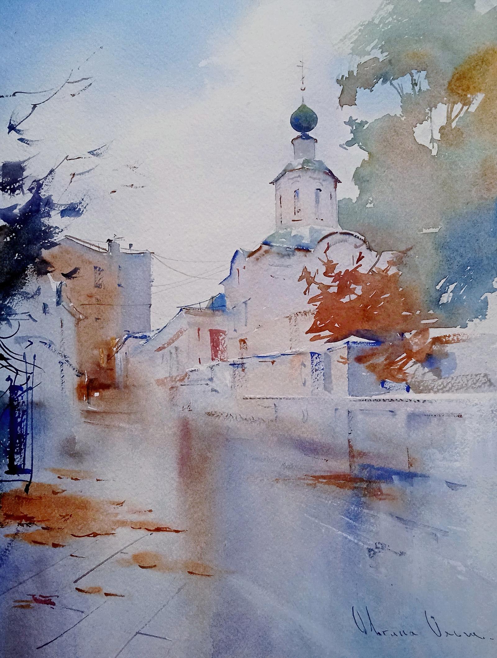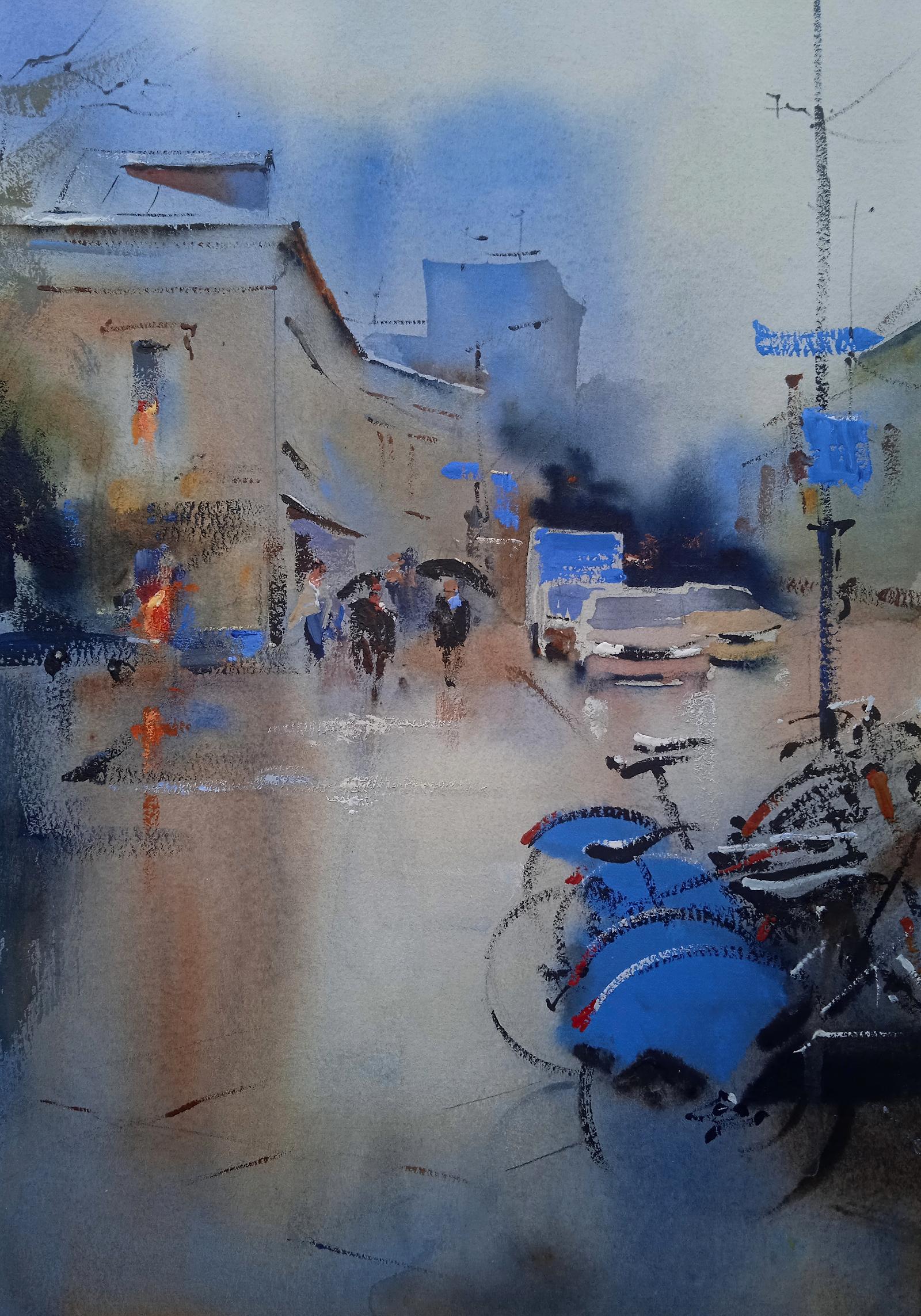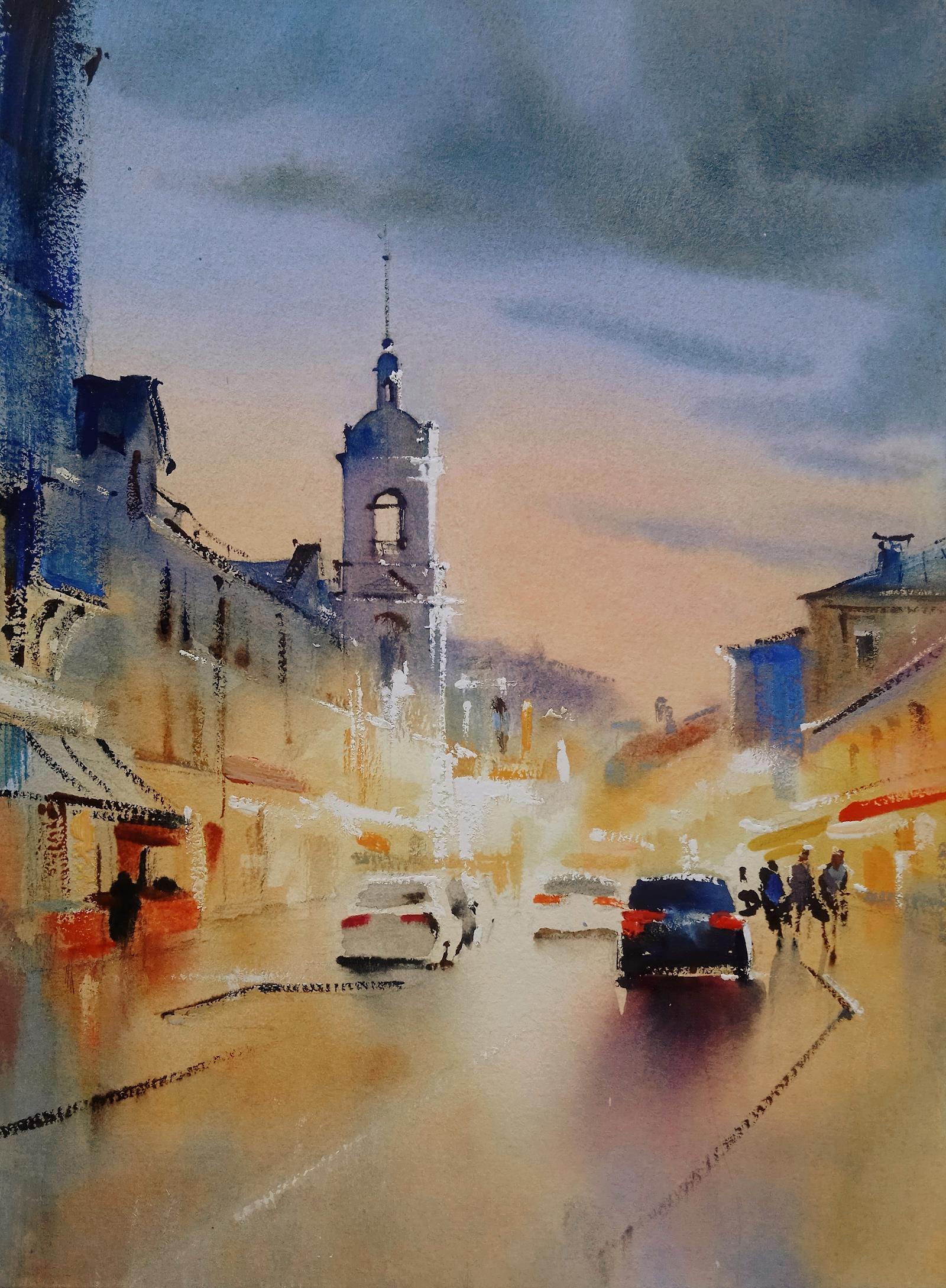 In this lesson we will immerse ourselves in the atmosphere of a quiet rain and moist air. Watching the movement of water on paper, we will create soft highlights, blurred silhouettes, and the feeling of a rainy day.