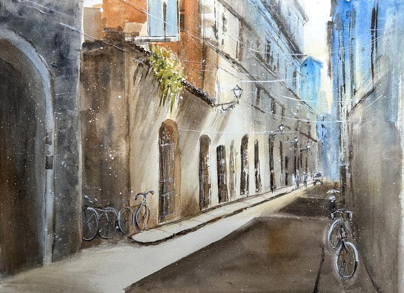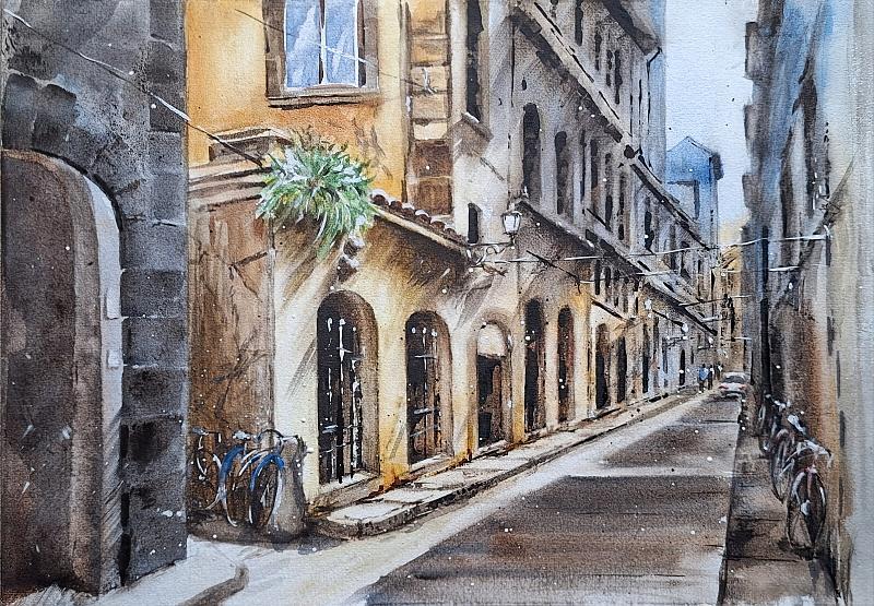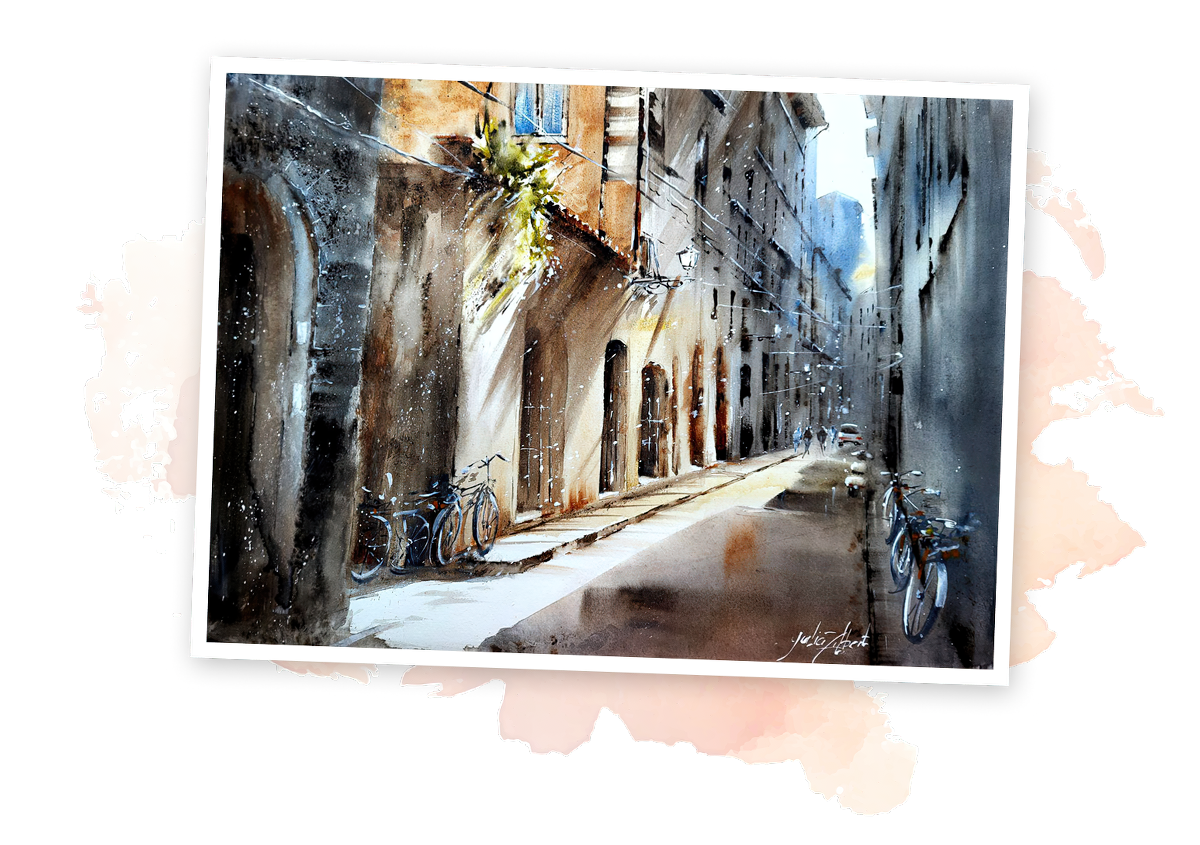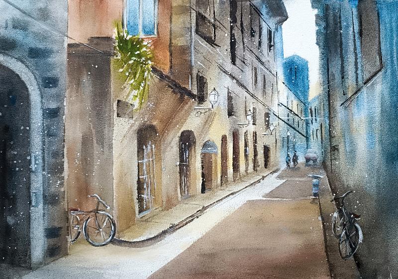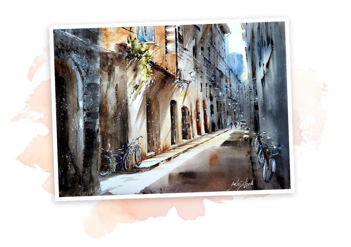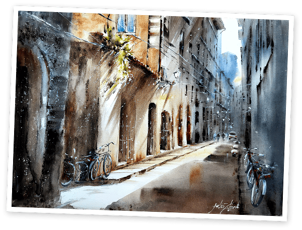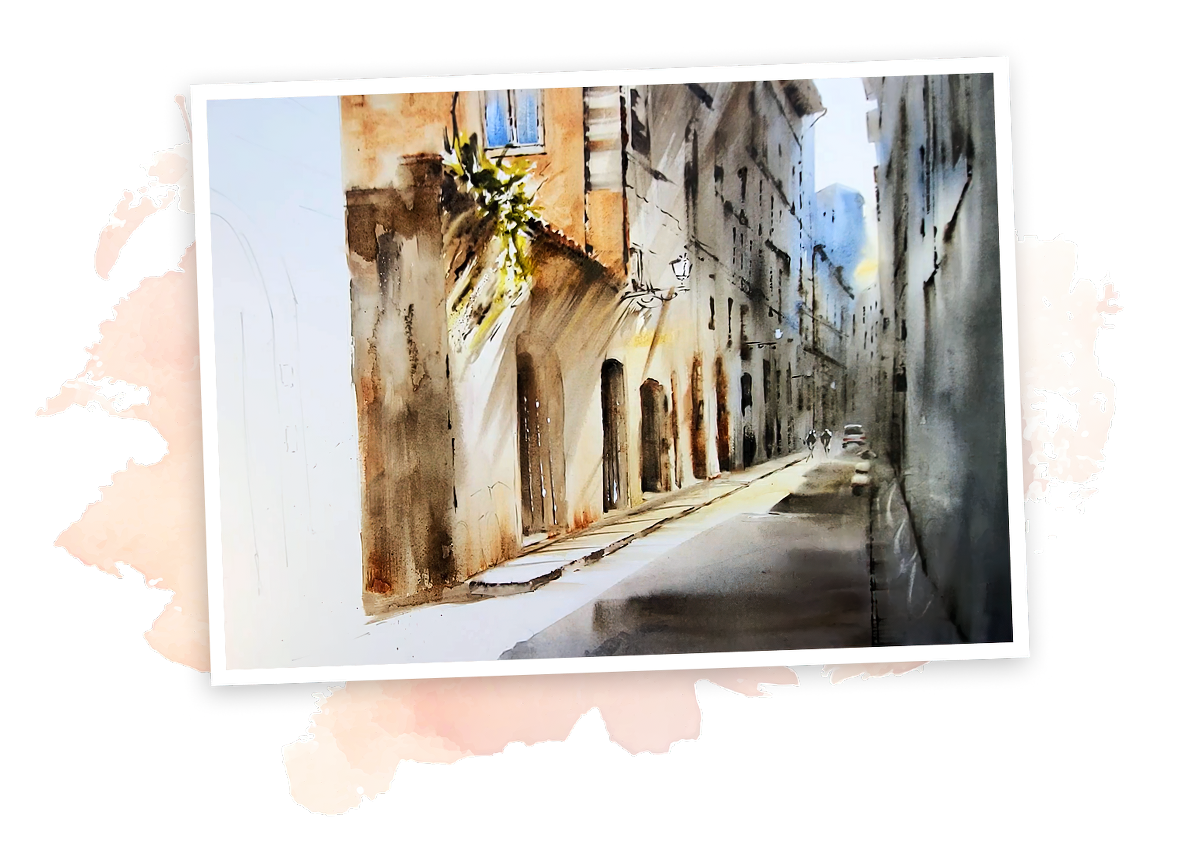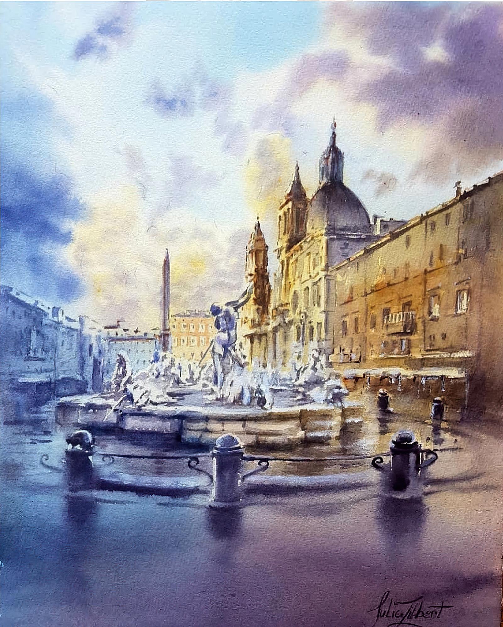 - continue painting without touching already painted areas, keeping watercolor in the «alla prima» style;
