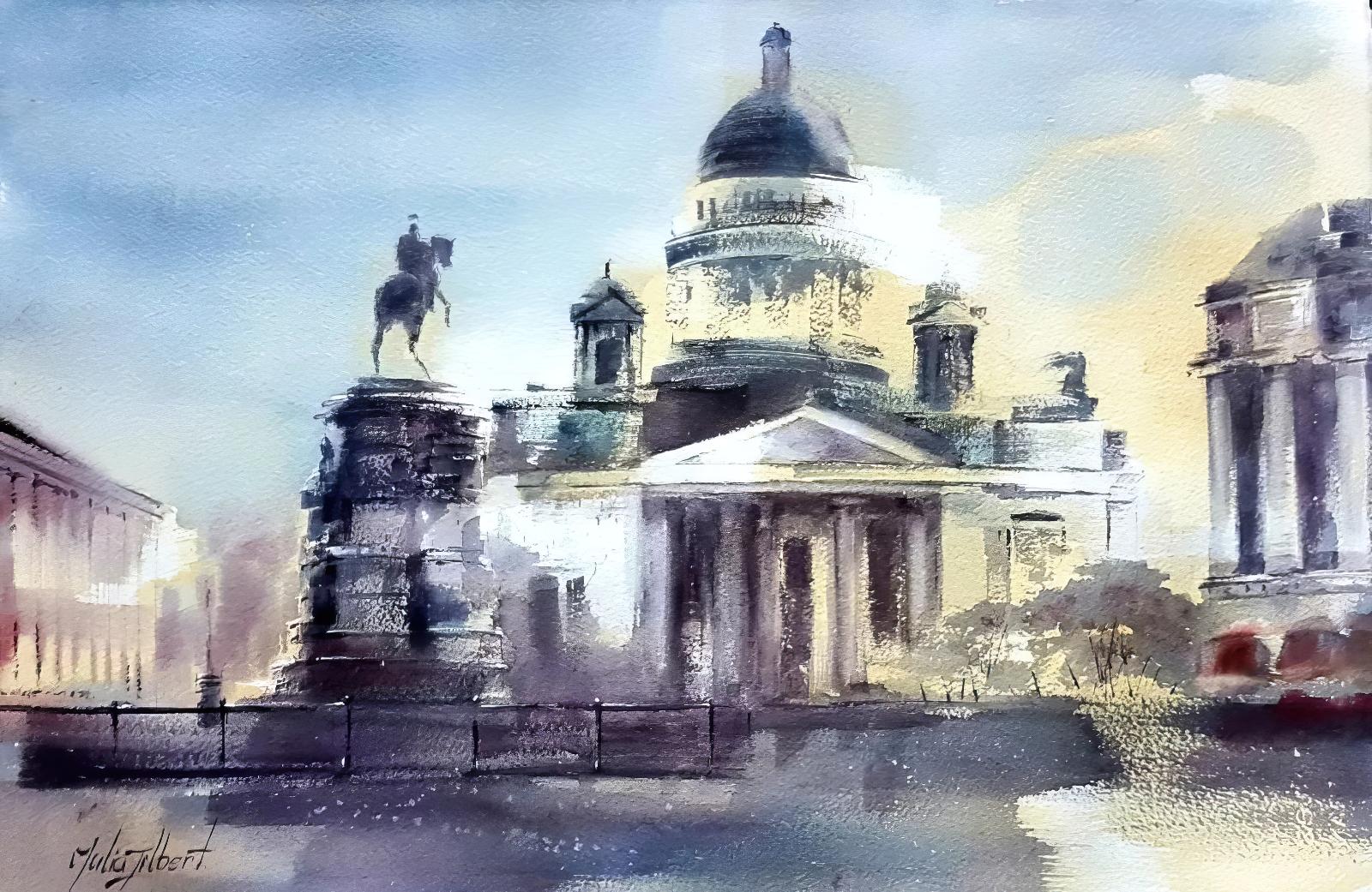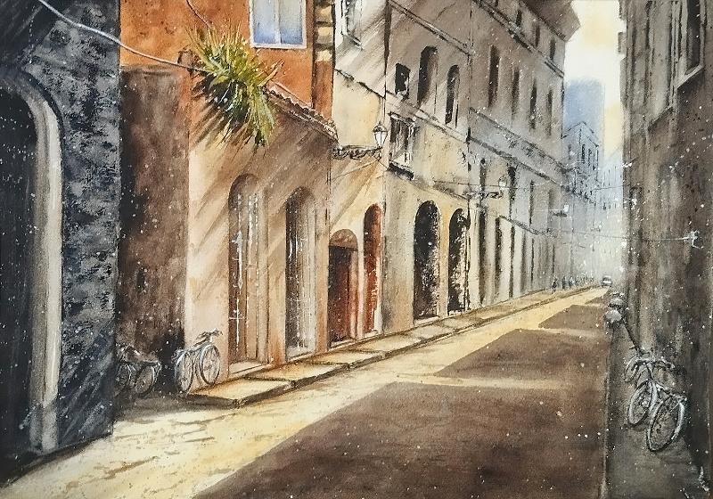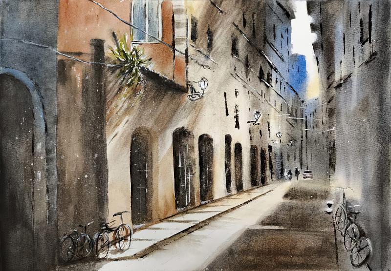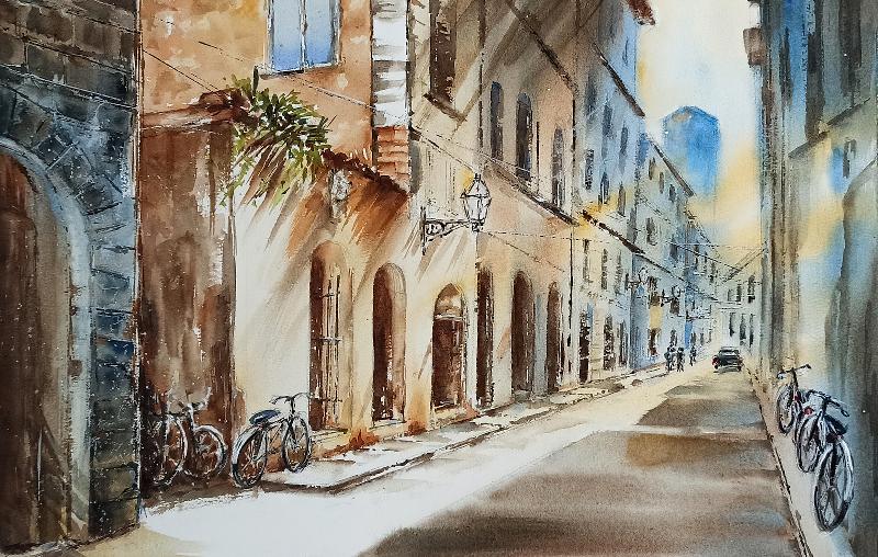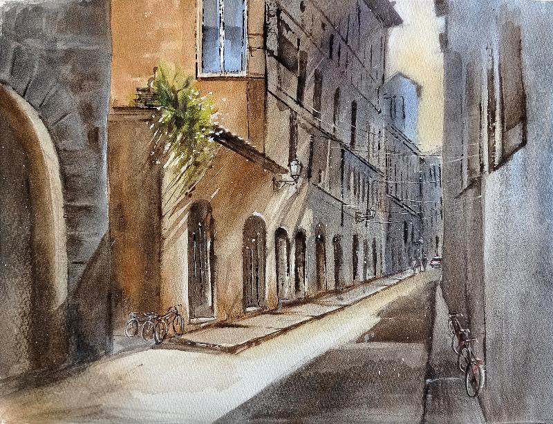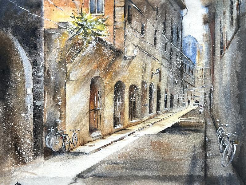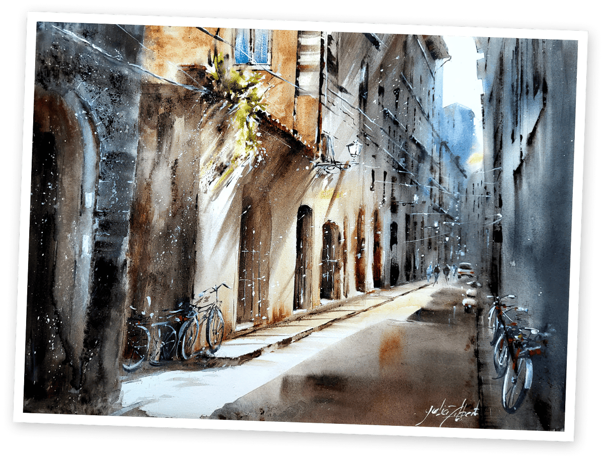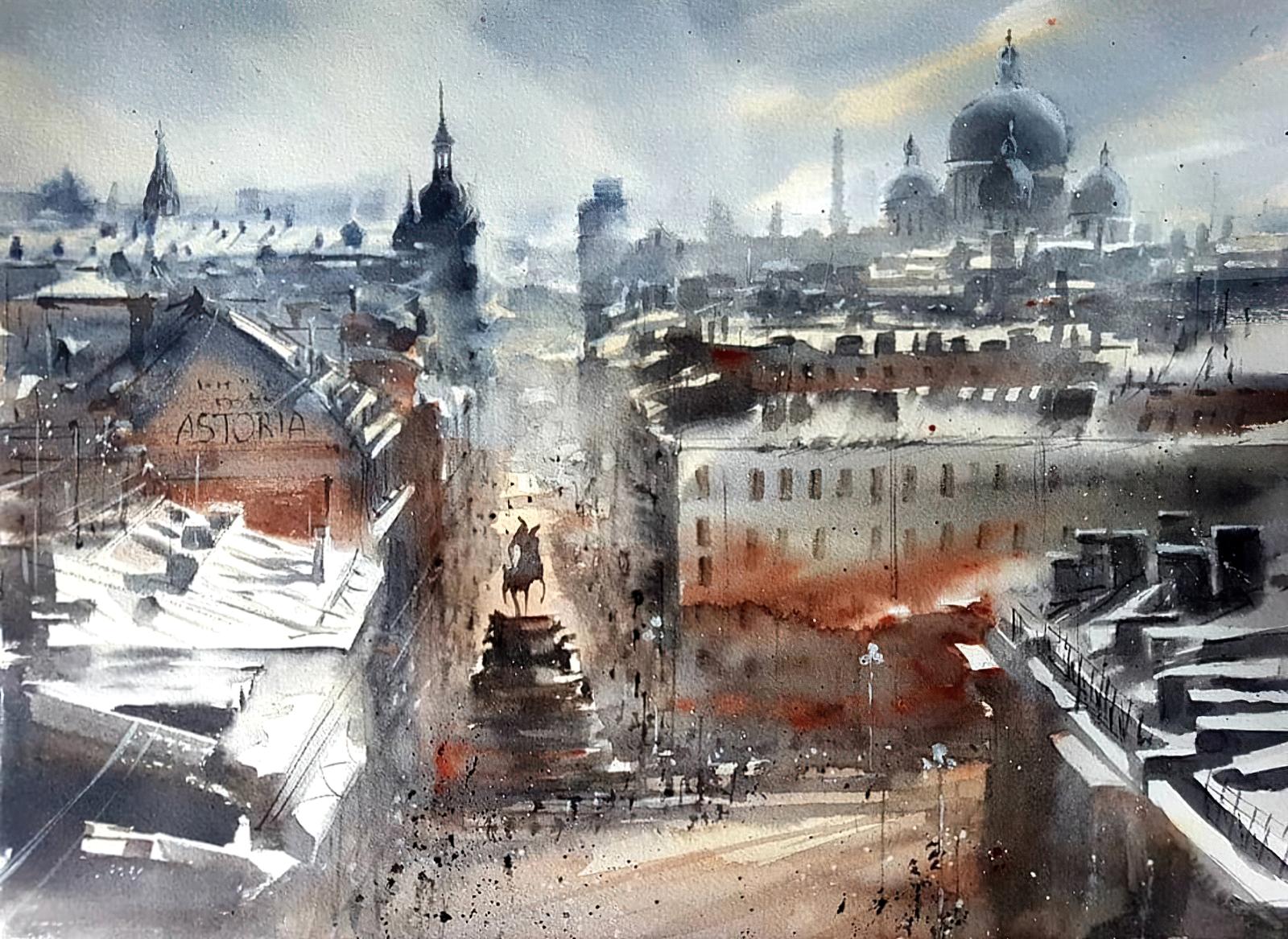 - continue painting without touching already painted areas, keeping watercolor in the «alla prima» style;