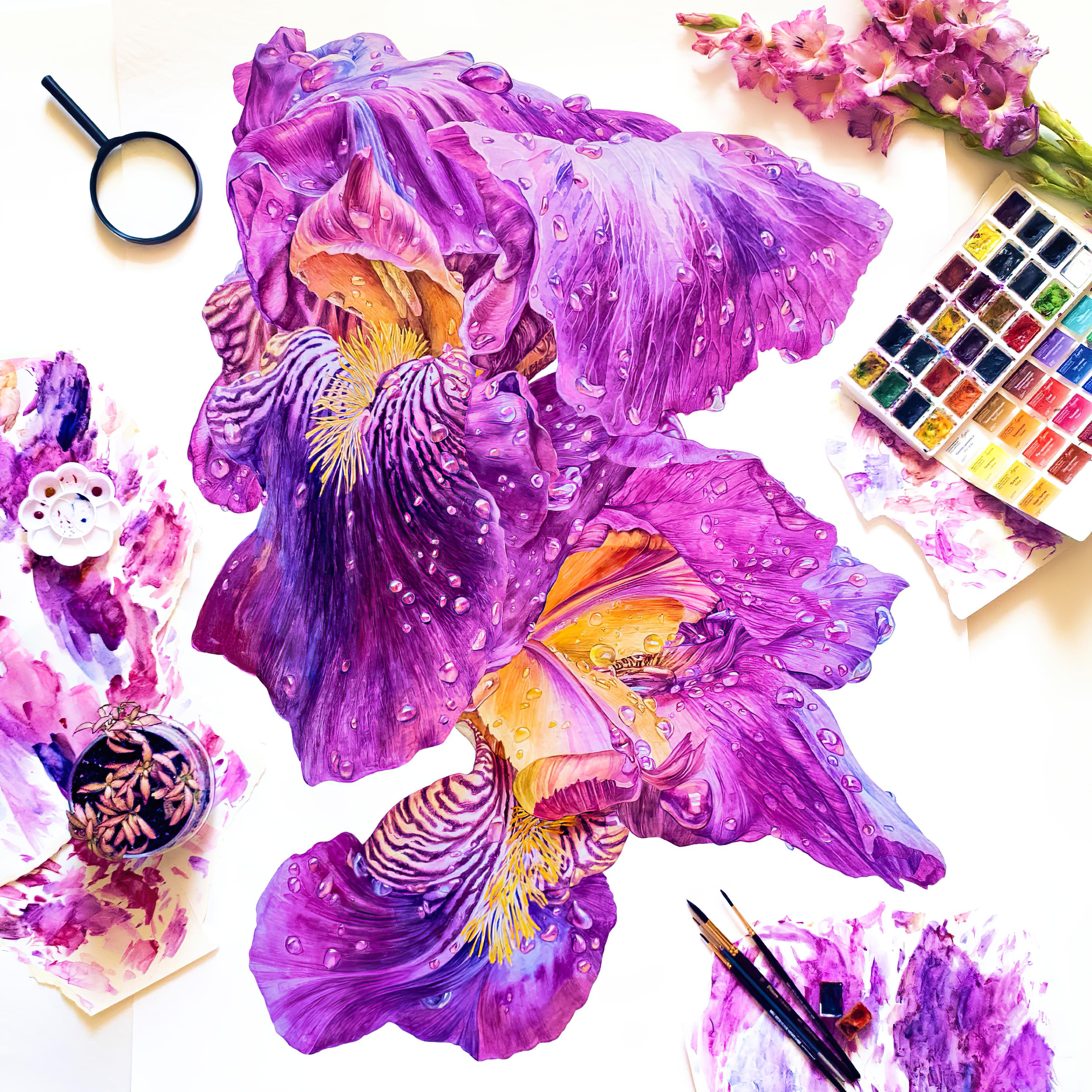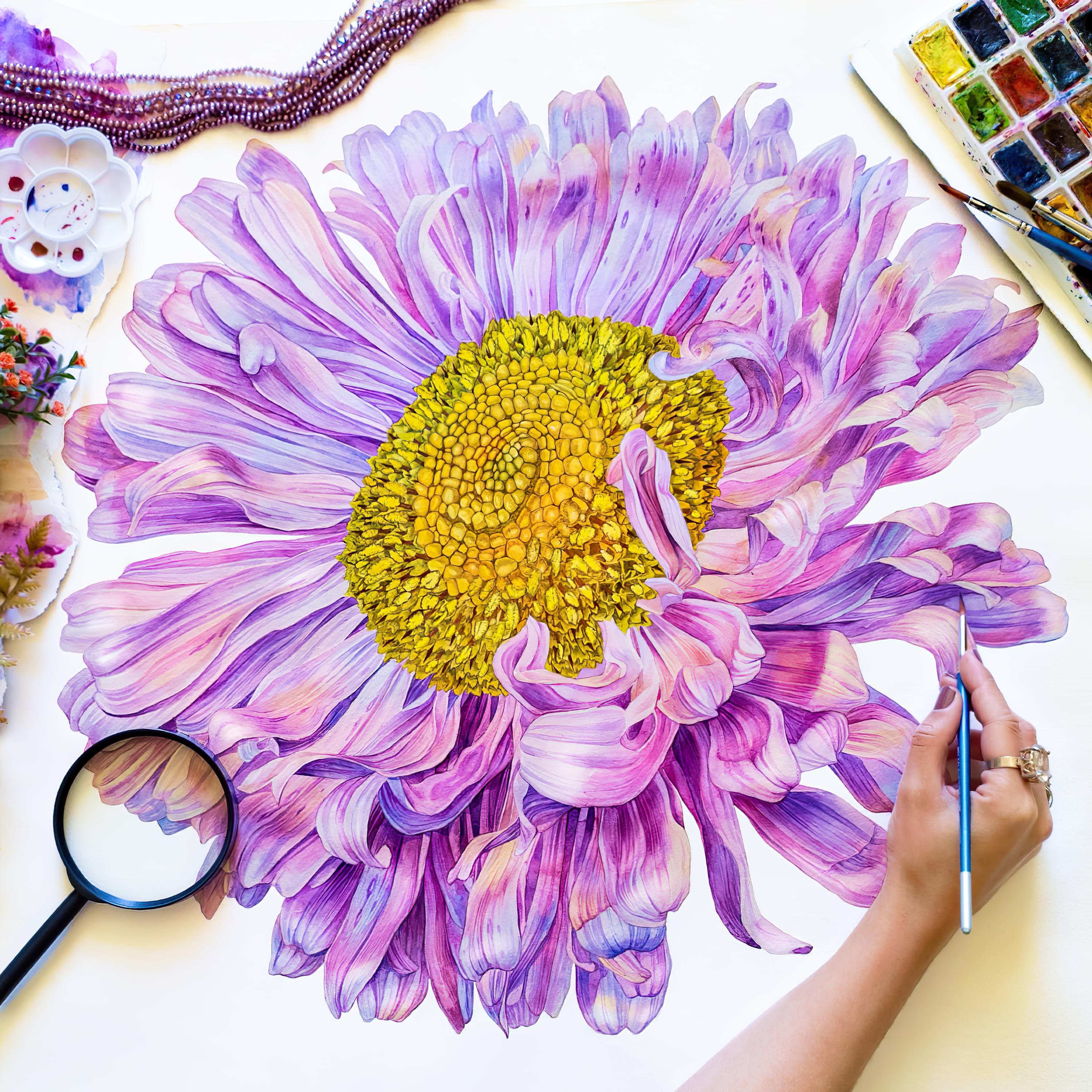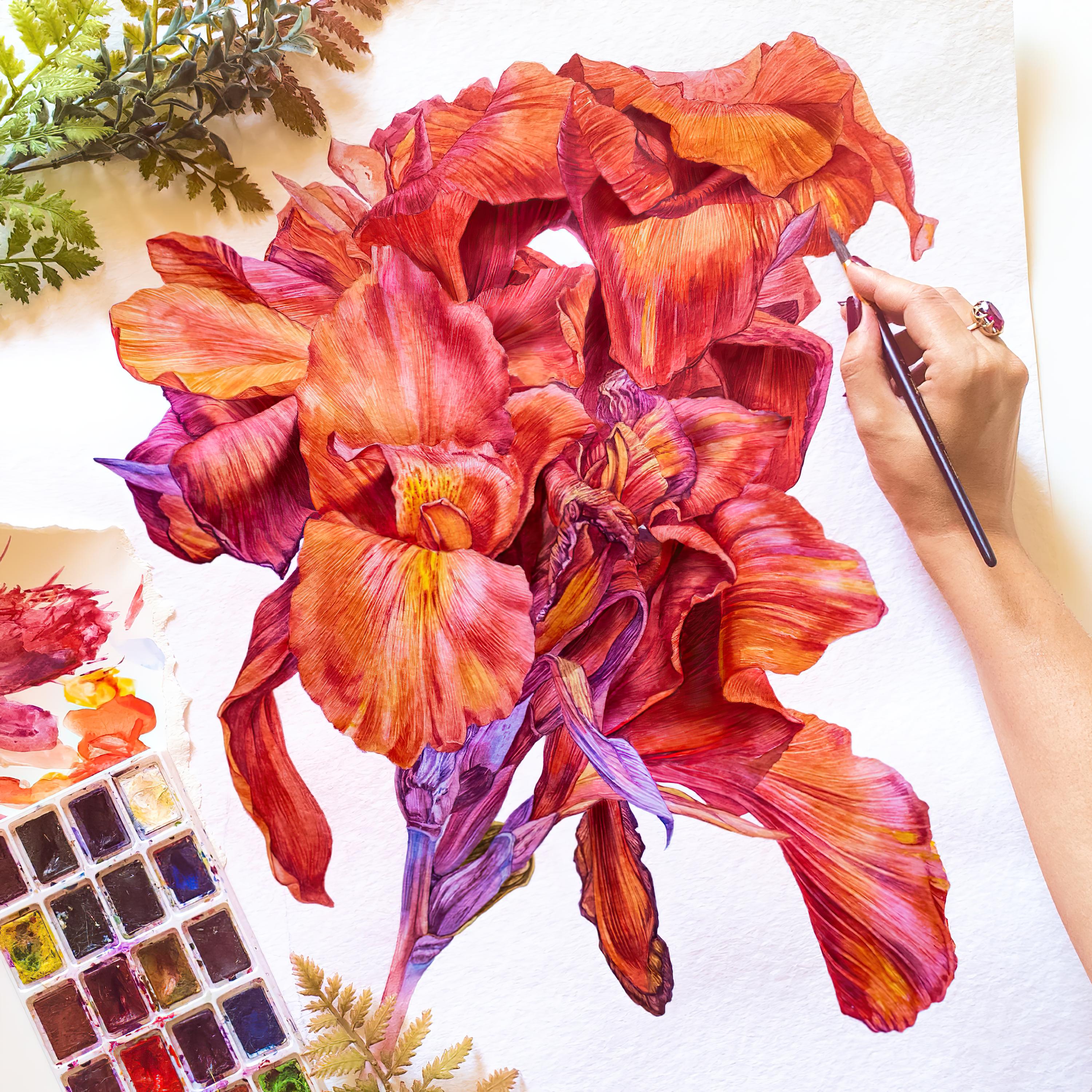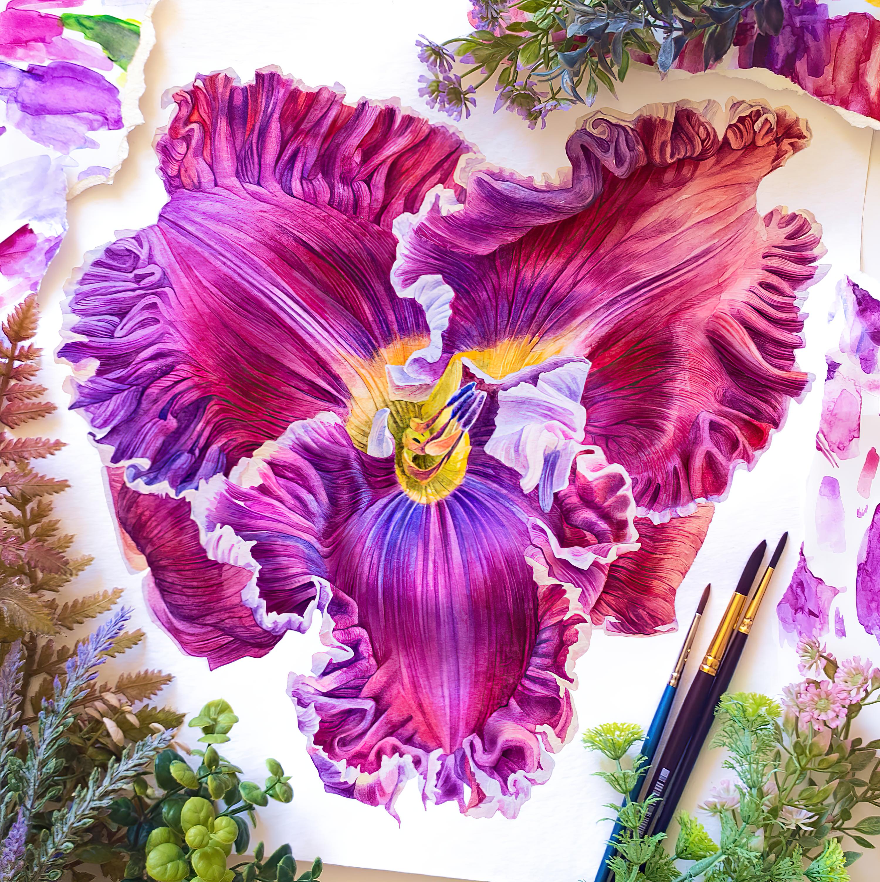- Perform translucent washes with color interspersed with speckles in wet-on-wet technique to imitate the natural texture of petals;