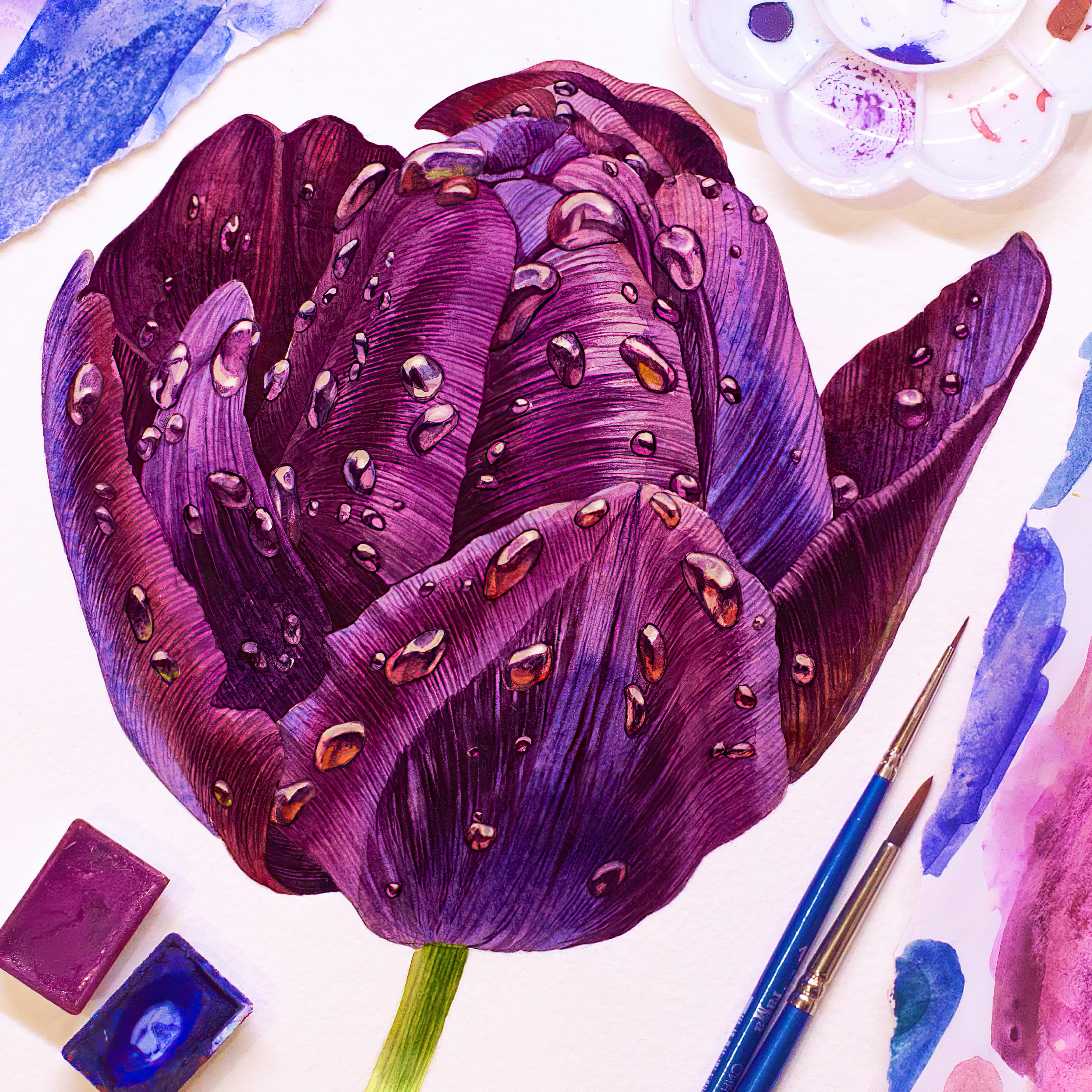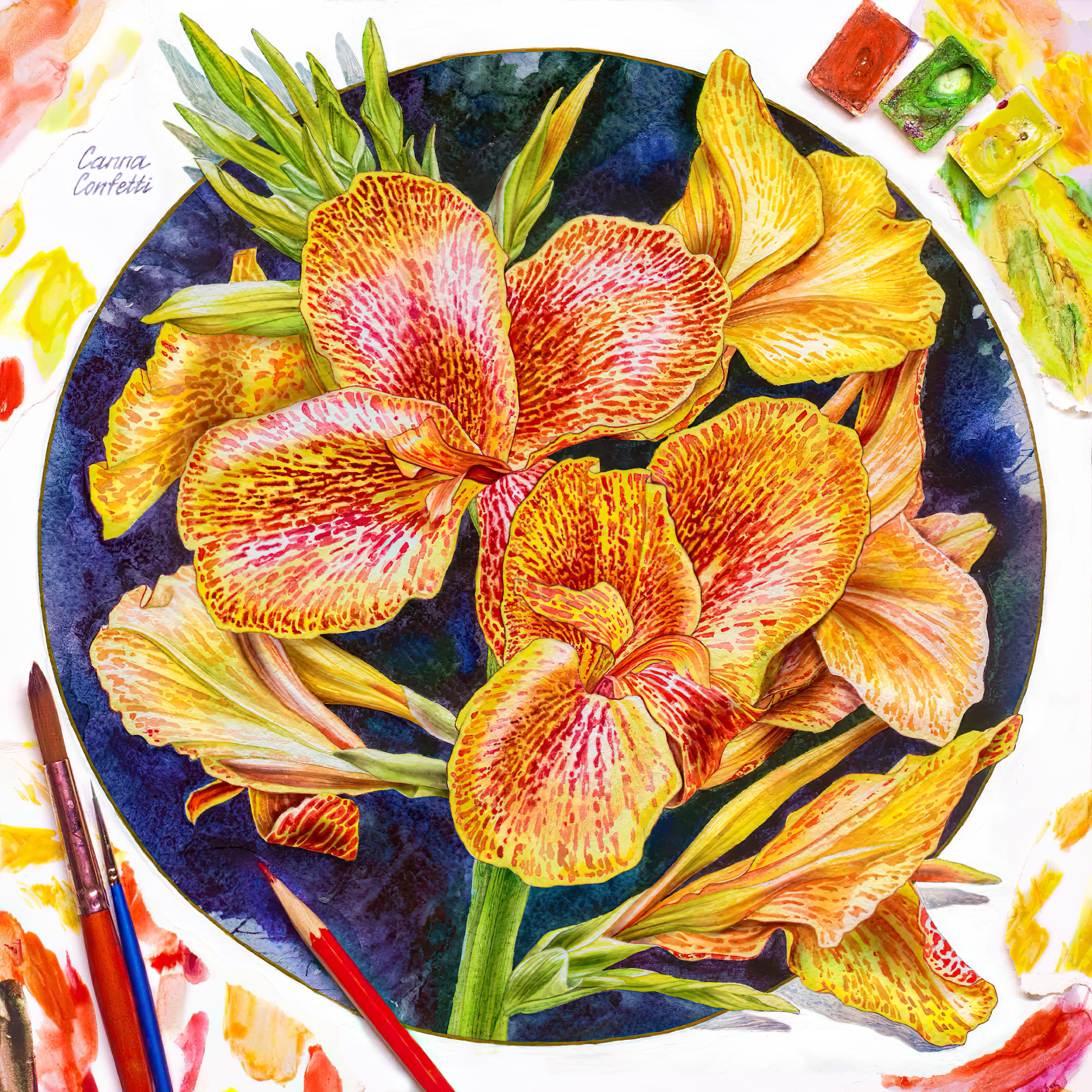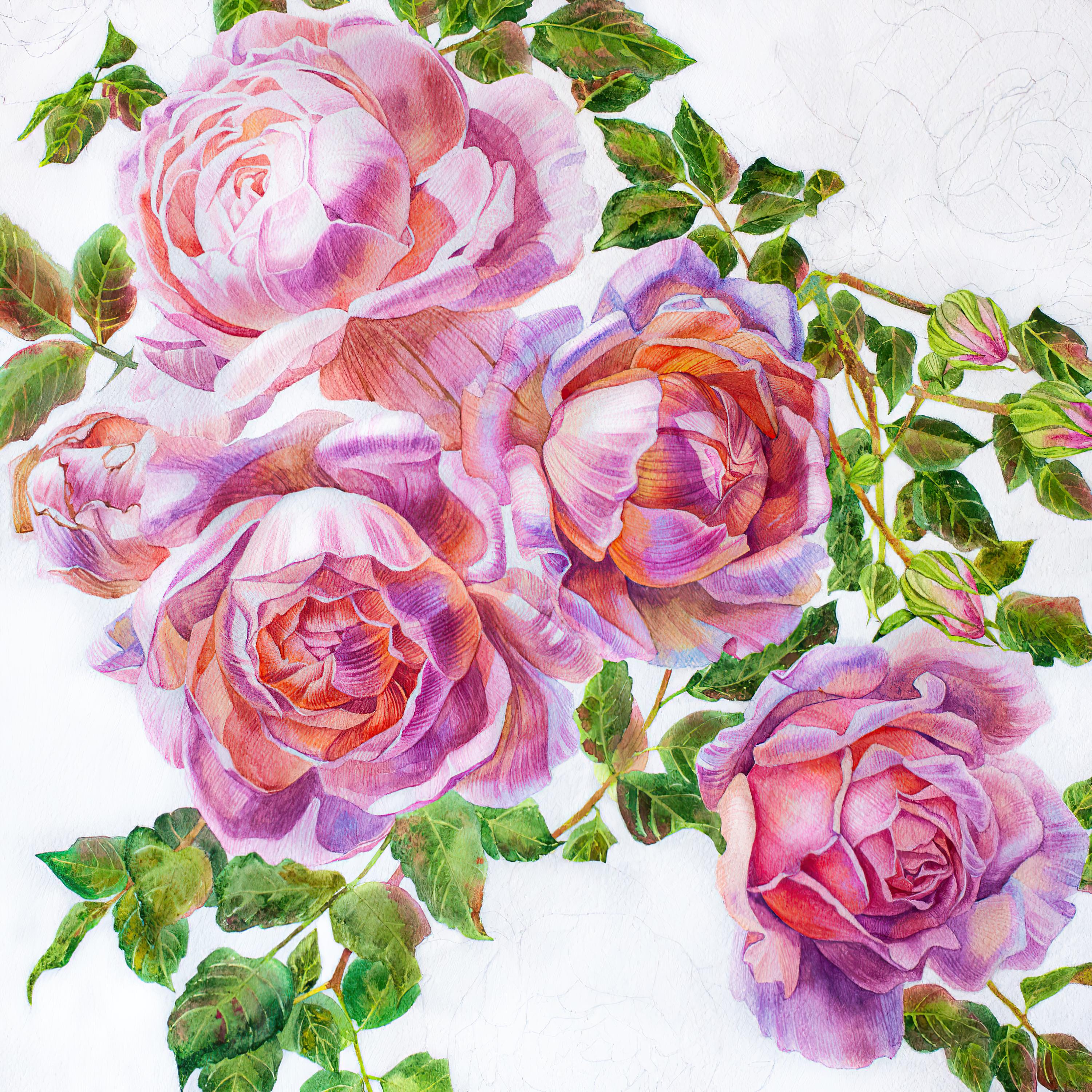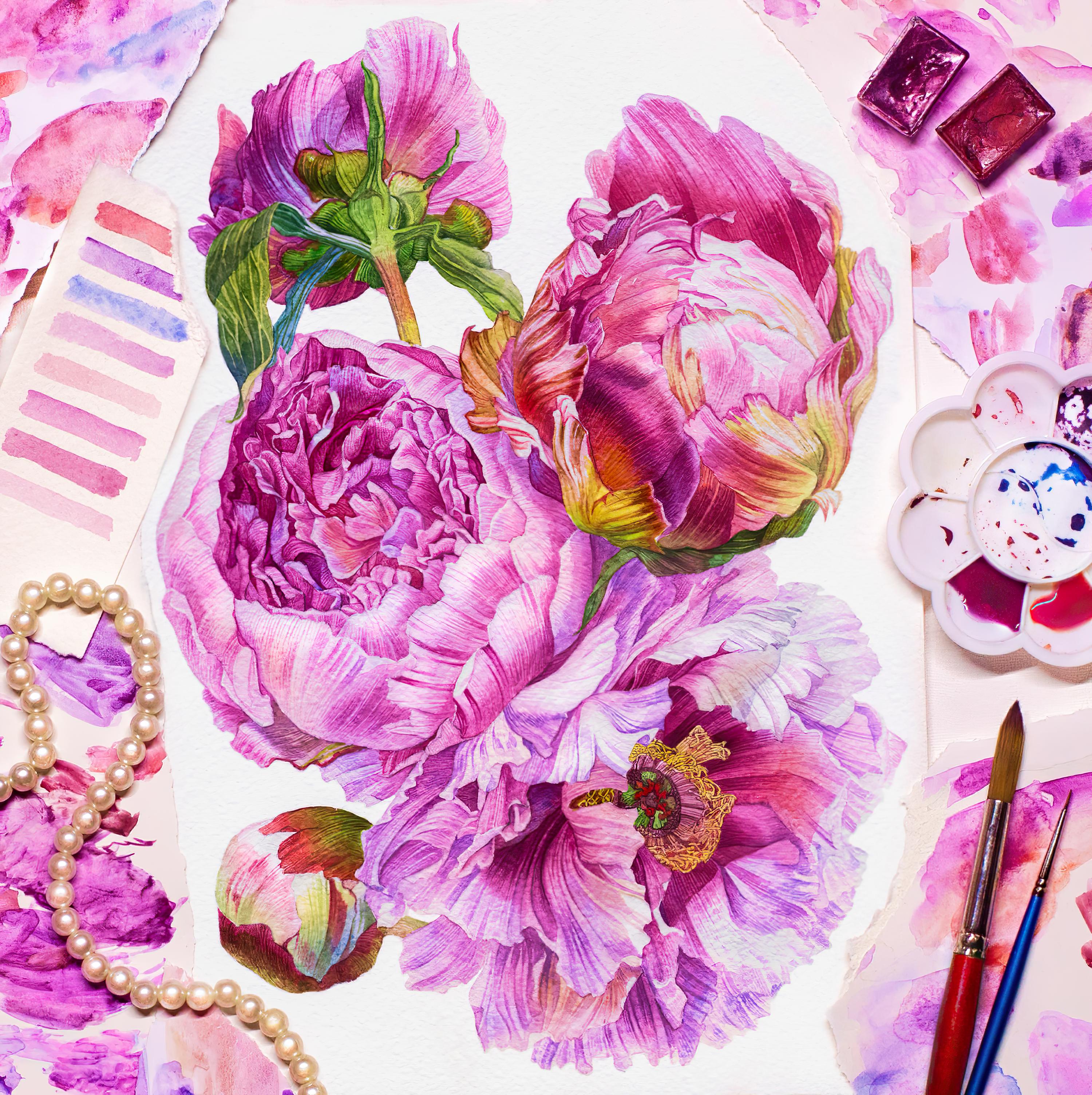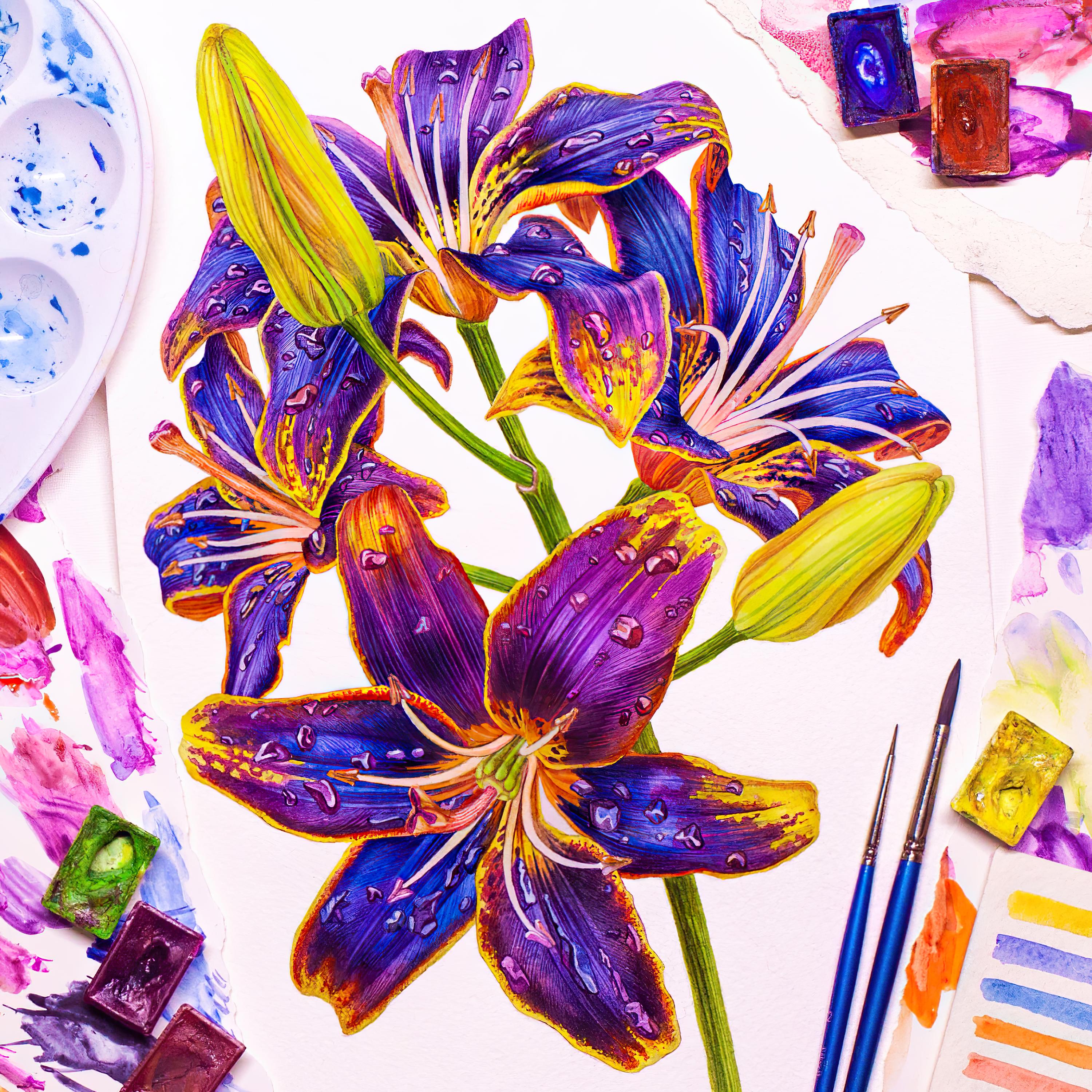 - Perform translucent washes with color interspersed with speckles in wet-on-wet technique to imitate the natural texture of petals;