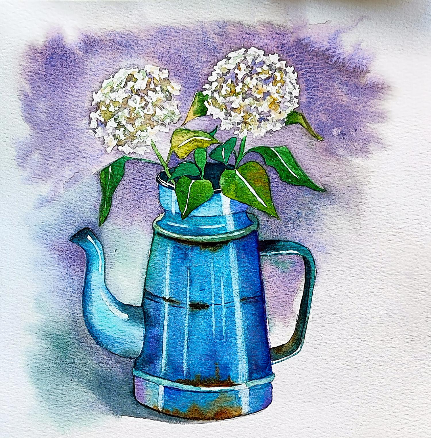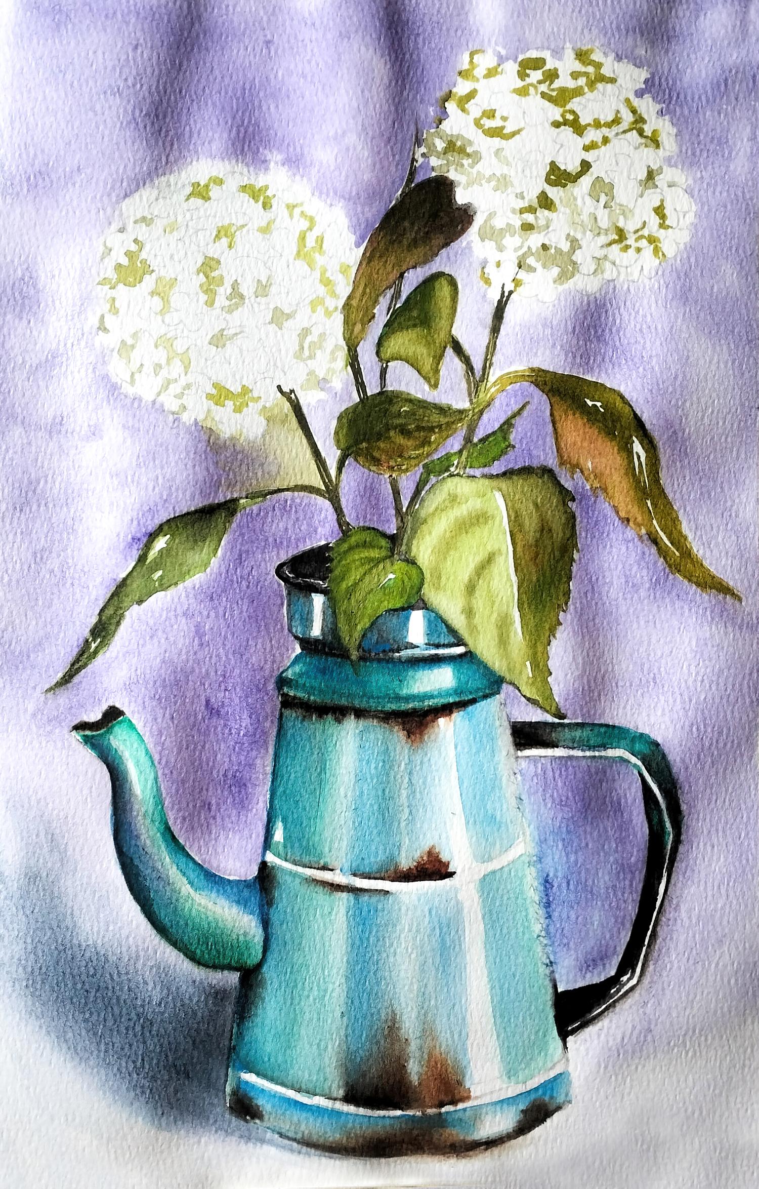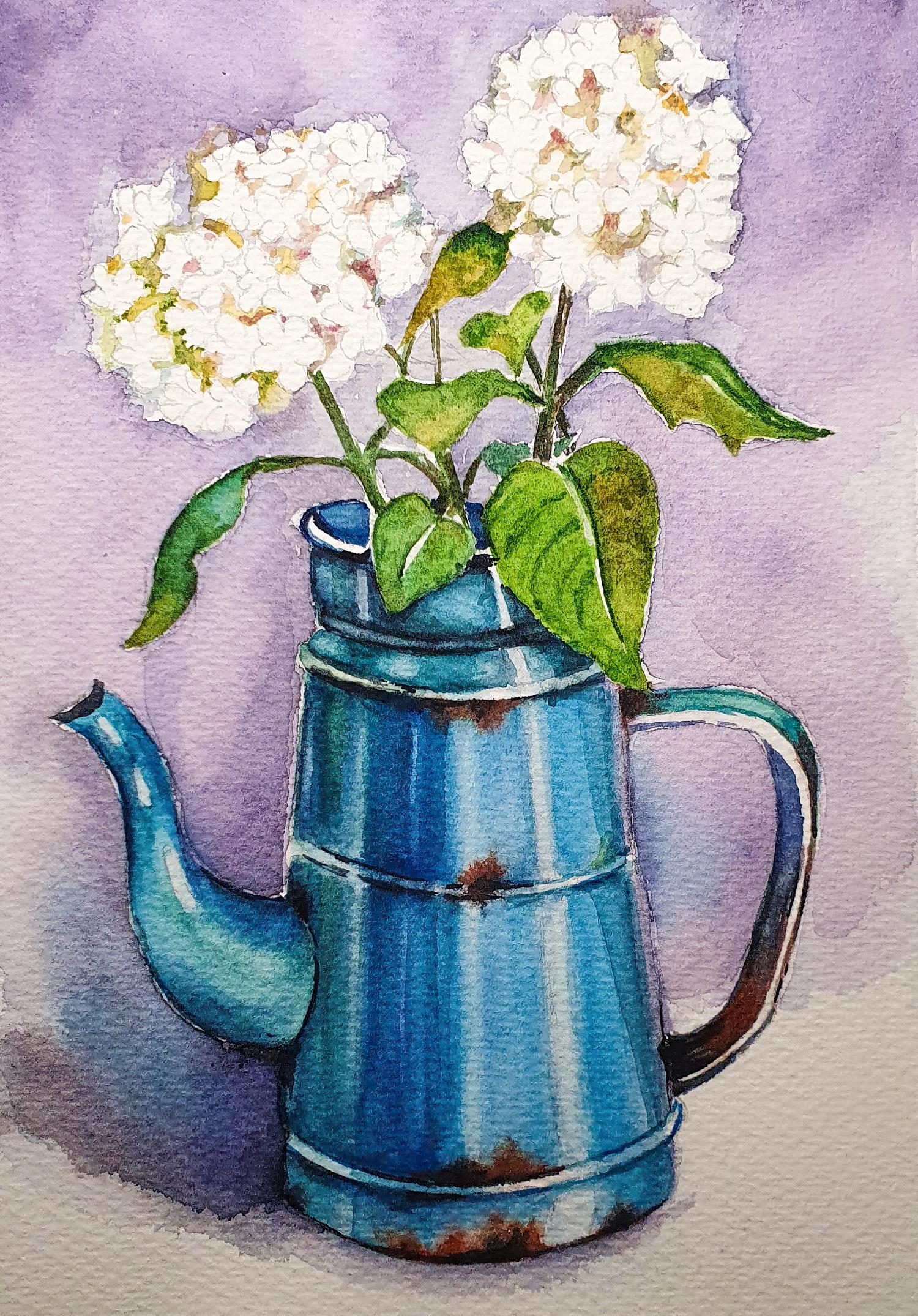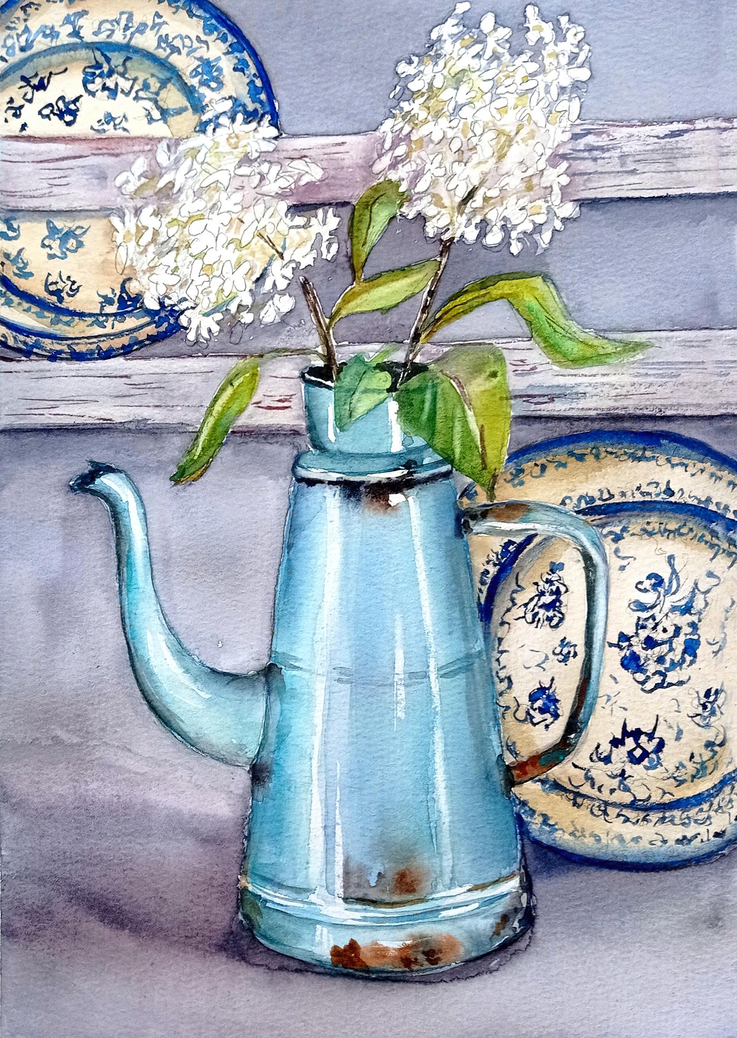 - learn how to convey the texture and color of an enamel teapot using smooth washes and glazing;
