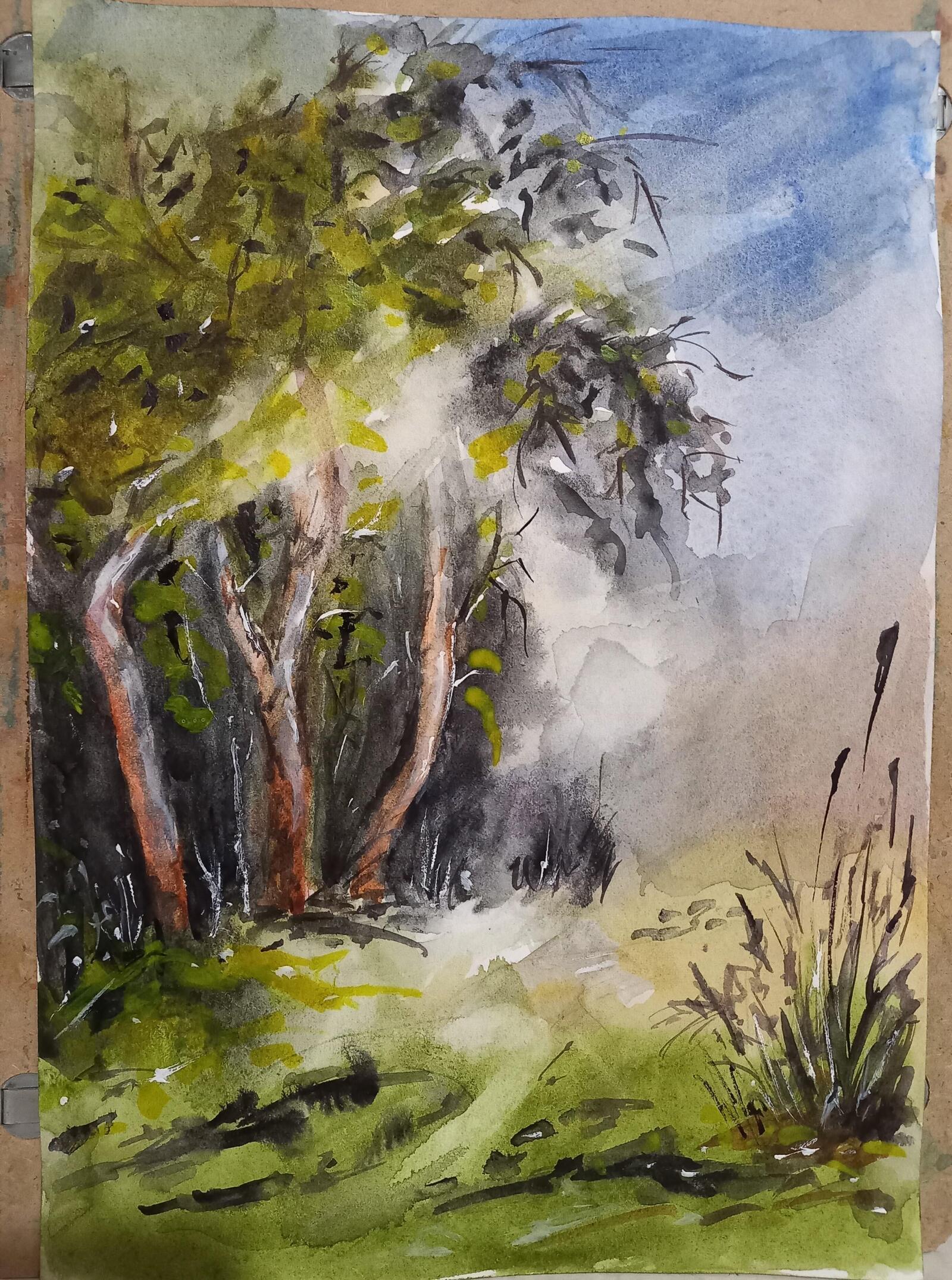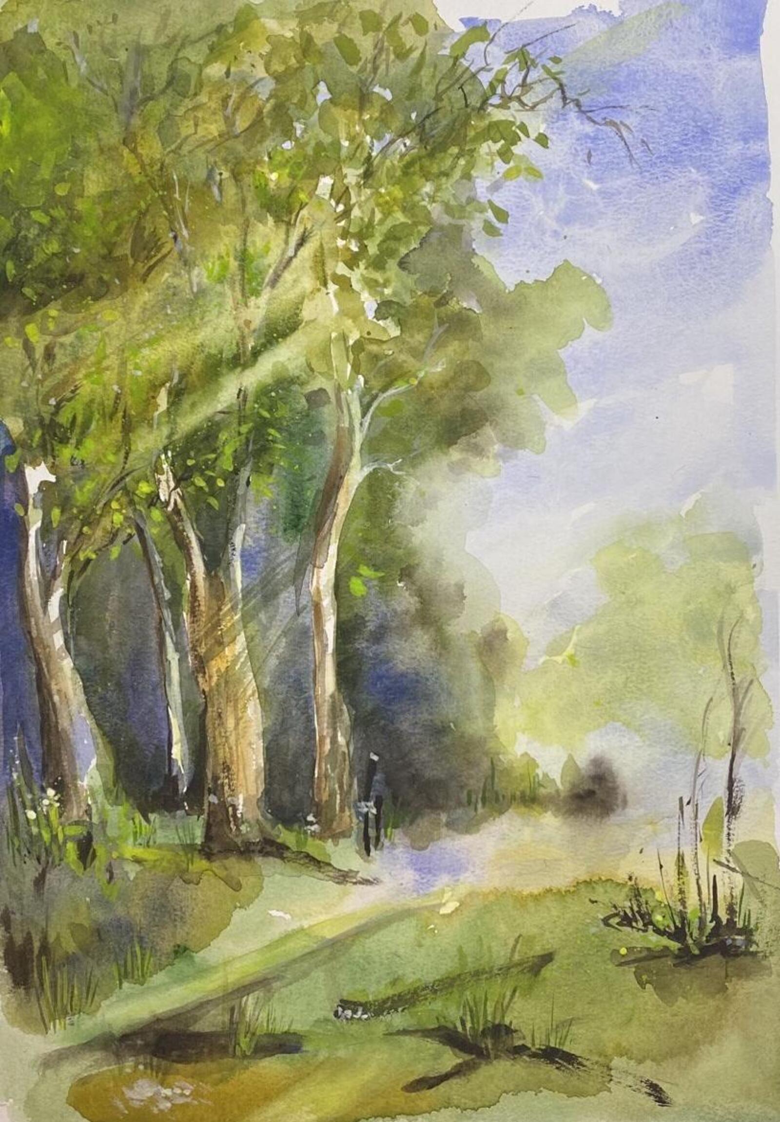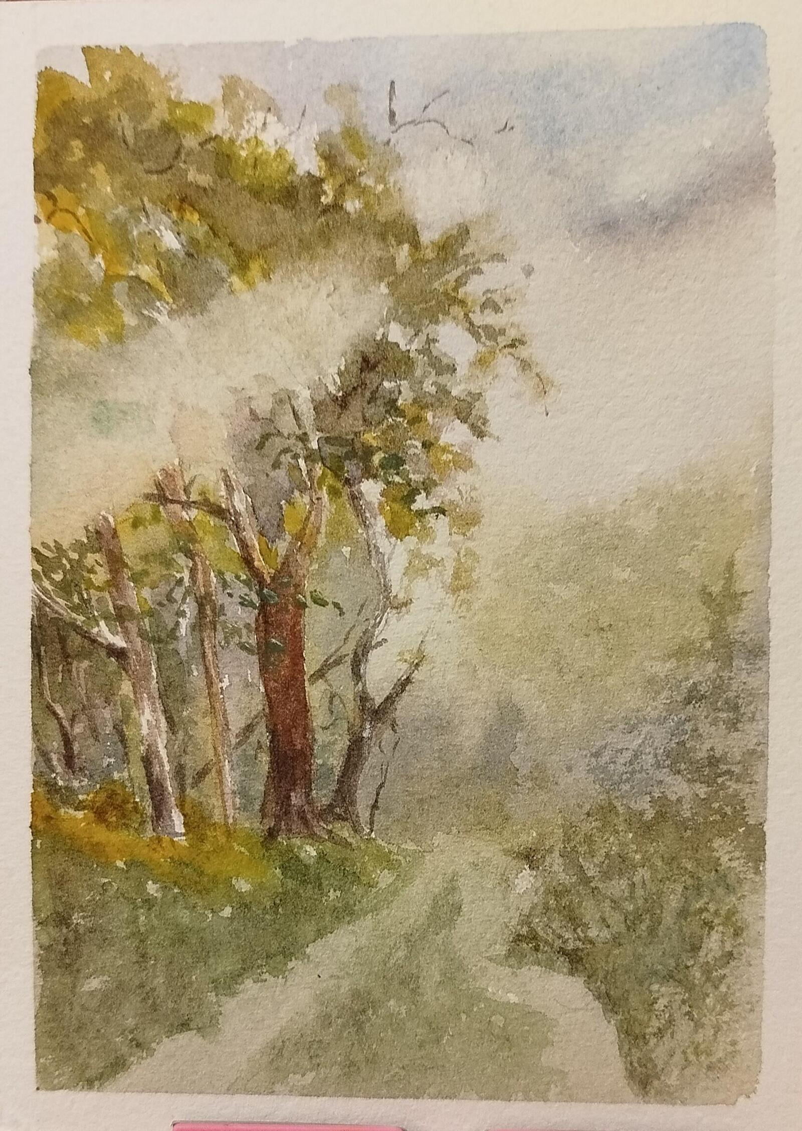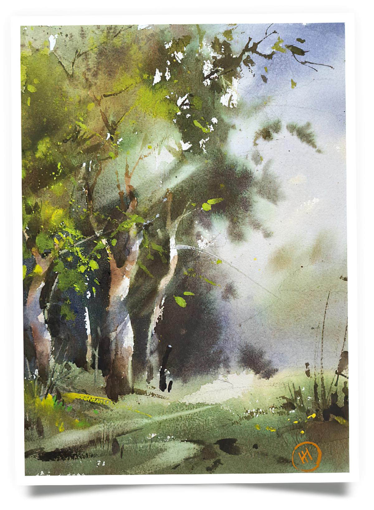 - it’s easy and smooth to work on the distant background first, and then go bold with big, juicy washes for the tree canopies