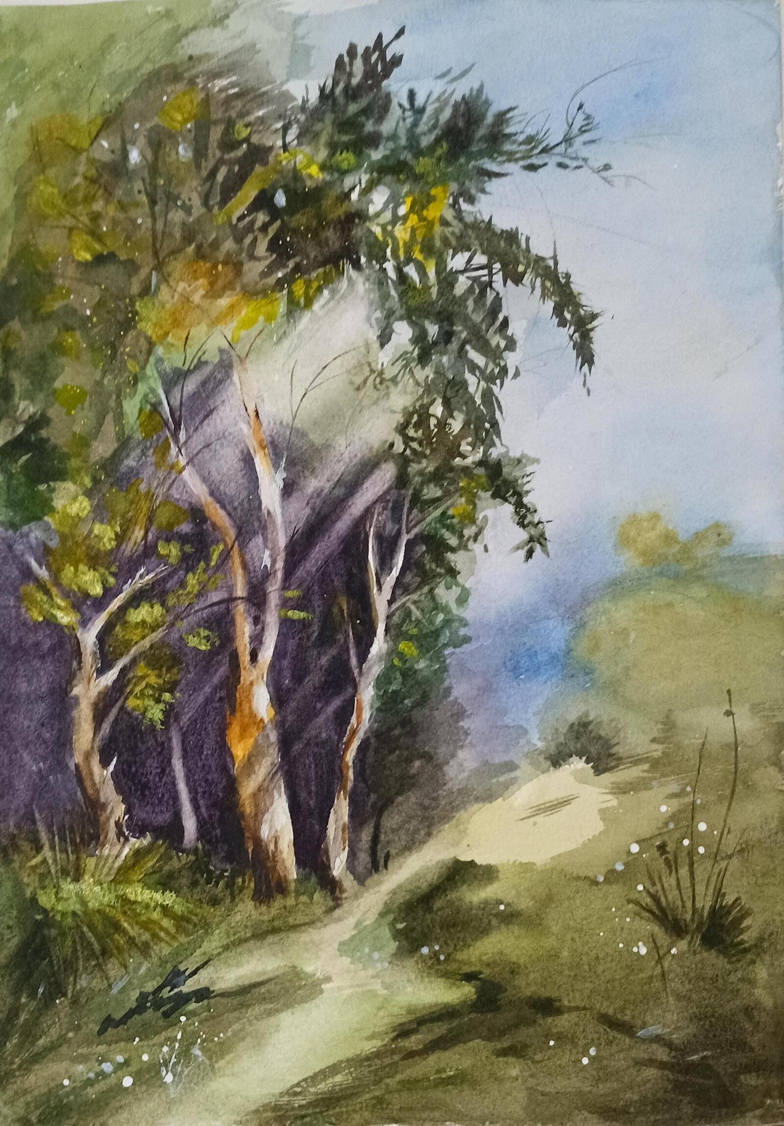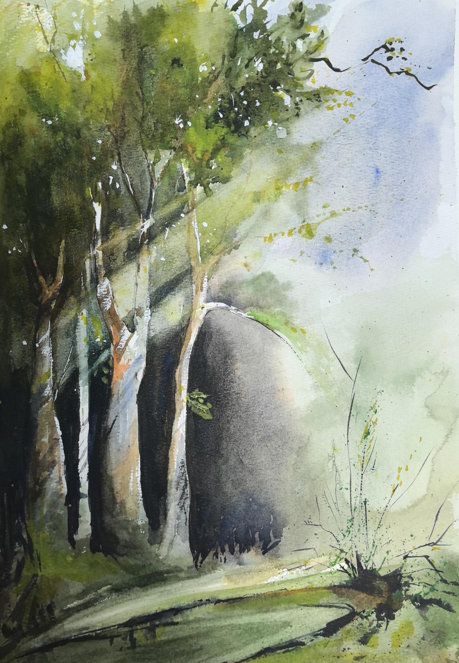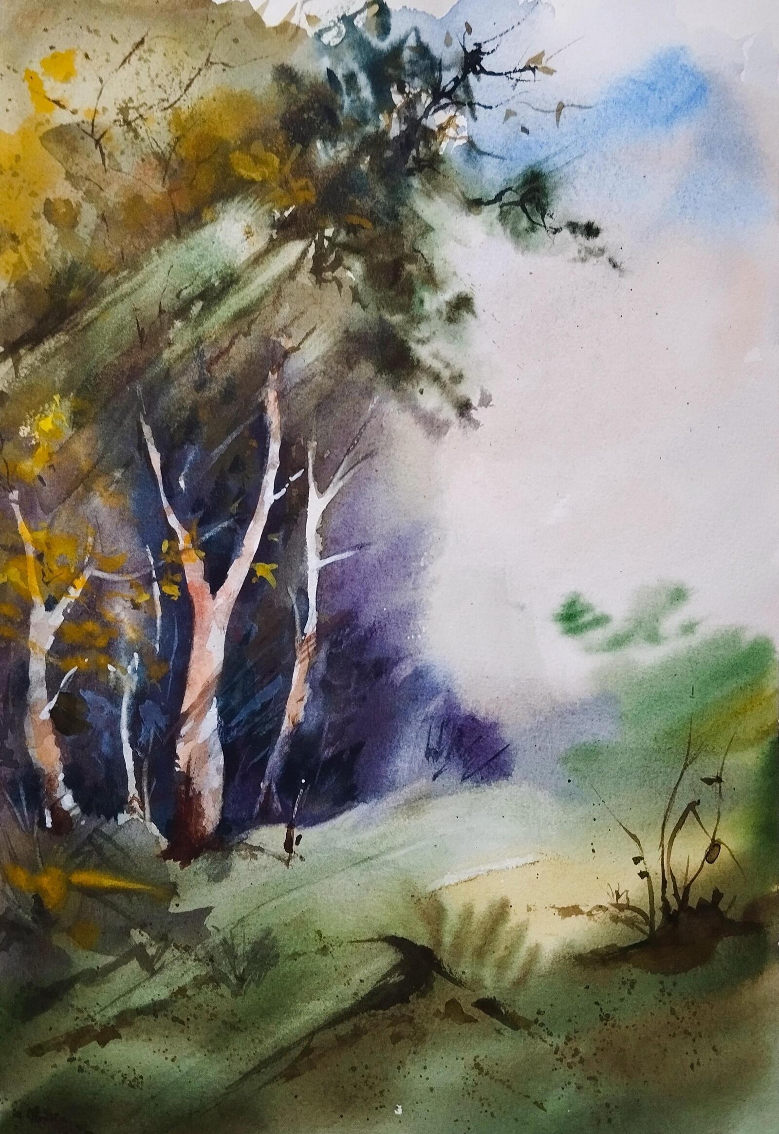 - it’s easy and smooth to work on the distant background first, and then go bold with big, juicy washes for the tree canopies