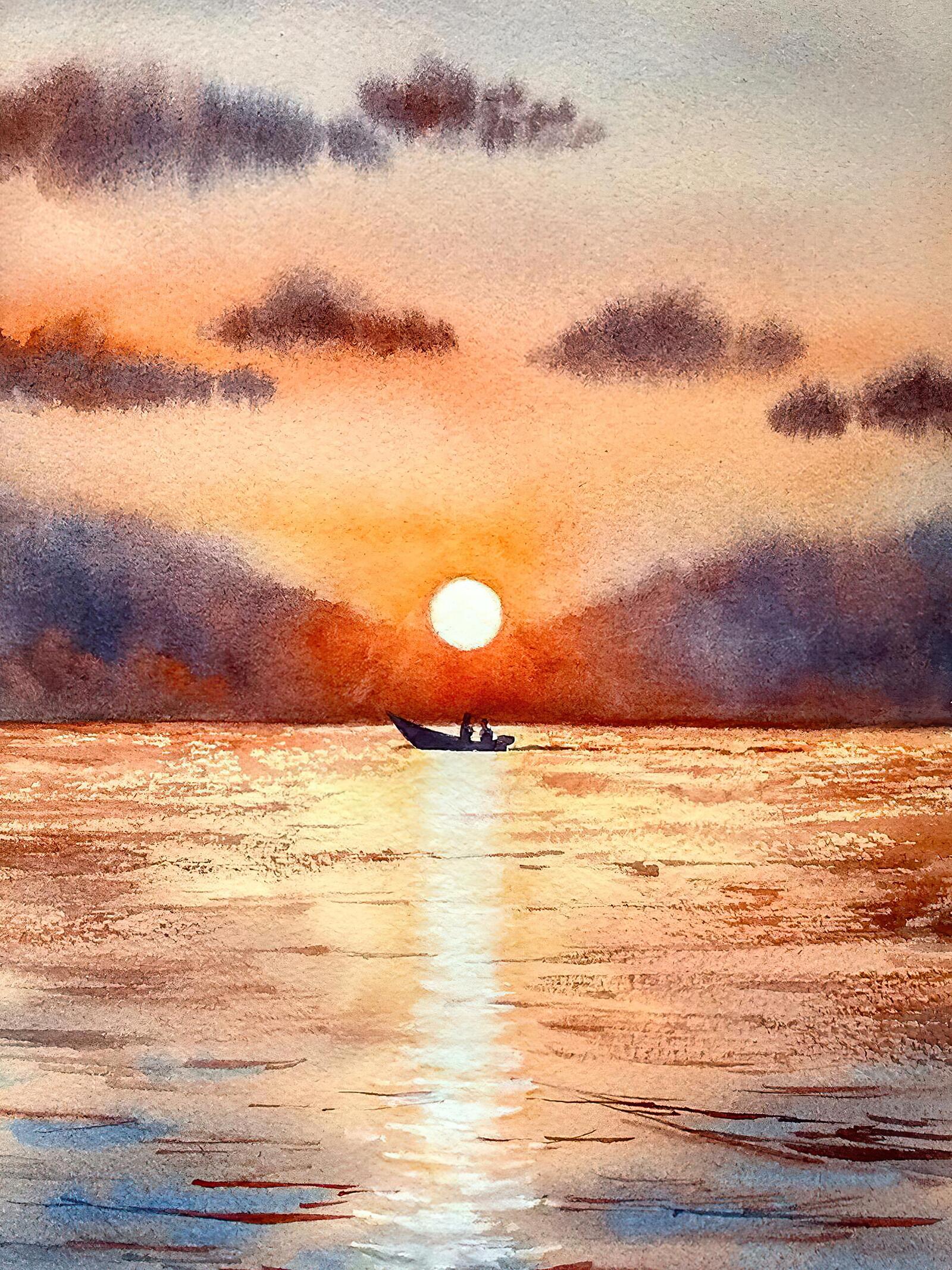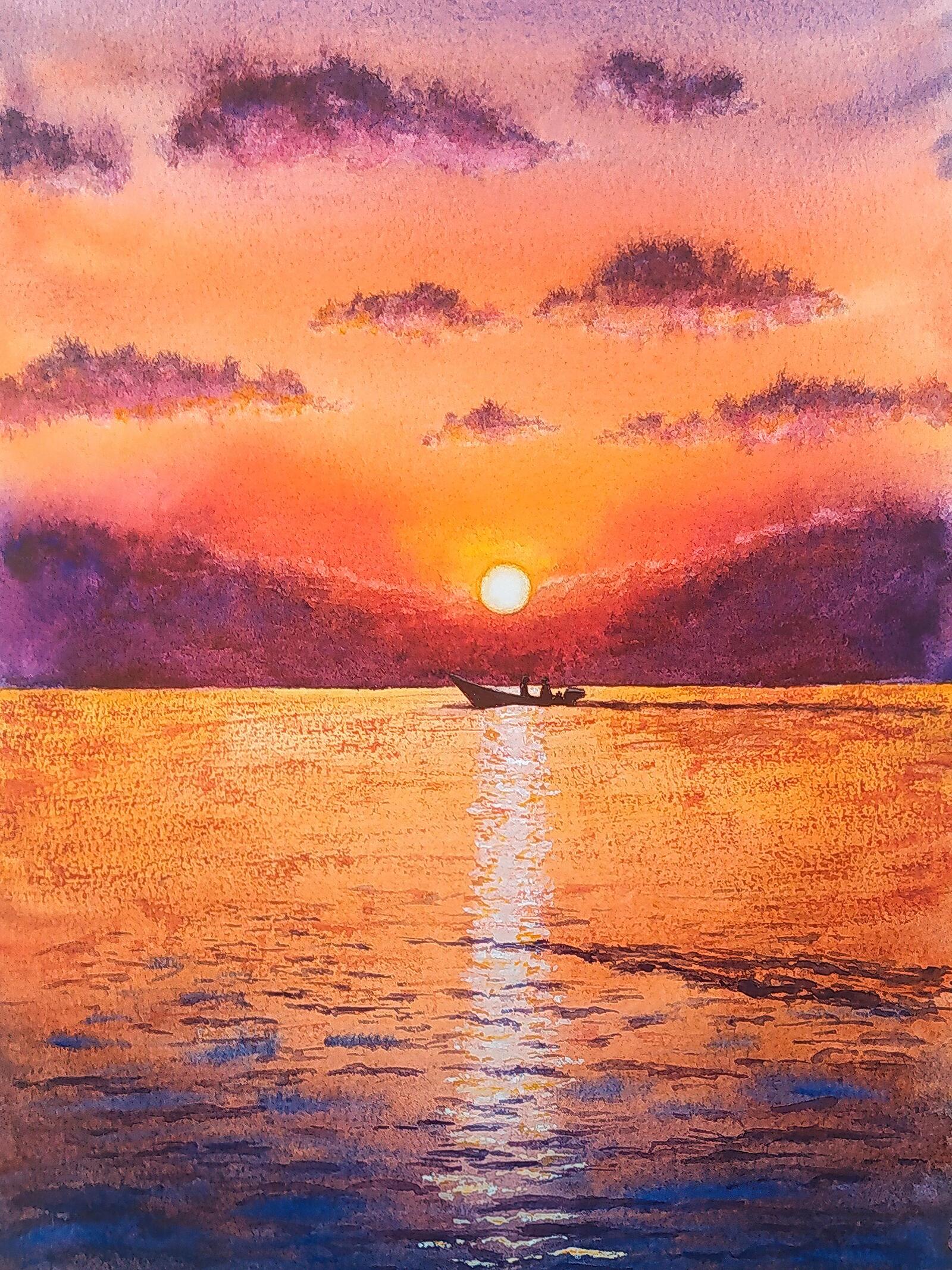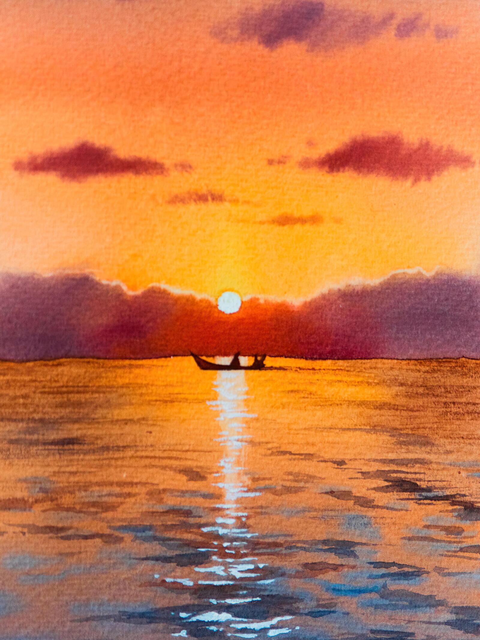 We explore the sunset sky. We create smooth gradients and clouds in wet-on-wet technique;