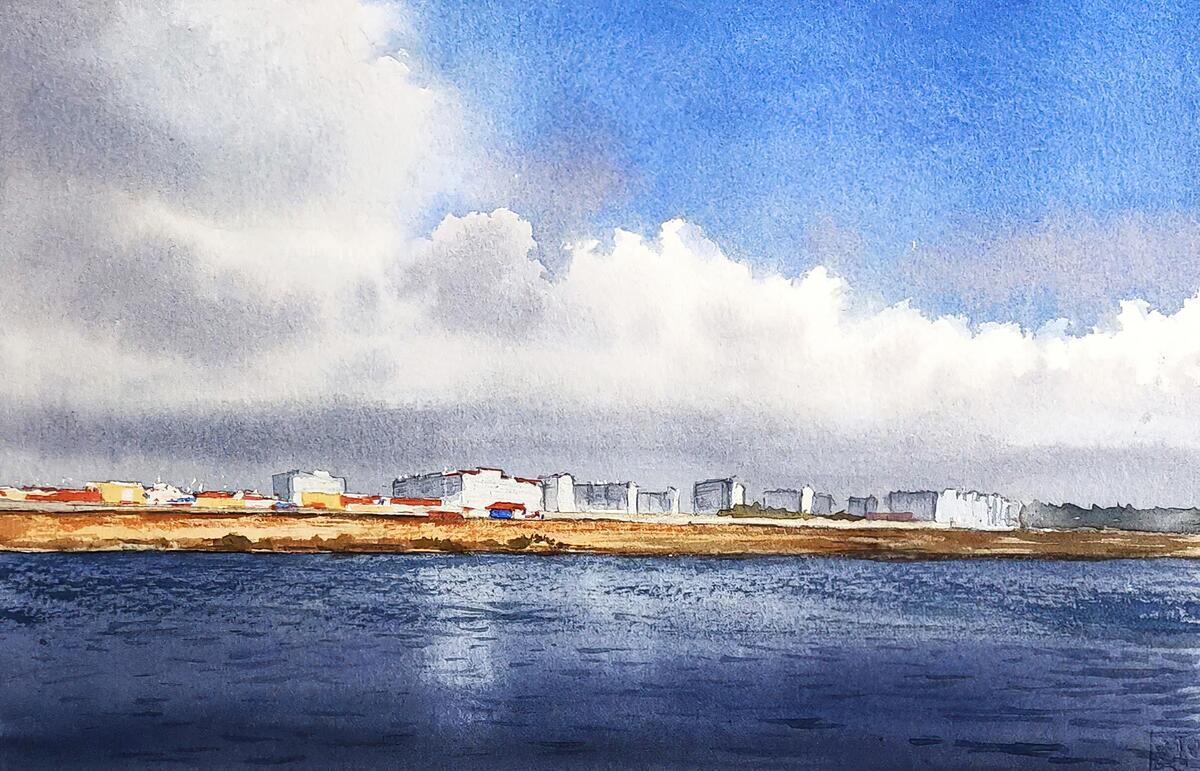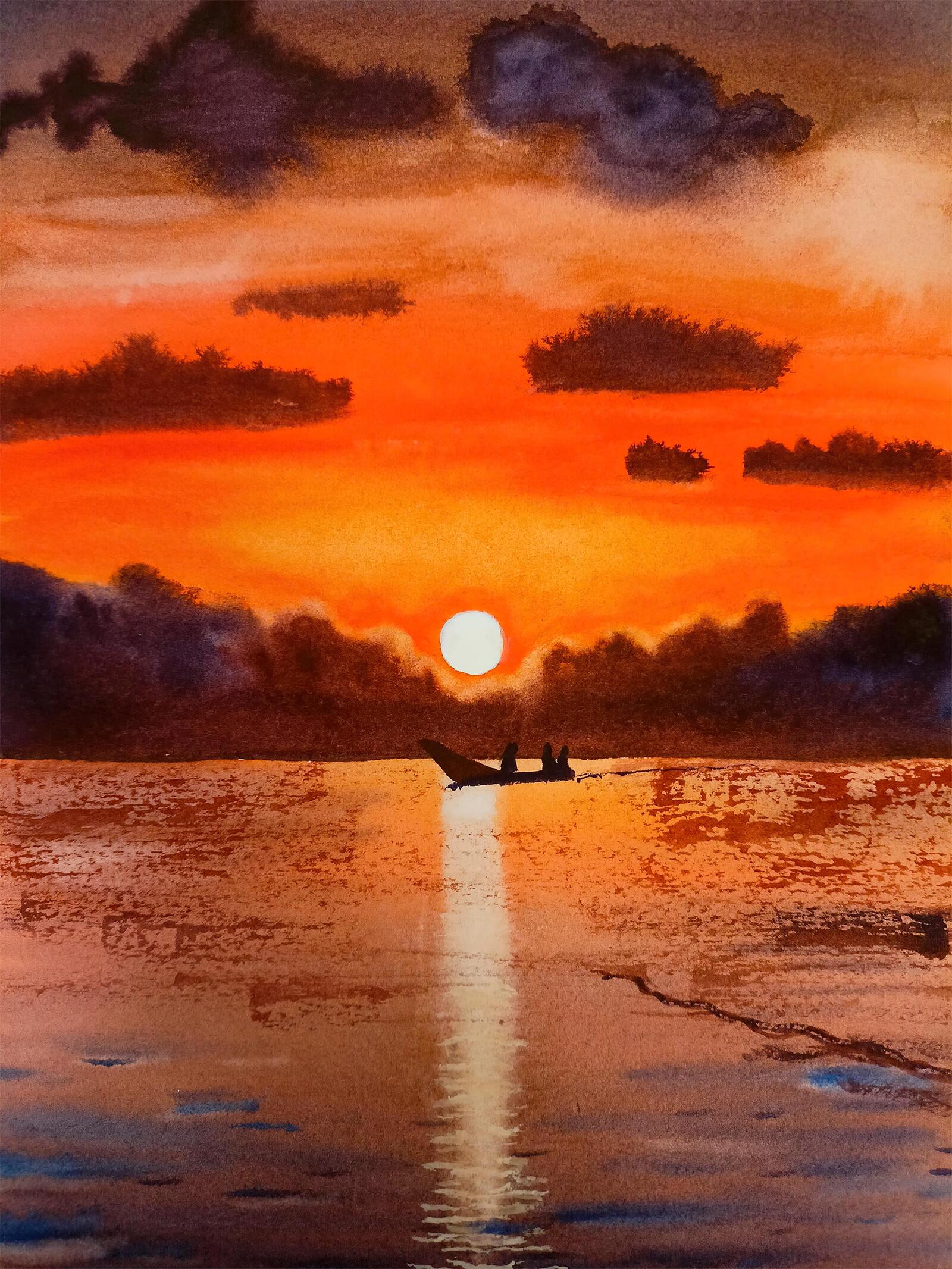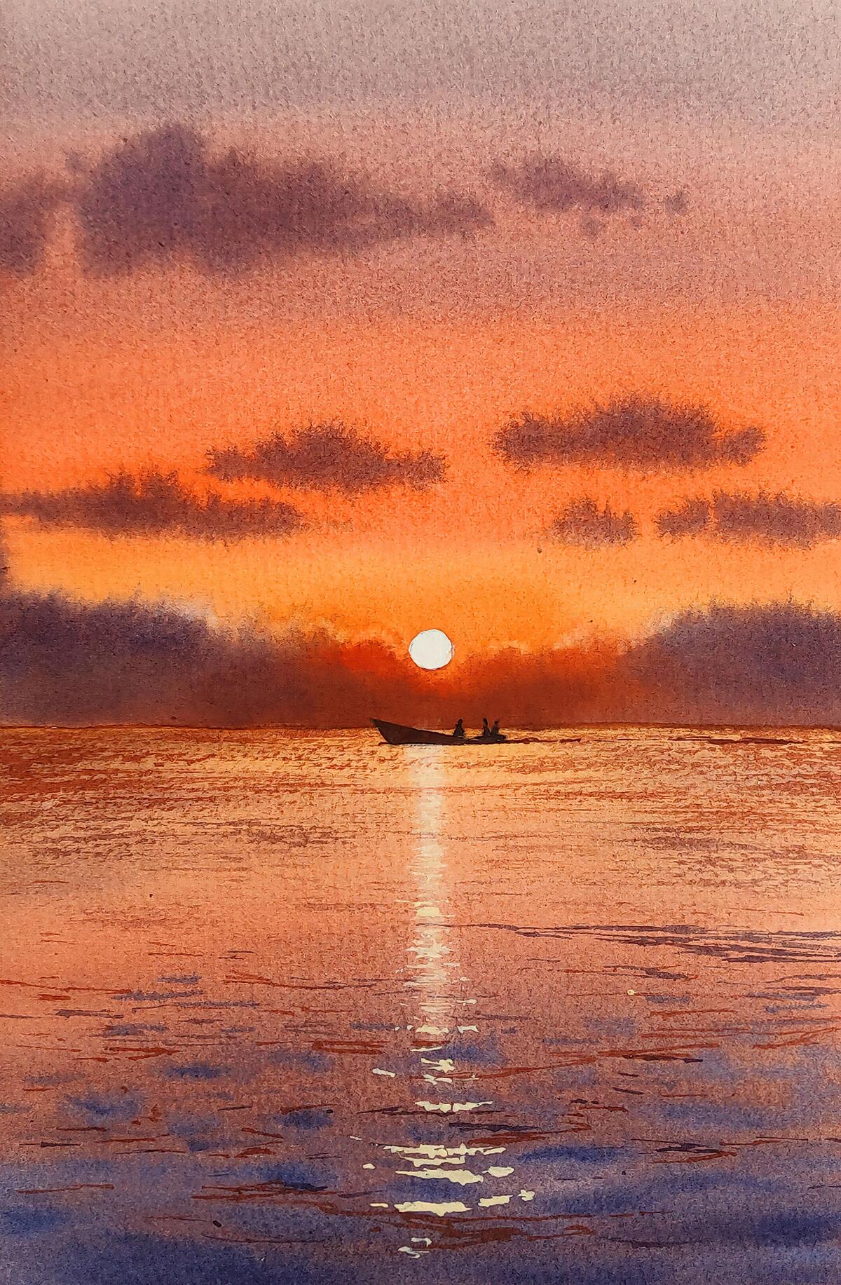We explore the sunset sky. We create smooth gradients and clouds in wet-on-wet technique;